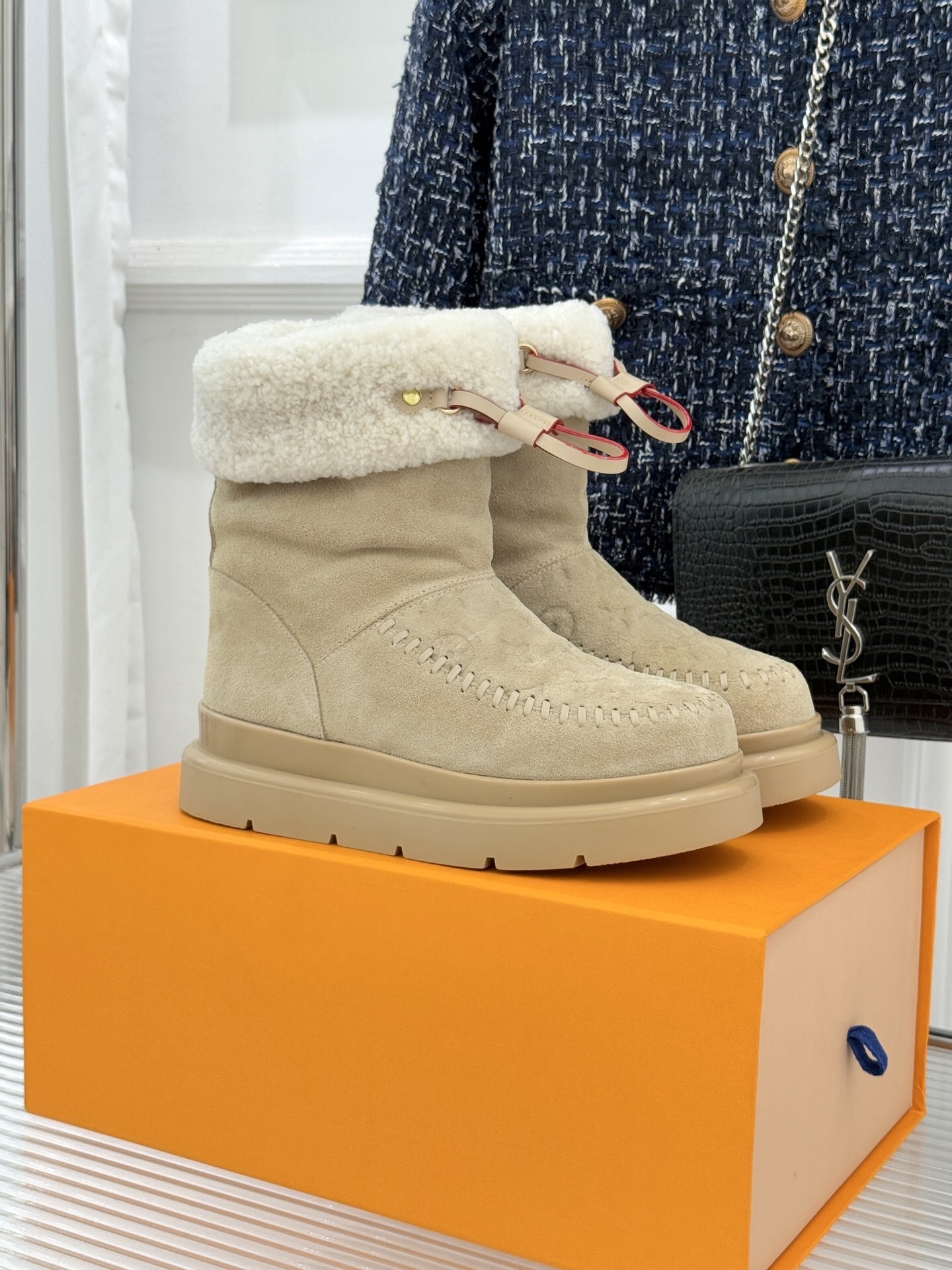 The voluminous grey shearling collar of the Louis Vuitton Grey Suede Monogram Boots ensures a cohesive, tonal aesthetic while providing plush warmth for your ankles. Furthermore, the design incorporates a practical drawstring closure at the top, allowing you to customize the fit to keep out the winter chill. Specifically, the boots sit atop a chunky, charcoal-toned platform sole that offers modern elevation without compromising your stability on slippery surfaces. Ultimately, choosing the Louis Vuitton Grey Suede Monogram Boots means investing in a piece that prioritizes both aesthetic appeal and all-day wearable comfort. Moreover, the high-quality interior lining ensures that the Louis Vuitton Grey Suede Monogram Boots feel as luxurious as they look, making them a must-have for the upcoming season.