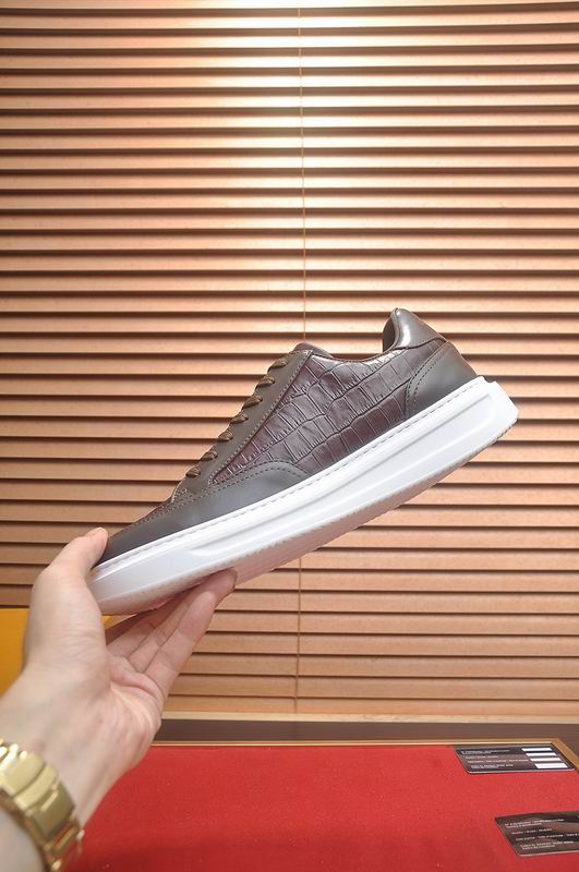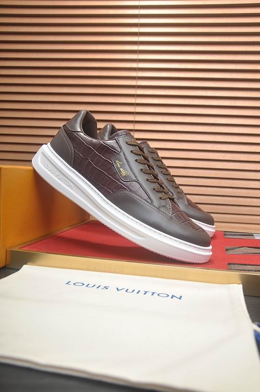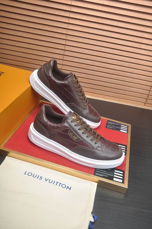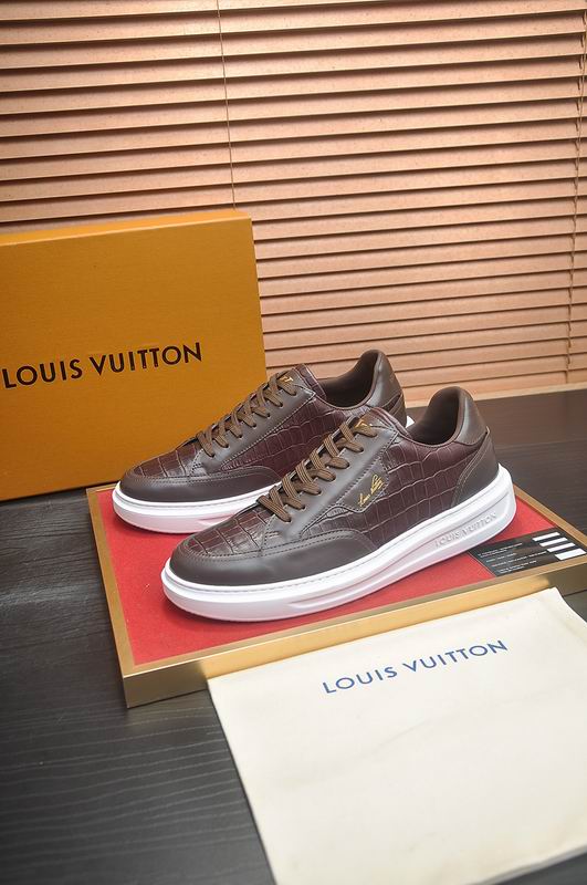 Louis Vuitton Inspired LV Trainer Brown Alligator Embossed White Sole is a supremely elegant sneaker that takes its design cues from the high-end luxury aesthetic of the Louis Vuitton footwear range, specifically models that use exotic materials. The entire upper is crafted from a rich, deep mahogany or espresso brown material, meticulously treated to display a convincing, all-over alligator-skin effect embossing. This texture elevates the classic court-shoe silhouette, adding a layer of undeniable opulence and sophistication. The smooth leather on the padded collar and tongue ensures comfort and a slight material contrast. Further enhancing the luxurious feel are small gold-toned details, including the logo on the tongue and a delicate script logo on the side panel, which provide a beautiful metallic pop against the dark brown backdrop. The deep brown laces perfectly match the upper, creating a seamless, monochromatic look above the sole line. The shoe is grounded by a thick, clean white rubber sole that is slightly flared towards the heel, offering a modern, comfortable, and stable platform. This distinct contrast between the dark, textured upper and the bright white sole is a key feature, making the shoe versatile enough for both smart-casual business settings and high-end weekend wear. Please note: These products are not original Louis Vuitton products. They are high-quality items inspired by the original Louis Vuitton Trainer Sneaker design and are offered as an alternative for customers who appreciate the iconic style and materials.