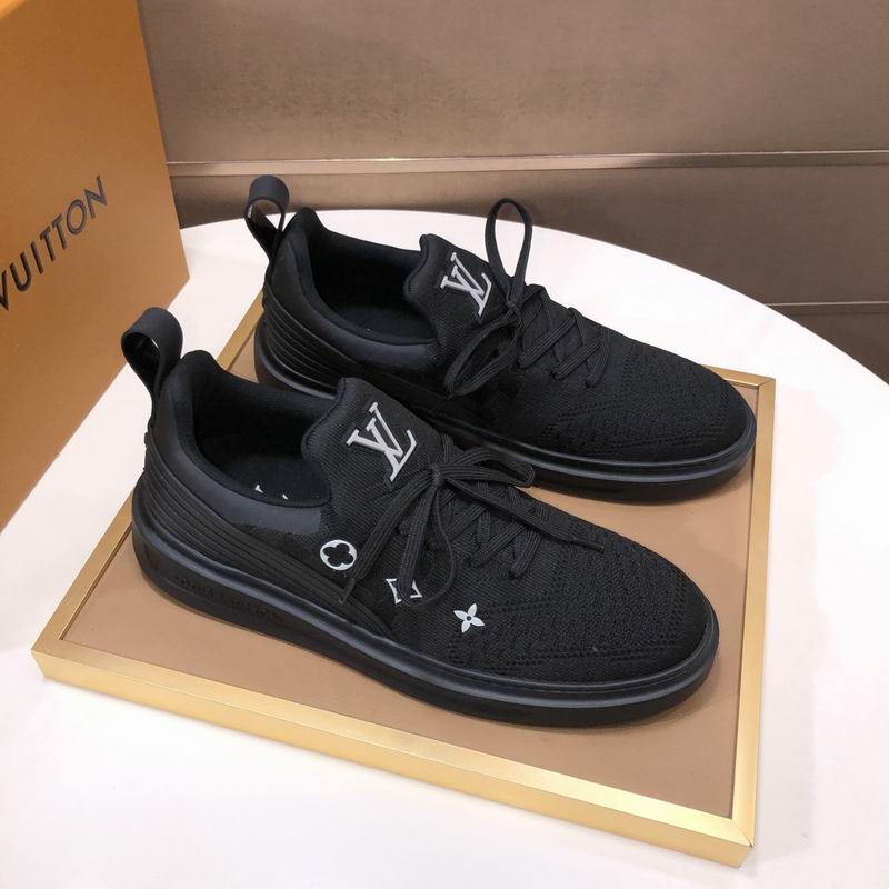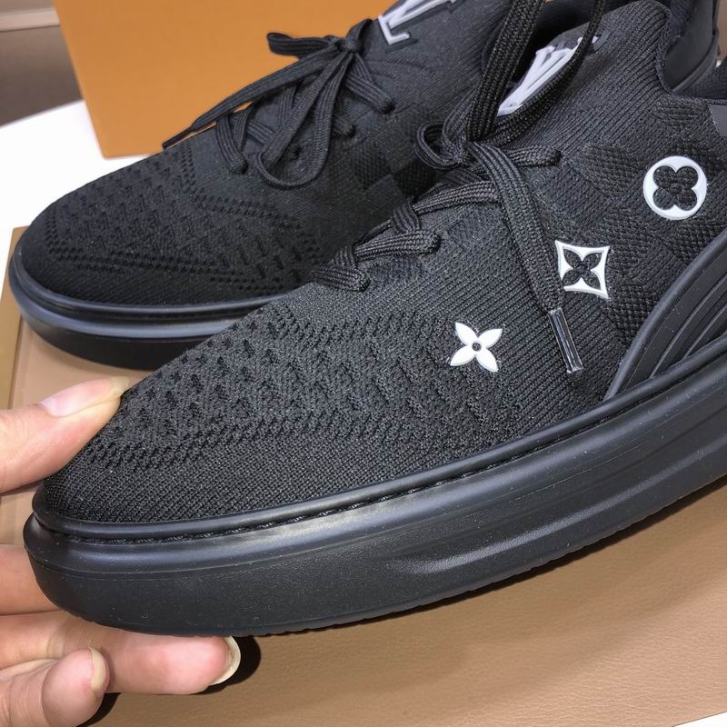 Despite the dark color scheme, the detailing ensures the Louis Vuitton heritage is unmistakable. Small, bright white Monogram symbols—including the LV initials on the tongue and the iconic star and flower motifs on the side panel—are precisely embroidered or printed onto the knit fabric. These white elements provide a sharp, clean contrast that catches the light and emphasizes the luxury provenance of the design. The shoe is supported by a robust, sculpted black rubber sole that provides excellent energy return and grip without adding excessive weight. Features such as the ribbed detailing on the heel counter and the dual pull-tabs at the tongue and heel emphasize its runner-inspired roots, ensuring easy on-and-off. This sneaker is perfect for those who prioritize lightweight comfort and an ultra-modern, understated luxury look. Disclaimer: Please note that these products are not original Louis Vuitton products but are inspired by the original brand’s design and aesthetic.