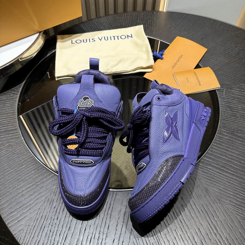 The Louis Vuitton L V Trainer Low Purple/Black offers a profound, rich color story in a modern, chunky athletic silhouette. The entire upper is crafted from high-quality purple tumbled leather, creating a luxurious, textural feel that defines the shoe. The monochrome base is powerfully broken up by a band of black glitter or textured paneling that runs around the base of the toe box and extends towards the mid-sole, adding a high-contrast, edgy element. The side panel features a large, embossed Monogram flower, confirming the design inspiration and adding subtle depth. The lace-up closure is secured by thick, woven purple laces, which match the padded tongue that bears a prominent, stylized L V logo in white and black. The sole is made from a robust, multi-piece construction finished entirely in matching purple, contributing to the shoe’s confident, substantial profile and ensuring comfort. The design cleverly incorporates the inspired luxury branding through embossed “VUITTON” lettering near the eye-stay and additional symbols molded into the rear of the out sole. This trainer is a perfect piece for those who want a deeply colored, unique statement shoe that fuses high-end flair with street-ready durability.