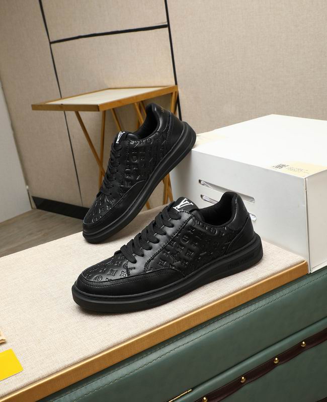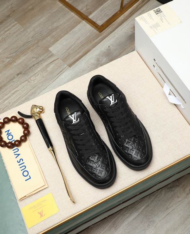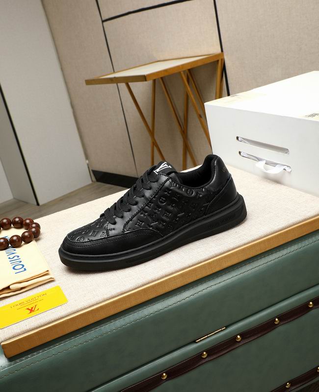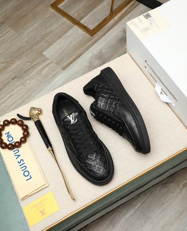 The Louis Vuitton Low-Top Sneaker Black Embossed Monogram Leather offers a modern and understated approach to luxury-inspired footwear, designed for maximum versatility and elegance. The shoe is constructed from a premium black leather-look material, giving it a rich texture and a high-end feel. The defining feature is the all-over embossing of a pattern inspired by the iconic luxury monogram, providing depth and visual interest without sacrificing the sleek, all-black aesthetic. This tone-on-tone detailing allows the sneaker to transition seamlessly from casual day wear to more refined evening ensembles.