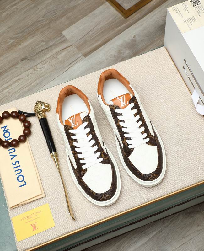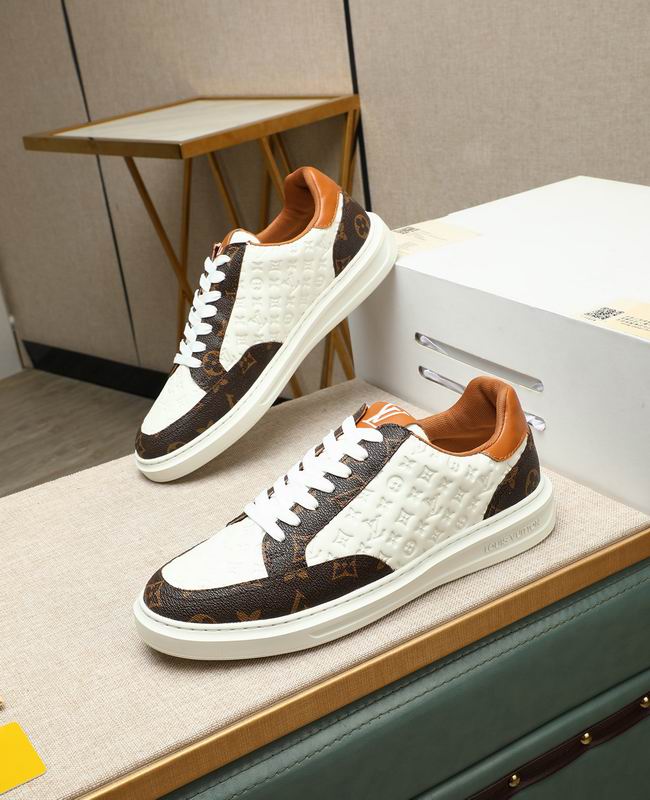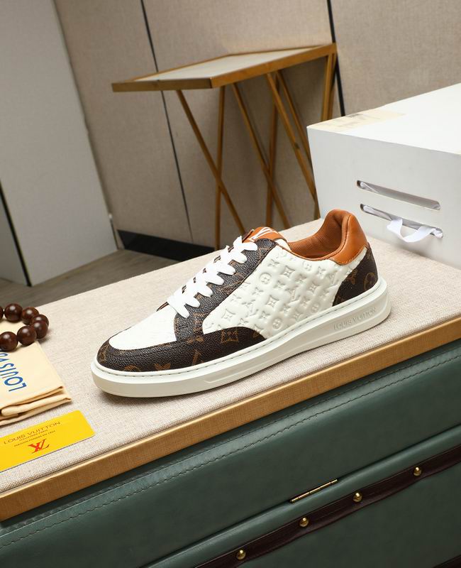The Louis Vuitton Low-Top Sneaker  Classic Brown Monogram and White Leather is a beautifully executed piece of footwear that pays homage to the most recognizable elements of high-end luxury design. The sneaker’s upper is strategically paneled, featuring a dominant crisp white leather-look material embossed with a subtle monogram pattern, which is primarily seen on the side panels and toe cap. This clean white is dramatically contrasted by the rich, dark brown monogram-inspired canvas that wraps around the toe, features prominently on the eyelet stays, and forms the signature tongue and heel accents. The juxtaposition of the bright white and the iconic brown pattern ensures the sneaker is instantly recognized as luxury-inspired.