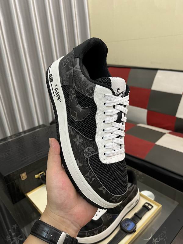 This bold, inspired low-top trainer features a black mesh toe box and mid-panel, contrasted by overlays in a dark grey and black inspired monogram synthetic leather. It is highlighted by white accenting on the tongue, eyes tay, and a prominent black/white panel on the heel, offering a high-impact, custom street wear aesthetic. This unique design merges two iconic looks into one statement piece.