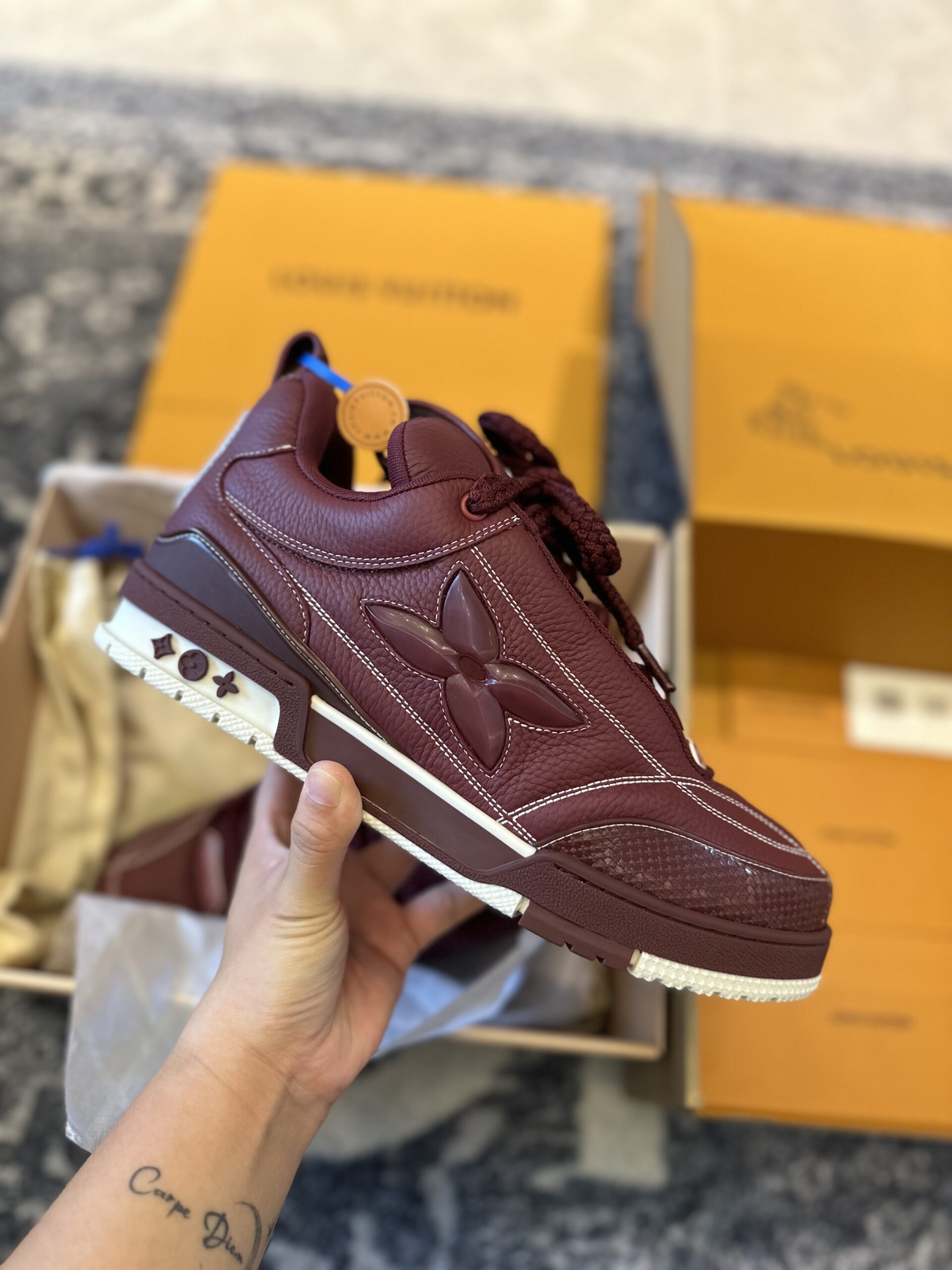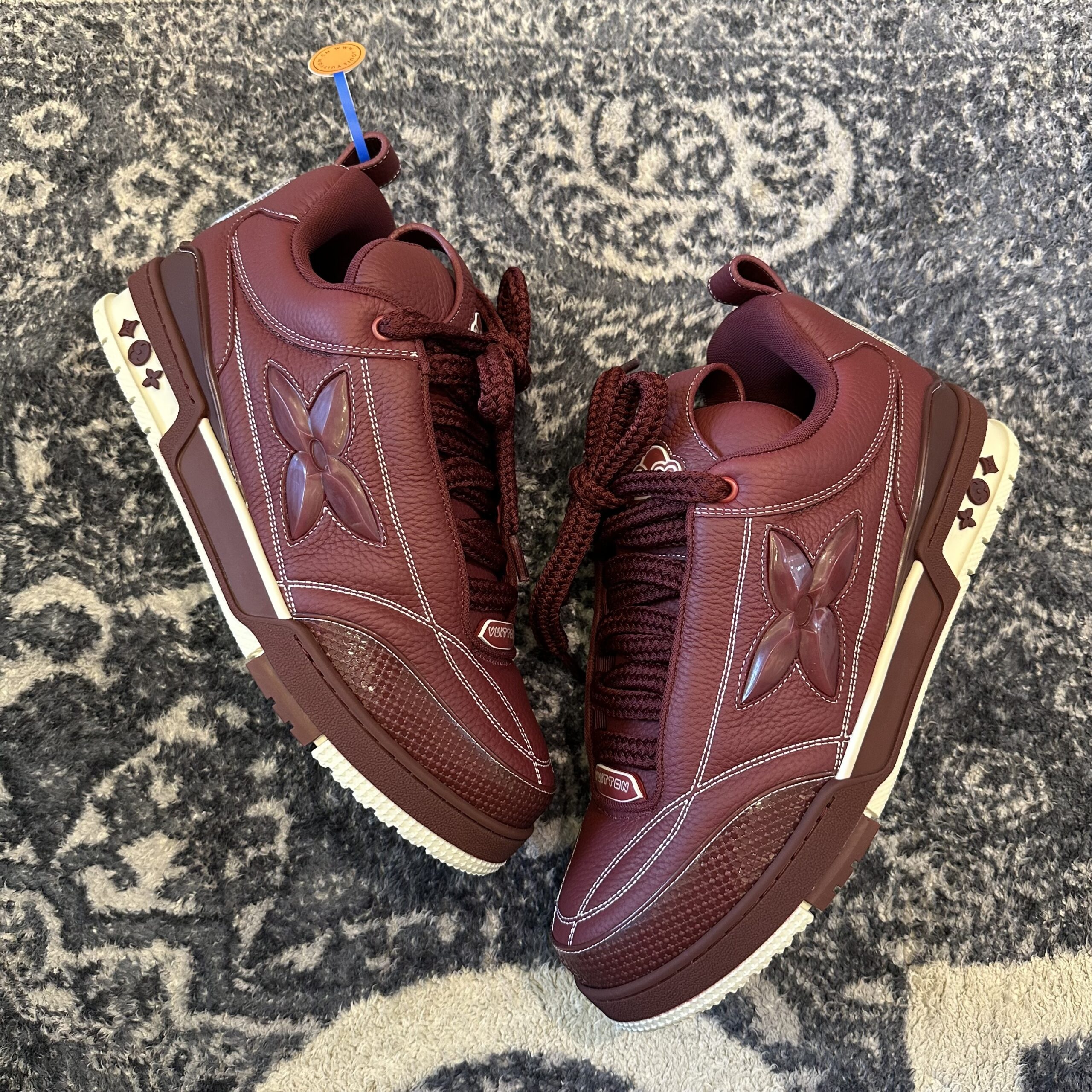 What are the standout branding details on this sneaker? The most prominent feature is the oversized Monogram Flower on the lateral side, rendered in a matching burgundy rubberised finish that adds a tactile, 3-dimensional element to the design. Additionally, the tongue features a vintage-inspired “LV” script logo, while the heel and chunky bicolour outsole are adorned with smaller Monogram Flowers, ensuring the brand’s identity is visible from every angle.