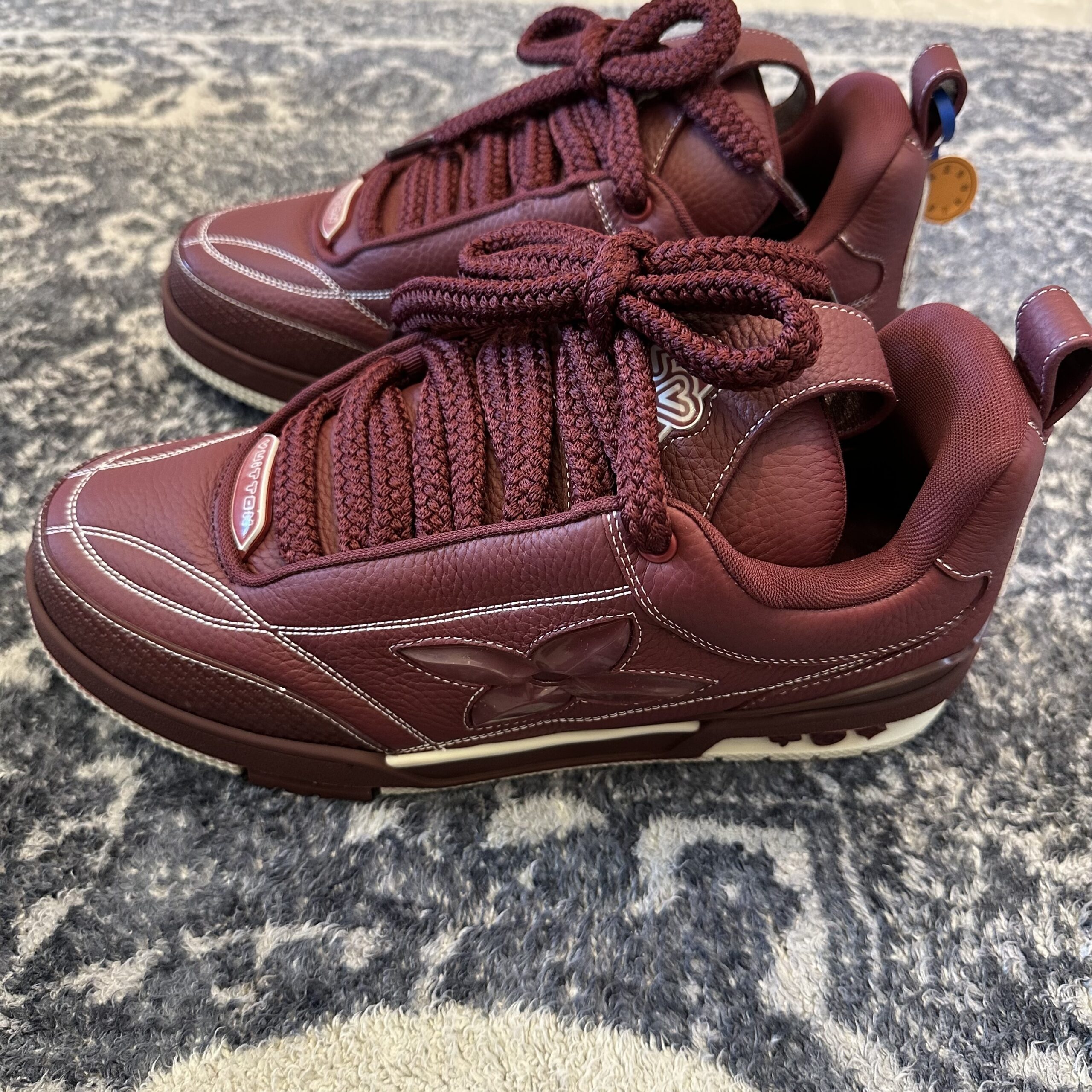 What is the best way to style these chunky trainers? To balance the bold proportions of the Burgundy LV Skate Sneaker, they are best paired with wide-leg trousers, oversized hoodies, or relaxed-fit cargo pants. The rich burgundy tone acts as a sophisticated alternative to black or navy, making it easy to integrate into a streetwear-focused wardrobe while maintaining a luxurious feel.