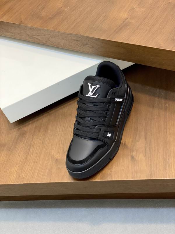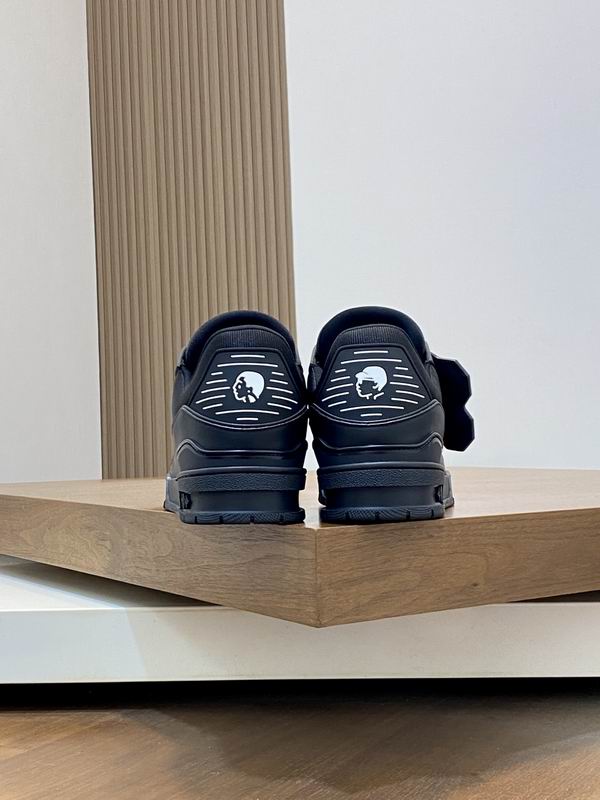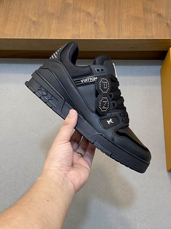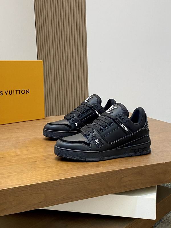 The Louis Vuitton LV Trainer Sneaker (Triple Black) is a striking tribute to one of the most coveted luxury sneaker designs in contemporary fashion. This low-top silhouette captures the essential characteristics of the original design, offering a bold and instantly recognizable aesthetic. Crafted with meticulous attention to detail, the upper features a combination of high-quality materials, with matte leather panels contrasted beautifully by subtle glossy accents around the toe box and heel. The tonal black laces and out sole complete the ‘Triple Black’ execution, creating a sleek, versatile, and monochrome look that pairs effortlessly with any high-end or casual wardrobe. Distinctive design cues, such as the prominent logo detailing on the tongue and the side branding, are faithfully incorporated, allowing the wearer to embrace the essence of luxury street style without compromise. The construction prioritizes both style and durability, ensuring that these sneakers can stand up to daily wear while maintaining their sophisticated appeal. The padded collar and cushioned insole are designed to provide a comfortable fit, making these an excellent choice for navigating the urban landscape in style. These sneakers are for the fashion-conscious individual who appreciates iconic design and premium quality at an accessible price point.