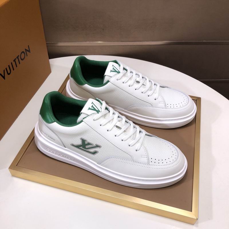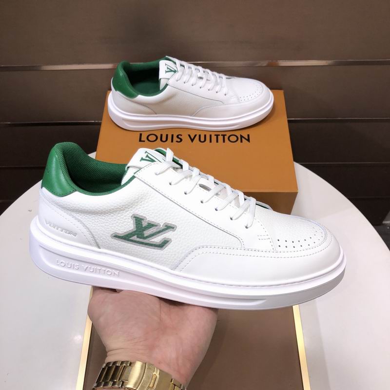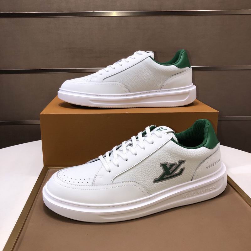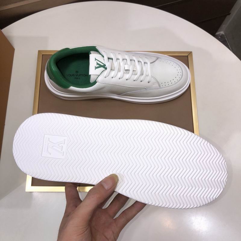 Elevate your street style with this low-top design featuring a crisp white leather-look upper and bold racing green accents on the heel tab and lining. These shoes boast a clean, retro silhouette, complemented by a substantial white rubber-look out sole and subtle perforations for a breathable feel. A distinctive “LV” inspired emblem is prominently featured on the side, adding a touch of inspired luxury to this versatile sneaker.