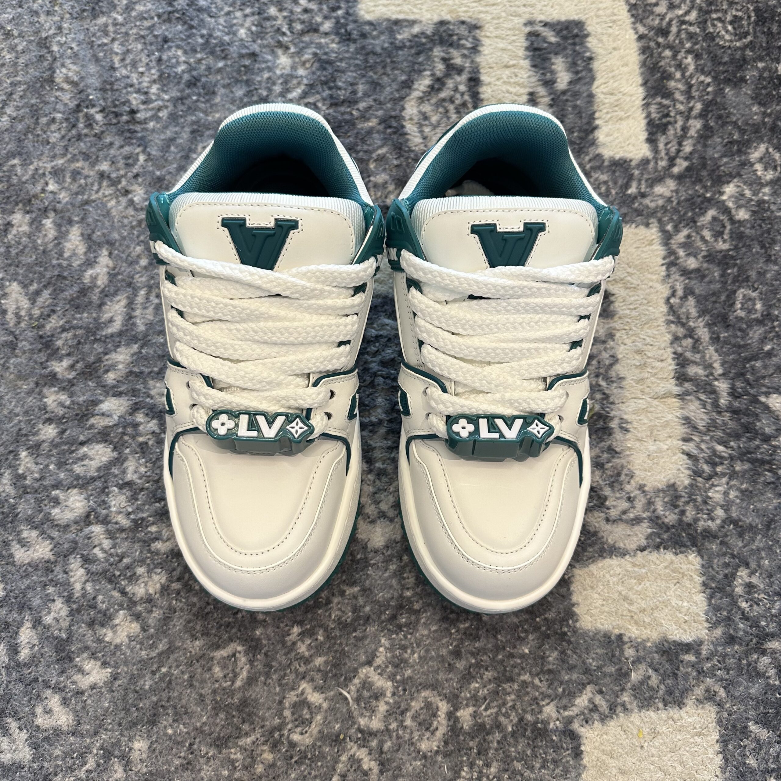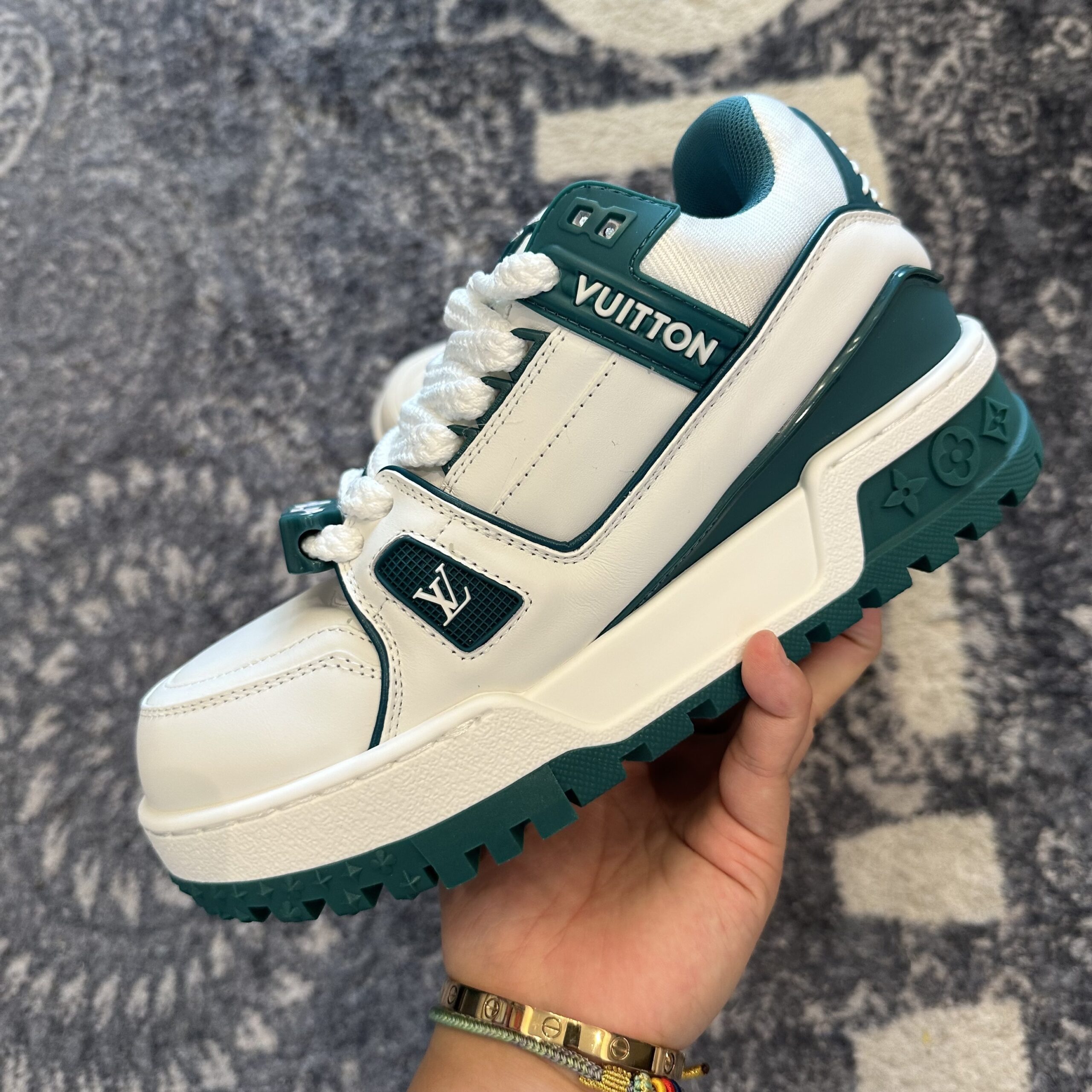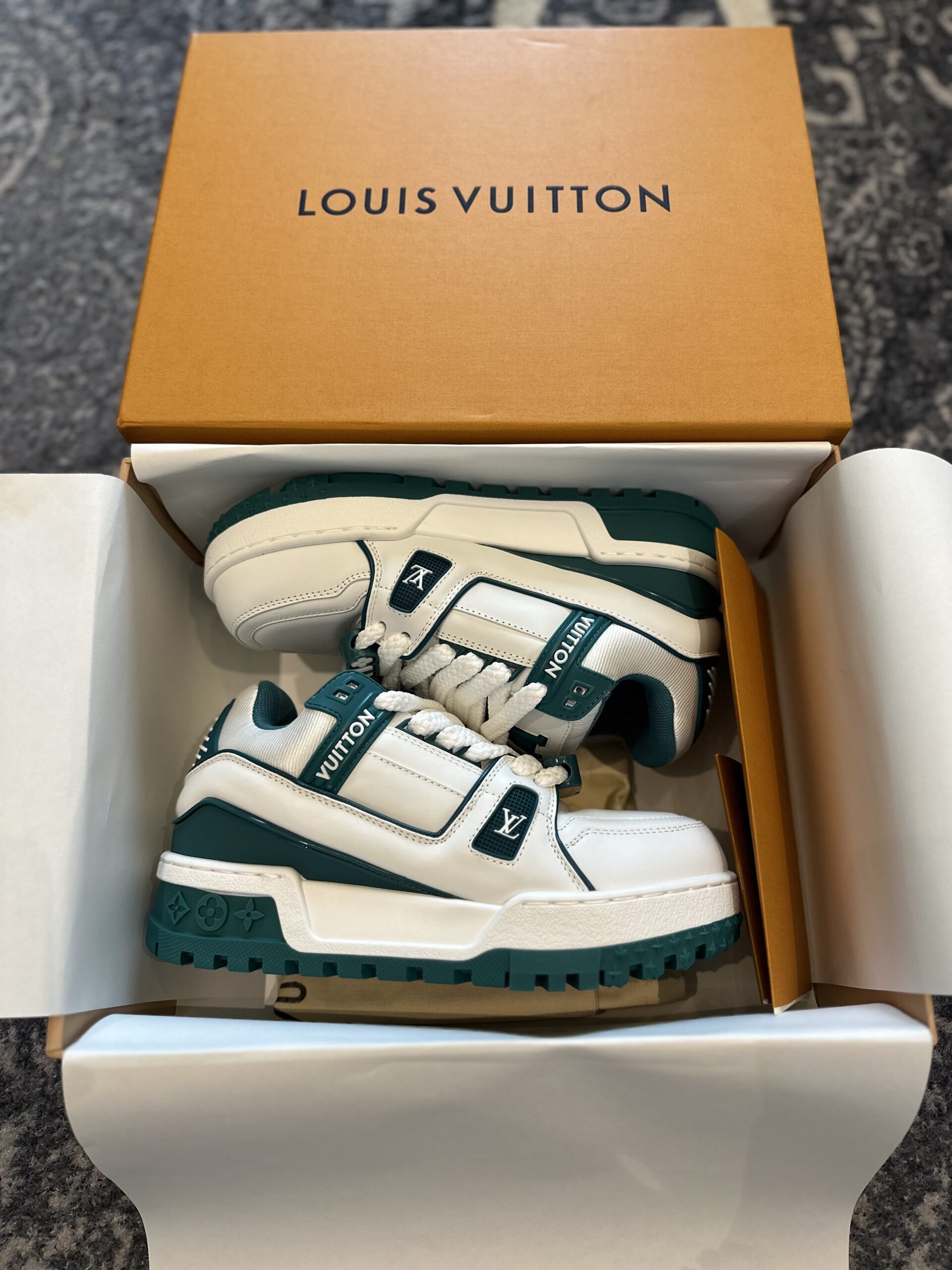 Louis Vuitton Maxi Trainer Marine White Green is a bold, oversized reimagining of the classic cult-favorite trainer, designed to capture the “chunky” aesthetic that has dominated high-fashion streetwear. These sneakers feature an exceptionally thick, lugged rubber outsole that provides a significant lift and a commanding presence. The upper is crafted from a mix of smooth and grained leather in a crisp white, contrasted sharply by deep marine green accents on the collar, tongue, and technical piping. Notable design elements include the oversized “LV” lace charms and the “Vuitton” signature prominently embossed on the side. The Monogram Flowers are also deeply debossed into the midsole, staying true to the house’s heritage of intricate detailing.