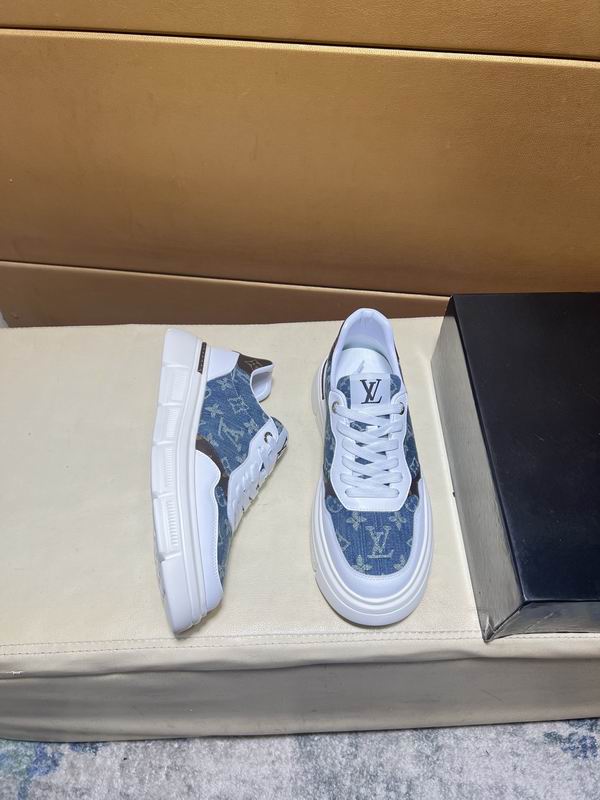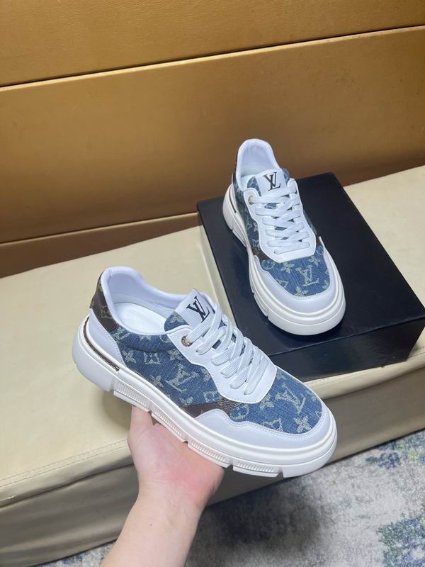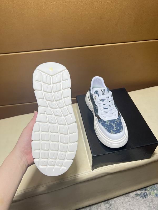 Louis Vuitton Monogram Denim Low-Top Sneaker Blue/White offers a fresh, textured take on the modern chunky sneaker trend. The construction prominently features a textured material that mimics blue denim, which is richly decorated with a repeating monogram pattern, giving the shoe a distinctly casual yet high-fashion feel. This blue patterned material is complemented by crisp white sections, including the main lace placket, the tongue, and the interior lining, ensuring a clean, bright contrast. Darker brown panels, featuring the monogram pattern, are placed on the heel tab, adding another layer of visual interest and structure. The shoe is built upon a substantial, exaggerated white platform sole, which is segmented with deep grooves and a slight ridged pattern, enhancing both its chunky appearance and providing excellent grip and cushioning. A small gold-toned accent piece at the back of the sole adds a subtle touch of hardware detailing. The wide white laces tie the look together, reinforcing the clean, athletic appeal of the design. This style is perfect for making a statement, pairing exceptionally well with distressed denim, light trousers, or casual skirts and dresses, offering an elevated and comfortable option for everyday stylish wear.