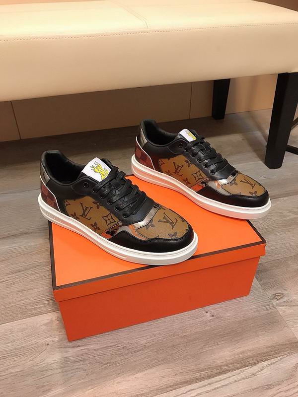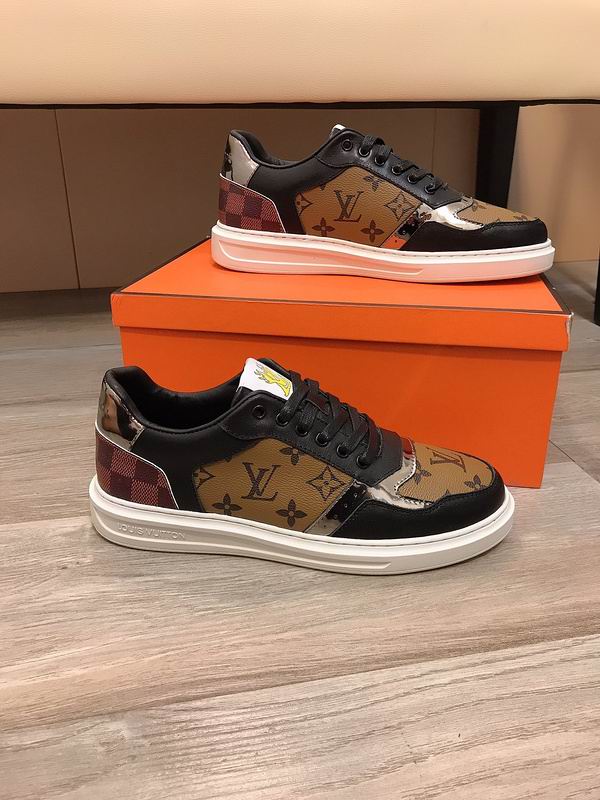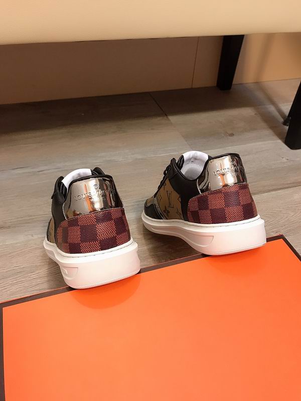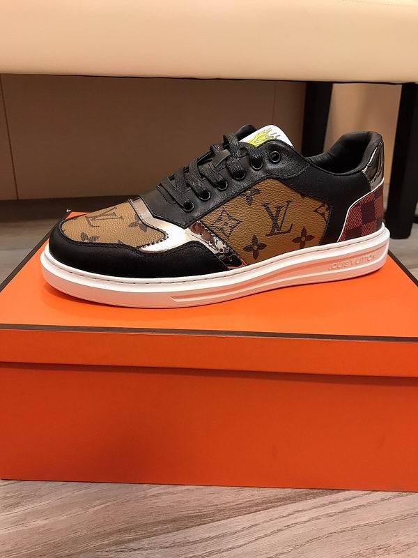 The Louis Vuitton Monogram Eclipse Low Trainer Black/Brown is a distinguished low-top design that masterfully blends classic luxury elements with modern, athletic styling. The upper is constructed from a combination of smooth black leather on the tongue and collar, providing a refined feel, while the toe box and side panels showcase the globally recognizable Monogram canvas in a striking brown and black palette. This sophisticated color scheme is interrupted by a sleek, mirrored metallic strip that adds an unexpected flash of contemporary flair across the vamp. For contrast and all-day wear ability, the sneaker is grounded by a clean white rubber out sole that is debossed with the brand name on the side. The heel counter features a distinct red and black check pattern, adding subtle visual interest and depth to the overall composition. Traditional black laces secure the fit, while a branded logo patch sits atop the tongue, confirming its high-fashion pedigree. This shoe is the ideal statement piece for those looking to inject a dose of high-end, iconic style into their everyday casual wardrobe. It pairs equally well with crisp denim or tailored joggers. The silhouette is reminiscent of classic court shoes, yet the intricate detailing elevates it far beyond the ordinary. The construction promises durability and a comfortable fit, making it a reliable choice for stylish, everyday wear.