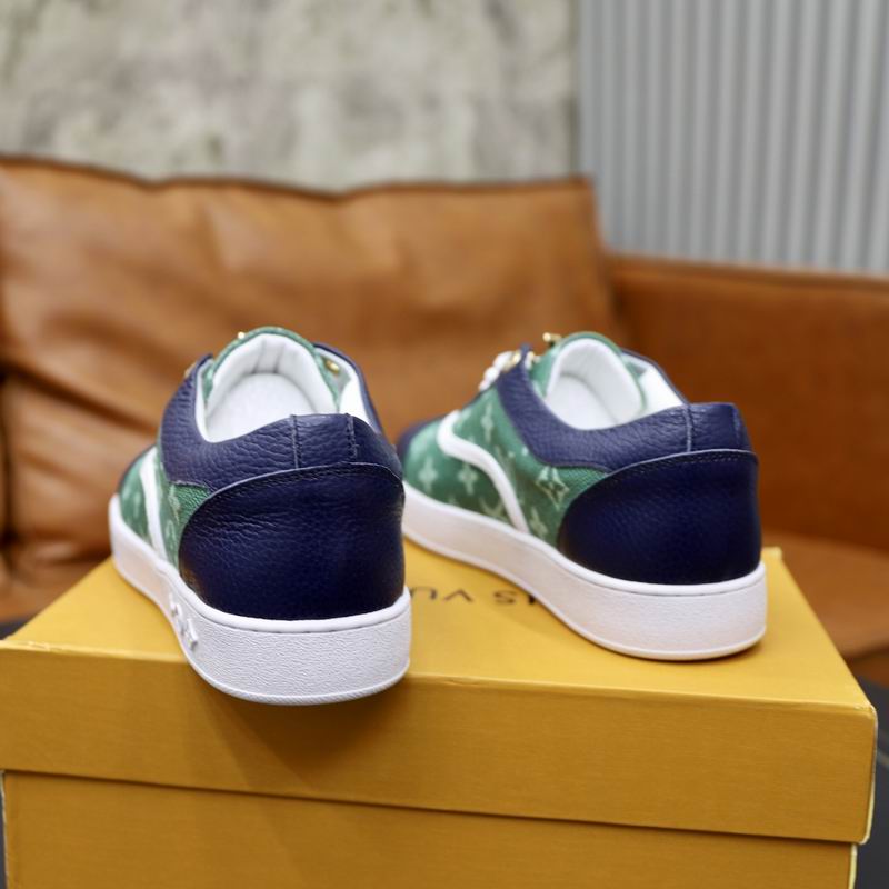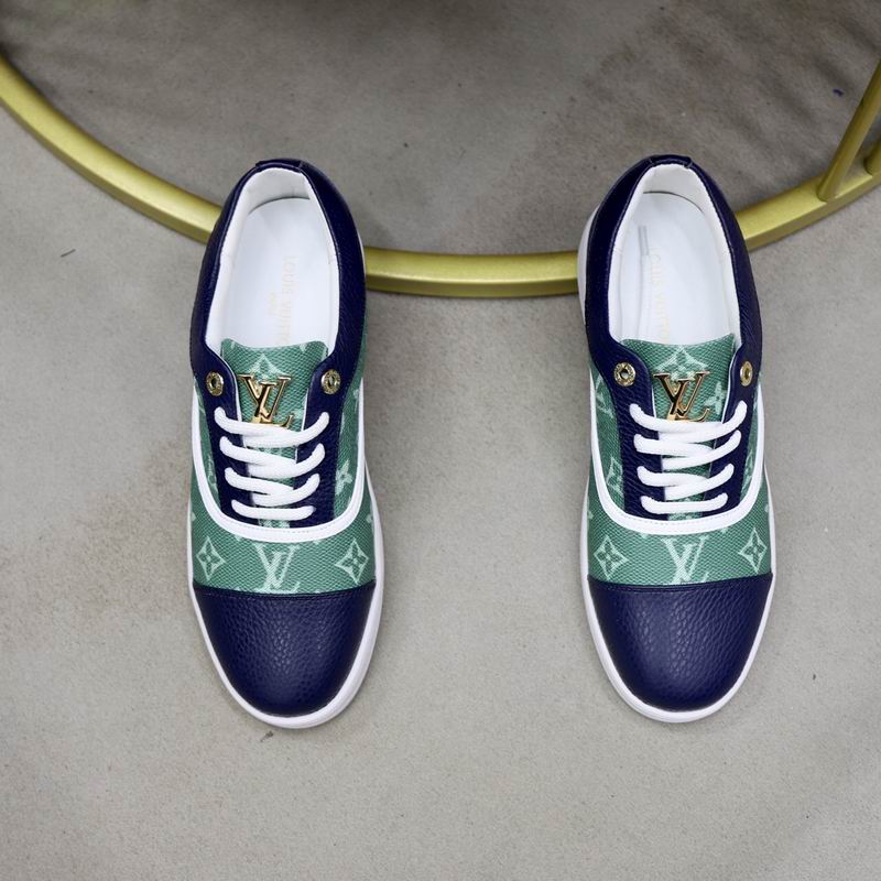 The Louis Vuitton Monogram Low Top Sneaker Green/Navy delivers an immediate statement through its rich color palette and iconic pattern application. The upper is crafted with a meticulous blend of materials, where the toe box, eye-stays, and heel counter are constructed from premium, textured navy blue leather, lending a sophisticated and durable structure. The standout feature is the mid-panel, which utilizes a distinctive green Monogram canvas, featuring the L V initials and floral motifs in a lighter tone, giving the illusion of a subtle gradient or wash. This bold center panel is neatly outlined by crisp white leather piping, which serves to sharply separate the primary colors. The shoe is secured with white laces, which are enhanced by gold-tone hardware on the top eyelets and a prominent, gold-finished L V logo embellishment on the tongue. The entire sneaker is grounded by a traditional, flat white rubber cup sole, offering reliable comfort and a clean finish. The sole is subtly debossed with the brand name near the heel, confirming its high-end inspiration. This elegant, colorful shoe is a perfect choice for those seeking to incorporate luxury pattern work and a unique, deep color combination into their everyday casual rotation.