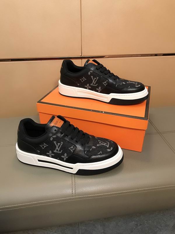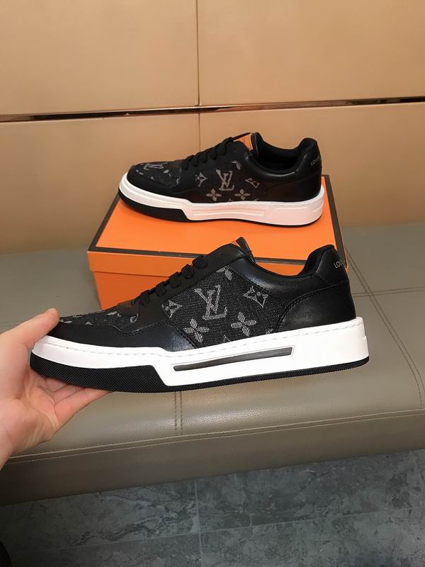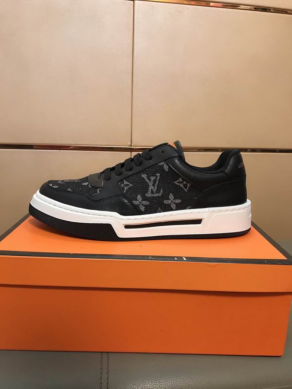 Louis Vuitton Monogram Panel Low-Top Sneaker Black/White is a distinctly modern piece of footwear, designed with high-impact contrasts and structured detailing. The sneaker employs a multi-panel construction, utilizing smooth black material for the main frame, including the heel and eyelet area. This is dynamically contrasted by dark, woven or printed canvas panels featuring a recognizable tone-on-tone monogram pattern, prominently displayed on the side quarter and toe box. The sole unit is the most visually striking element, being thick and robust, offering a bold platform. It features a layered design, combining a clean white mid sole with a black out sole and a black accent line that wraps around the side, giving it a split, architectural look. A very subtle orange accent near the top of the heel adds a tiny unexpected pop of color. The shoe’s overall aesthetic is one of elevated street wear—it takes the recognizable, luxury-inspired pattern and places it into a chunky, athletic-inspired silhouette. This combination ensures the sneaker is both comfortable and a strong fashion statement, pairing well with contemporary urban looks or relaxed weekend attire. The structure and quality of the materials aim to provide durability and a high-end feel at an accessible price point, appealing to those who desire a luxury-inspired statement shoe.