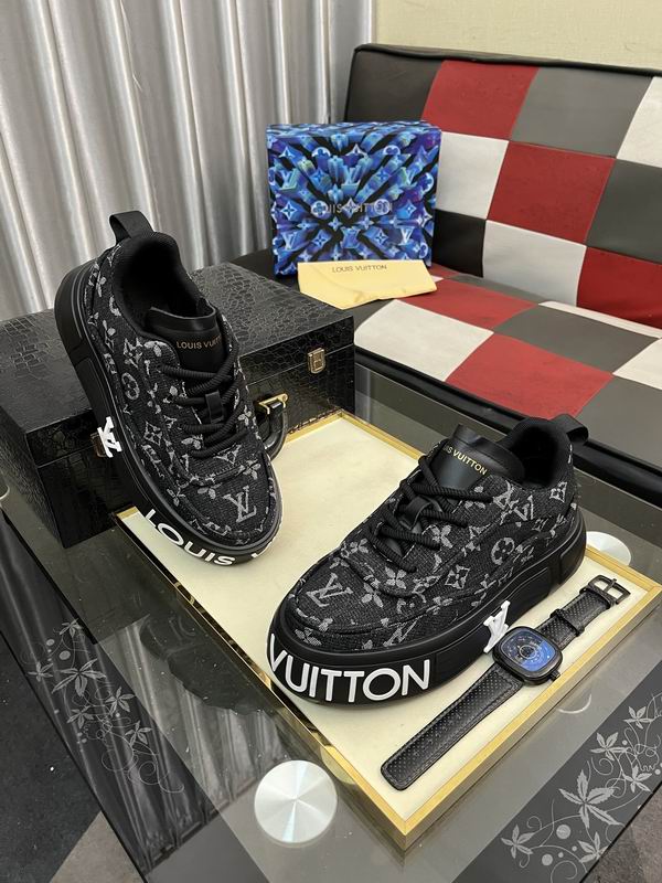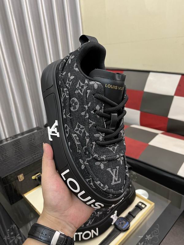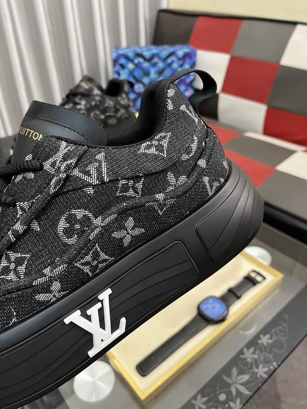 The most distinctive feature is the substantial, sculpted platform sole, rendered entirely in matte black. This chunky construction not only provides a contemporary, fashion-forward lift but also ensures a stable and comfortable foundation for all-day wear. The sole is dramatically highlighted by large, bold white “LOUIS VUITTON” text running across the side, making the brand name an integral part of the shoe’s aesthetic and contributing to its confident, logocentric appeal. Additional branding is subtly placed on the tongue and the heel tab, maintaining a polished finish. The design is completed with black waxed laces and premium leather detailing around the collar and tongue, ensuring a secure fit and durable construction. This sneaker is the perfect choice for those seeking an impactful blend of classic luxury motifs and modern, oversized sneaker trends. Disclaimer: Please note that these products are not original Louis Vuitton products but are inspired by the original brand’s design and aesthetic.