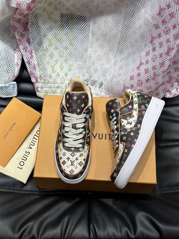 The Louis Vuitton Monogram Trainer Low Brown/Multicolor is a masterpiece of pattern and color, taking the familiar Monogram canvas and transforming it with a kaleidoscope of hues. The entire shoe upper, including the toe box, mid-panels, and heel, is crafted from the signature brown Monogram material. This heritage pattern is then dynamically printed with a smaller-scale multi color Monogram overlay, featuring the recognizable L V initials and floral motifs in bright shades of pink, blue, green, and yellow, giving the sneaker an energetic, playful vibe. The lace closure utilizes thick, flat white laces that stand out against the patterned surface and lead up to a branded tongue tag. The structured design is completed by a substantial, flat white rubber cup sole, which provides a clean, neutral foundation that allows the colorful upper to truly pop. The shoe maintains a classic court silhouette, making it versatile for pairing with various casual outfits, from jeans to modern athleisure wear. The combination of established luxury patterning with the vibrant, pop-art color treatment makes this model highly sought after and instantly recognizable.