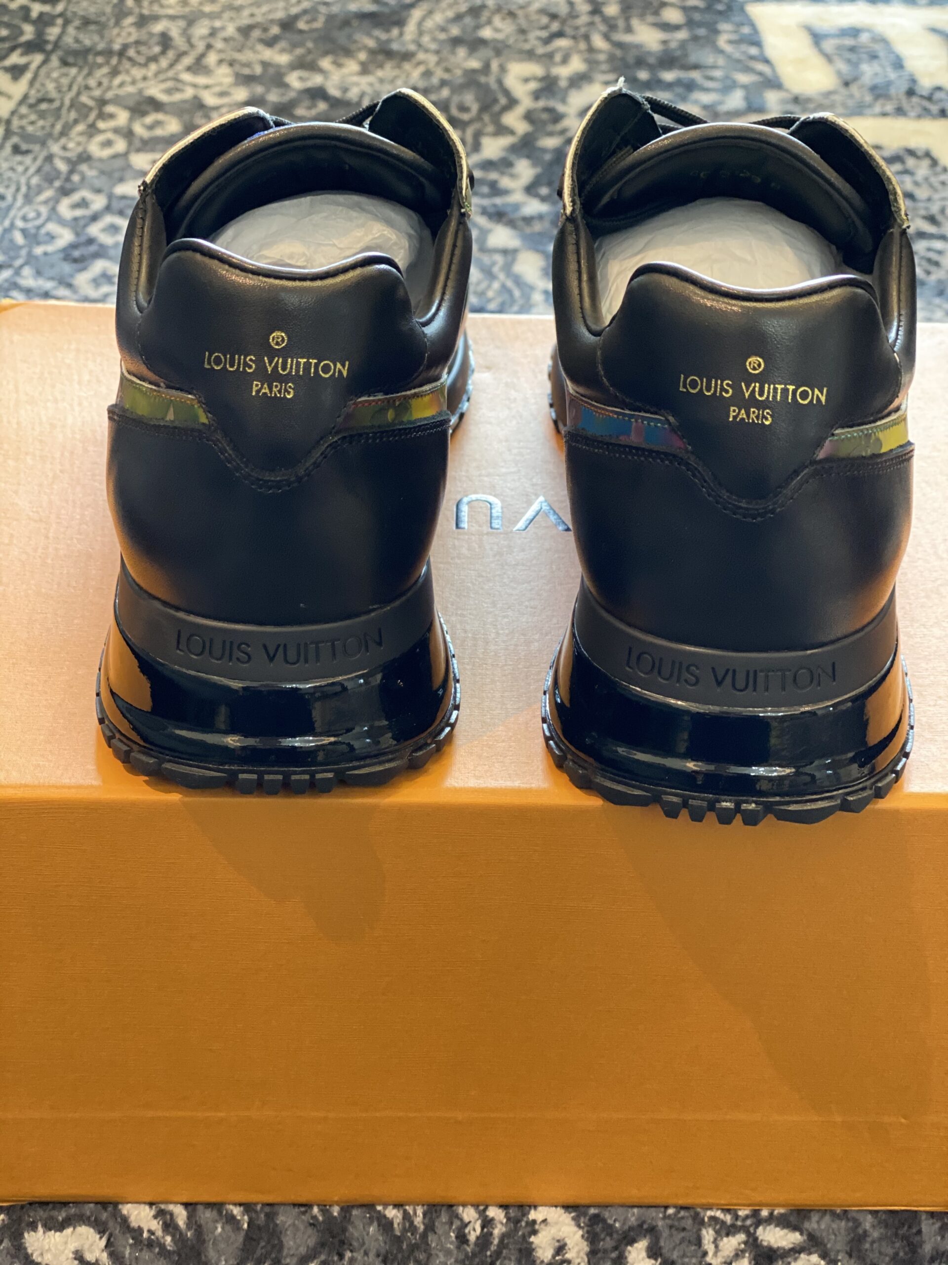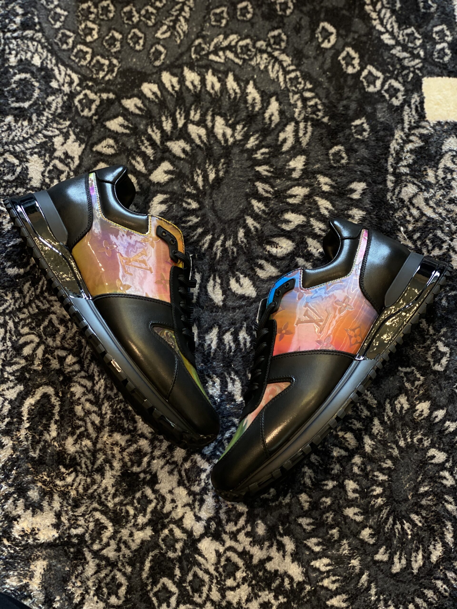 The Louis Vuitton Run Away Black Multicolour SneakerĀ  features a black calf leather upper with striking iridescent Monogram panels. It includes a hidden wedge for subtle elevation and a technical rubber outsole for superior comfort. The design is finished with gradient branding on the tongue and a refined metallic trim.