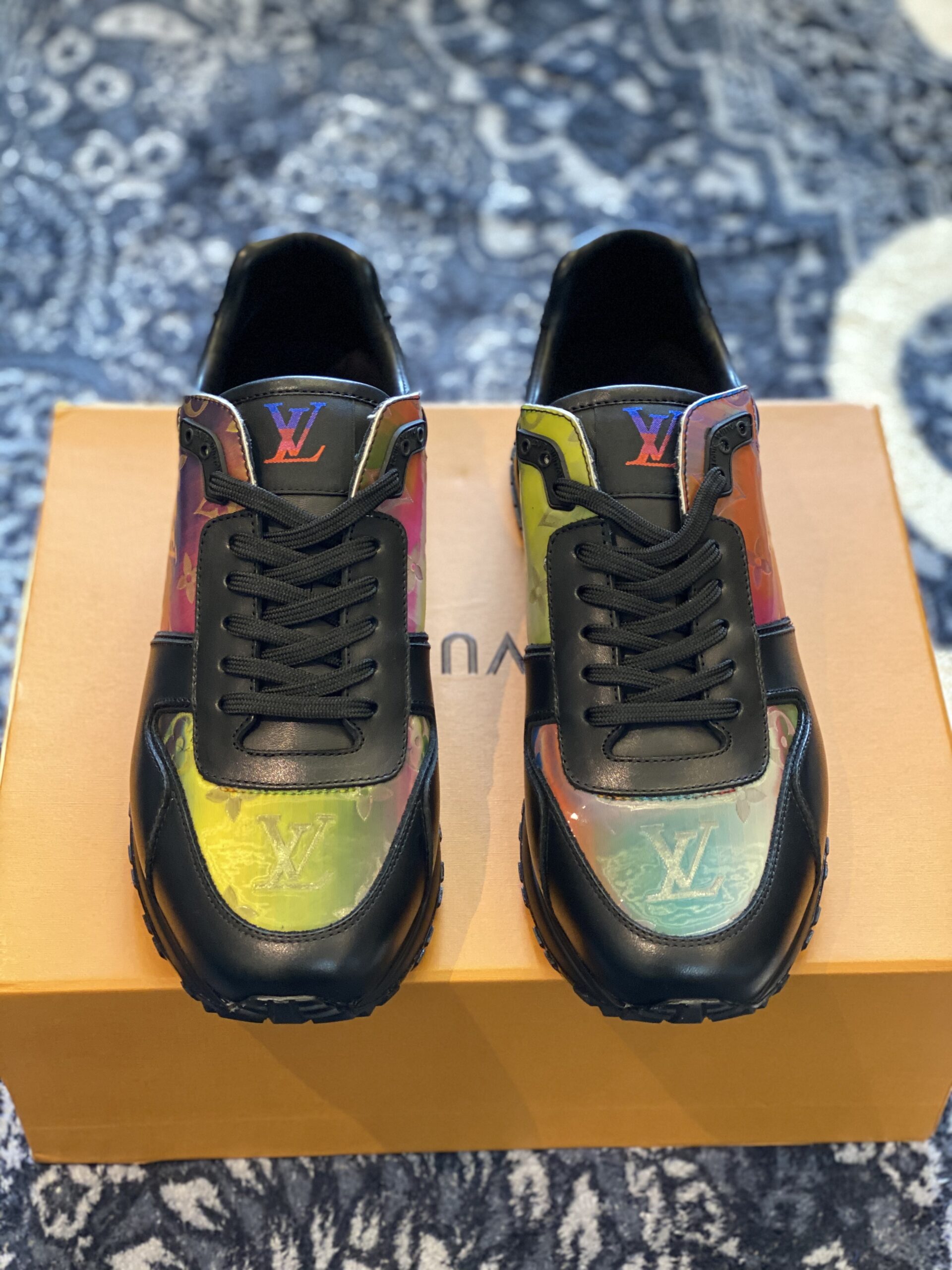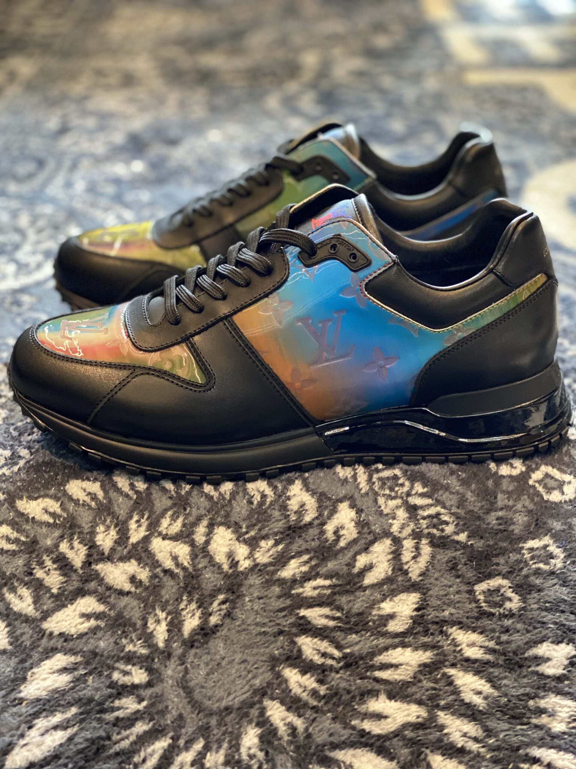 The Louis Vuitton Run Away Black Multicolour SneakerĀ  is a vibrant reinterpretation of the classic running shoe, blending athletic performance with high-fashion sensibilities. Disclaimer: These products are not original but were inspired by the original brand. This model features a sleek black leather base that serves as a canvas for the striking iridescent, multicoloured panels adorned with the iconic Monogram motif. By using British craftsmanship standards, the design prioritises a luxurious feel while ensuring the sneaker remains lightweight and functional for daily use.