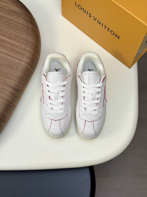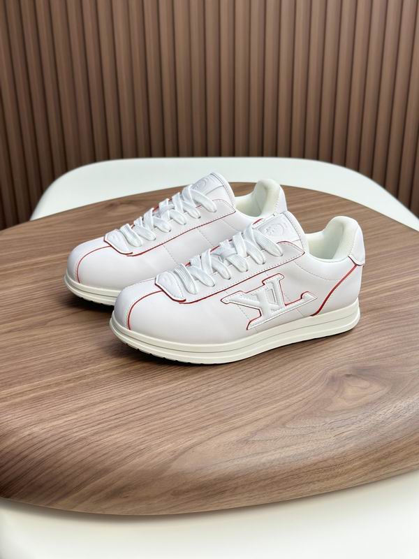 Louis Vuitton Run Away Sneaker White Leather Red Piping presents a sleek and understated design that champions luxurious simplicity and refined detailing. This low-top sneaker is meticulously crafted with a predominantly white leather upper, providing a clean canvas that makes it a highly adaptable piece for any contemporary wardrobe. The design takes strong inspiration from the elegance and athletic lines of the original Louis Vuitton Run Away silhouette, offering a premium look without the high-fashion price tag. The key design feature is the subtle yet impactful use of red piping, which traces the structural lines and seams of the shoe. This fine red trim provides a perfect, crisp contrast against the smooth white leather, highlighting the shoe’s classic athletic paneling and adding a dynamic, contemporary edge.