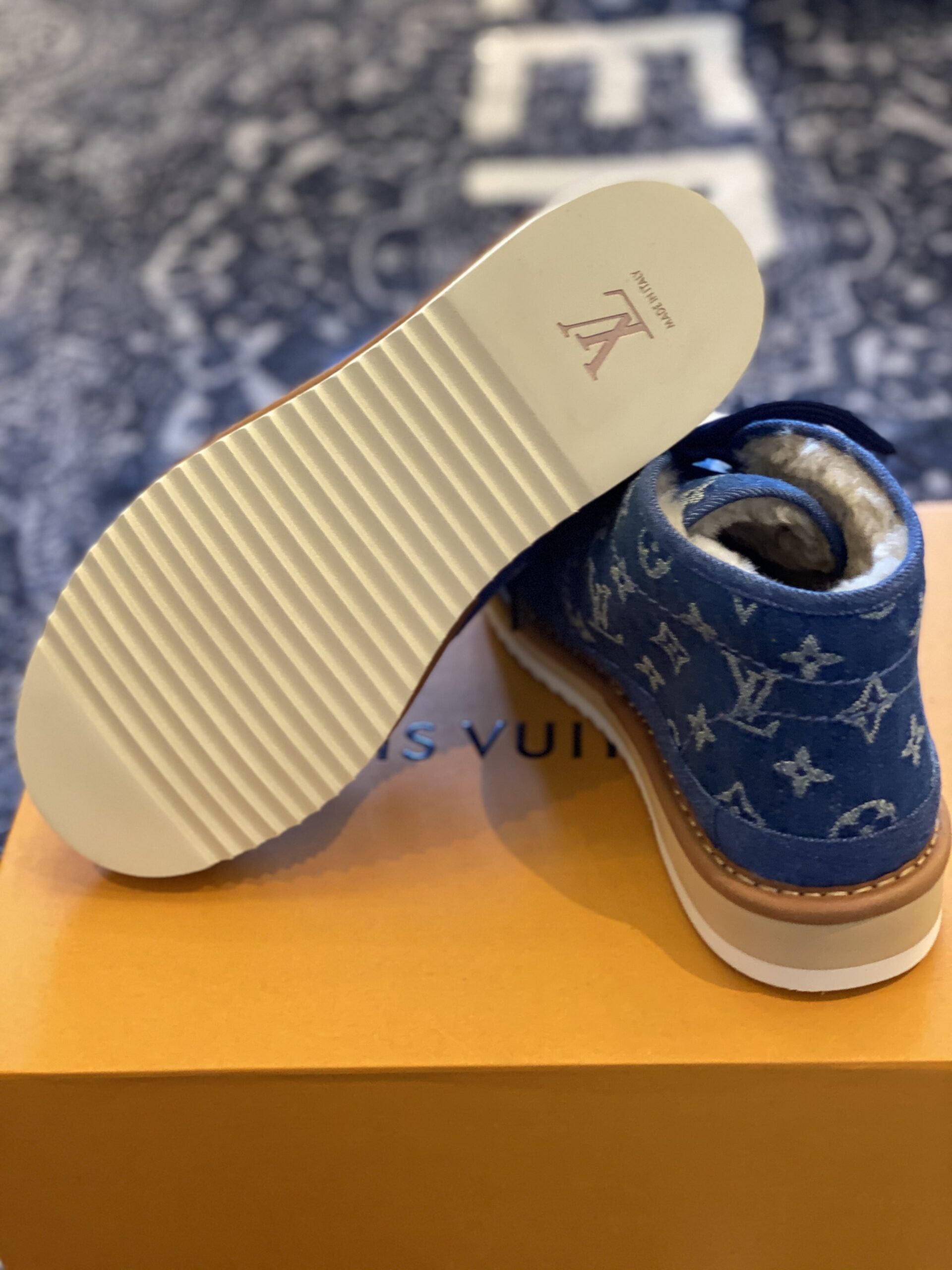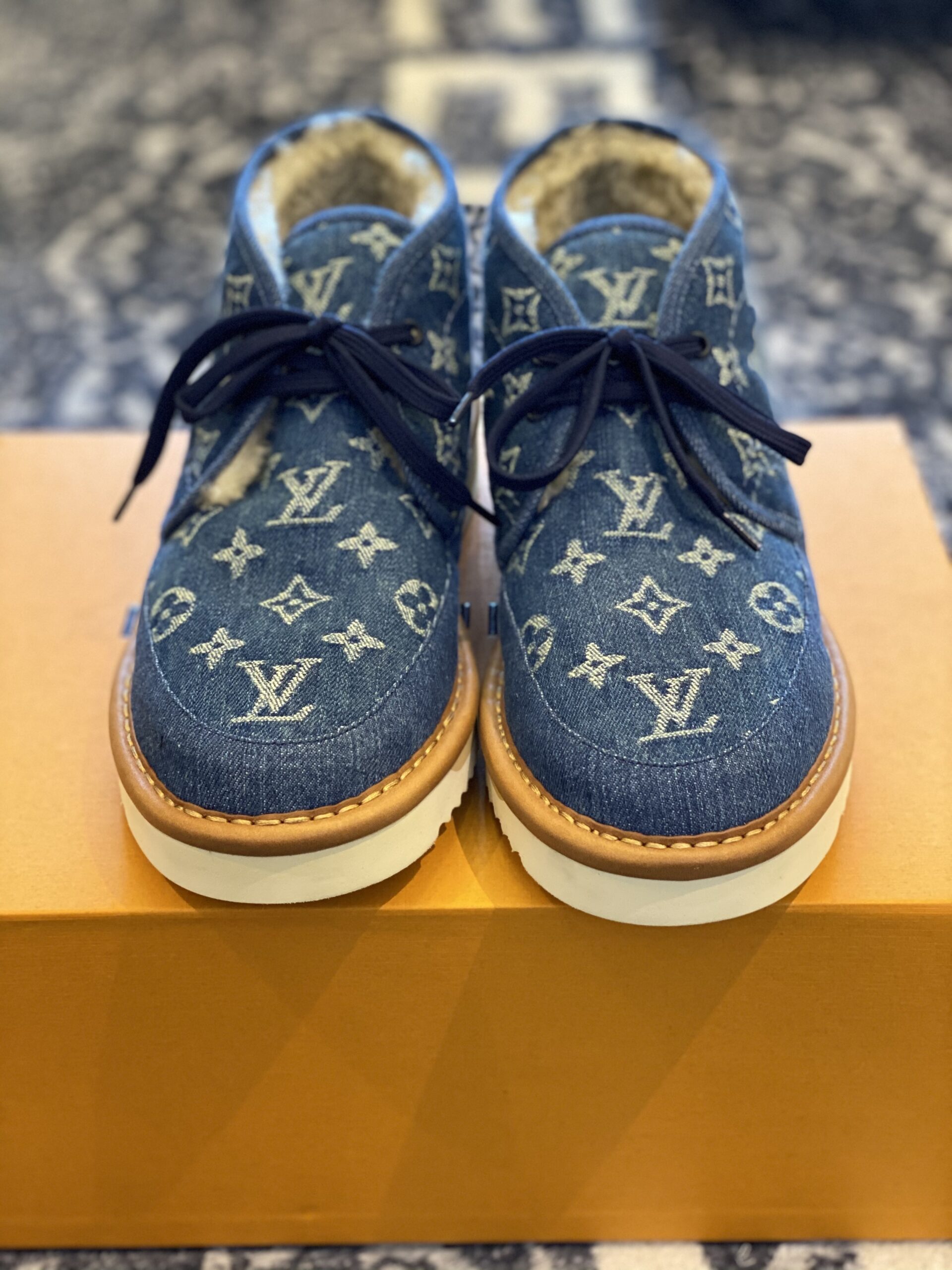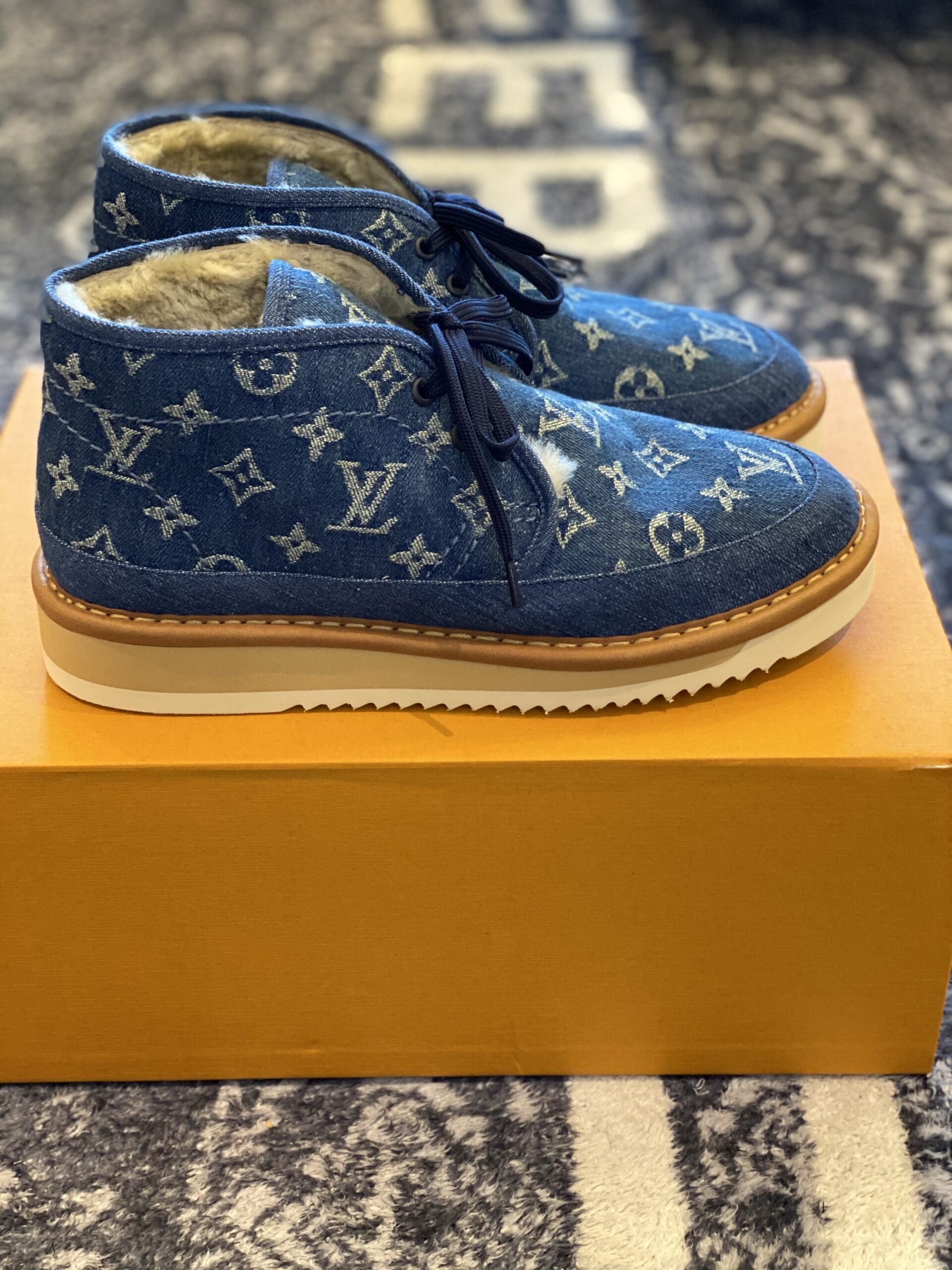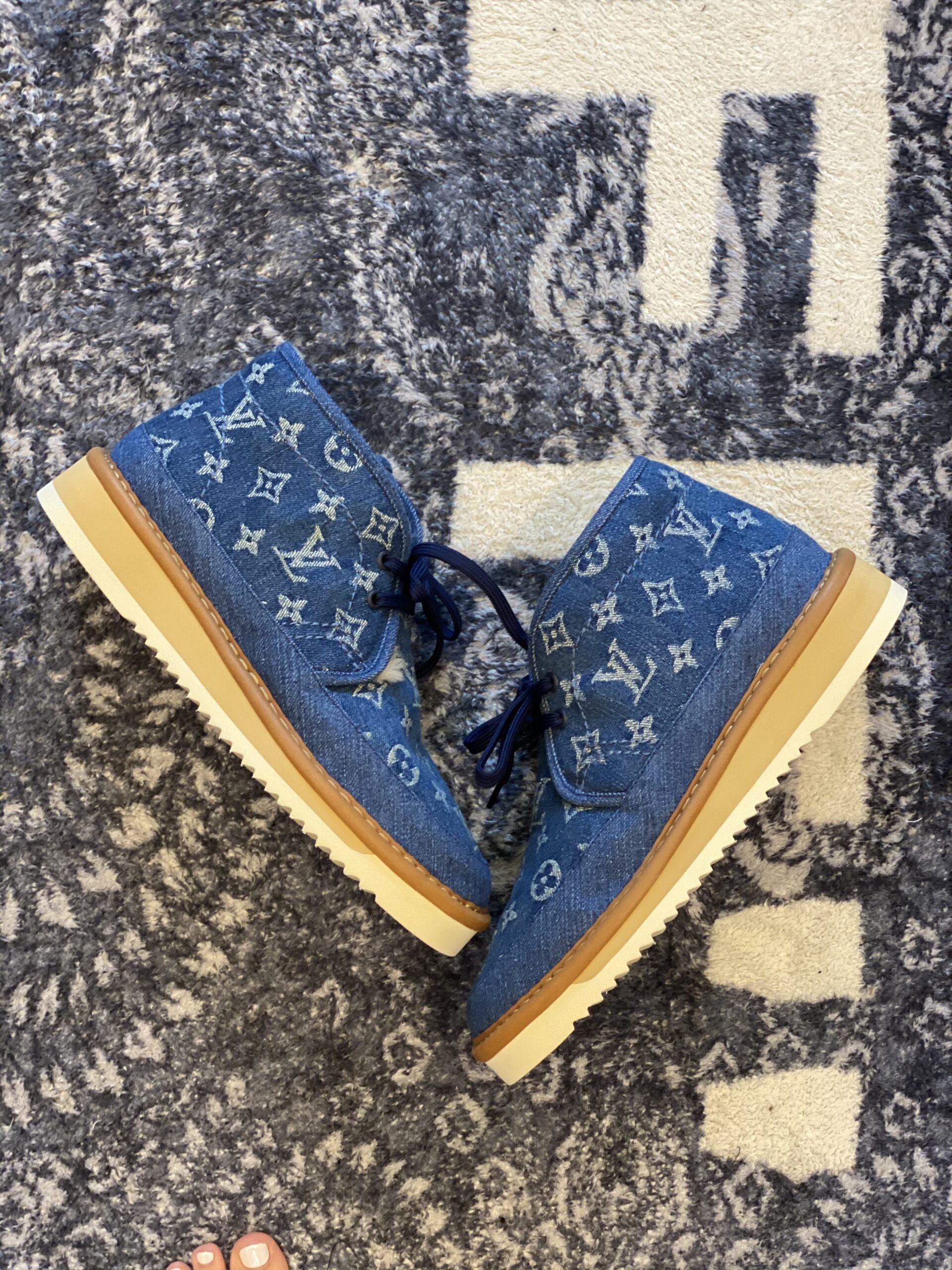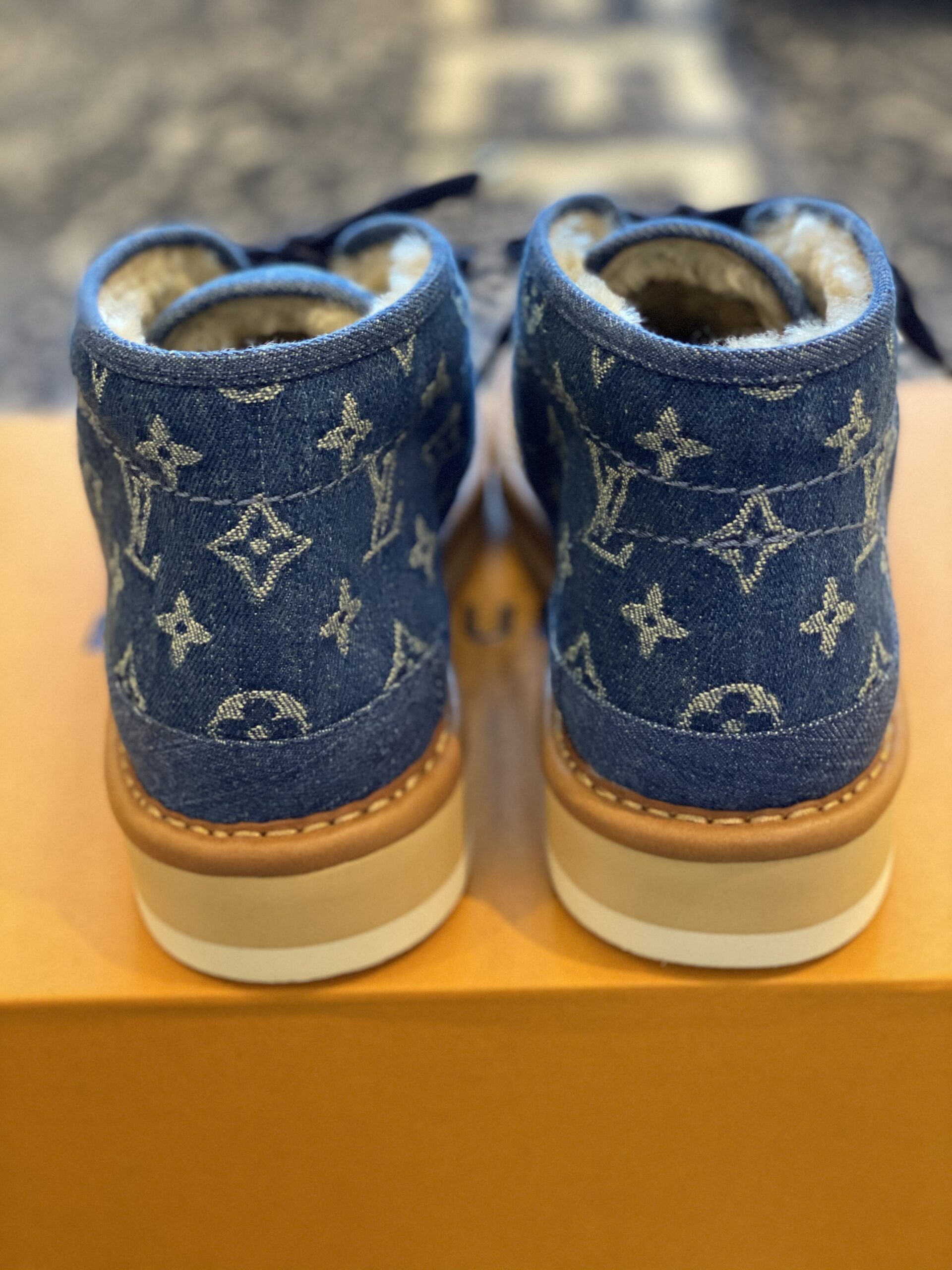 The Louis Vuitton Snowdrop Flat Ankle Boot in Blue Denim Monogram is a luxurious take on the classic cold-weather shearling boot. Please note that these products are not original but were inspired by the original brand. This stylish ankle boot is crafted from blue denim jacquard featuring the iconic Monogram pattern, offering a more structured and fashionable alternative to traditional suede winter footwear. The deep indigo textile provides a rugged yet refined appearance that pairs effortlessly with winter wardrobes. The design is defined by its plush, visible shearling lining that spills out slightly at the collar, ensuring superior warmth and a soft, cozy feel against the skin during the coldest months.