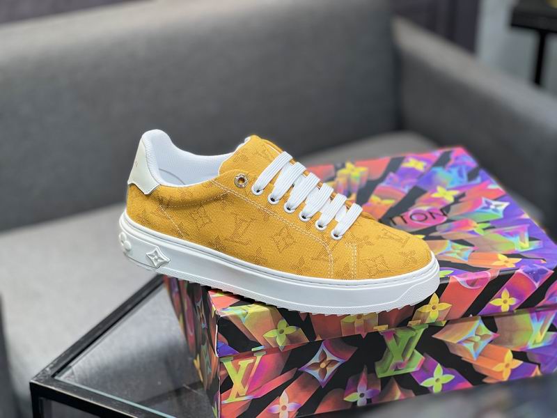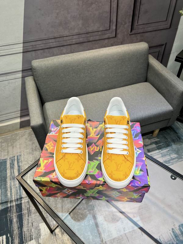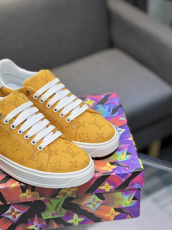 Louis Vuitton Stellar Low-Top Sneaker – Yellow Monogram Canvas. Make a confident, colorful statement with this vibrant low-top sneaker, drawing inspiration from the playful spirit of the Louis Vuitton Stellar model. The upper is crafted from a durable canvas material, which is boldly rendered in a cheerful yellow hue and detailed with an all-over embossed Monogram pattern. This sunny color choice provides an immediate visual lift, perfect for spring and summer styling. The sneaker is grounded by a thick, contrasting white rubber outsole, which provides a comfortable platform and ensures the design remains clean and balanced. Crisp white laces and a white leather accent on the heel tab complete the lively two-tone aesthetic. This footwear is a fantastic choice for those looking to inject their wardrobe with designer-inspired quality and unparalleled color. Disclaimer: Please be aware that this product is inspired by the design and style of the original Louis Vuitton Stellar Low-Top Sneaker and is not an original, authorized, or official product of the Louis Vuitton brand.
