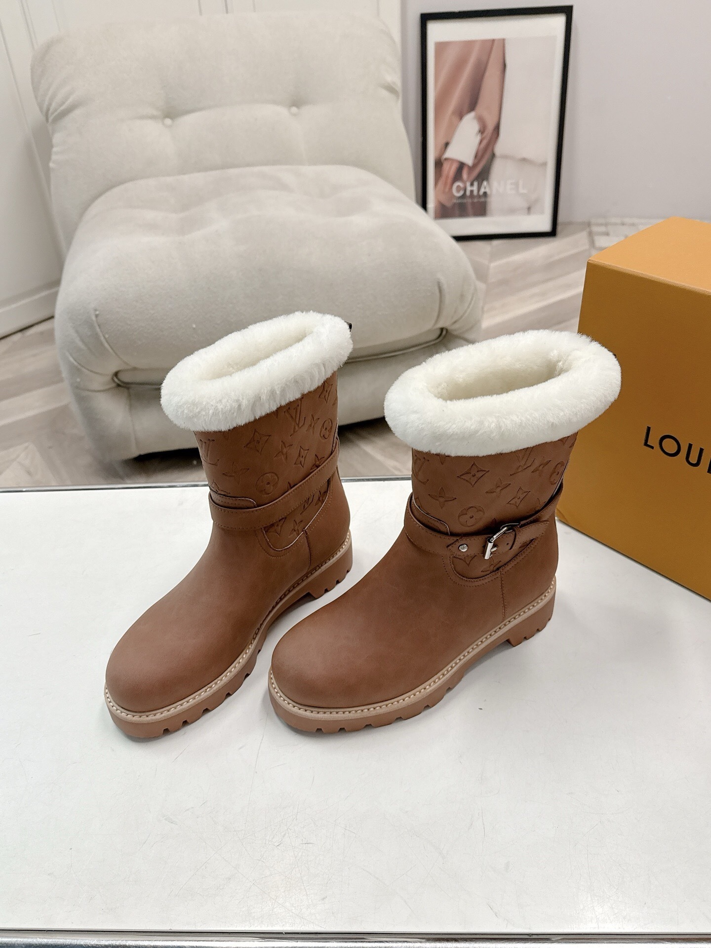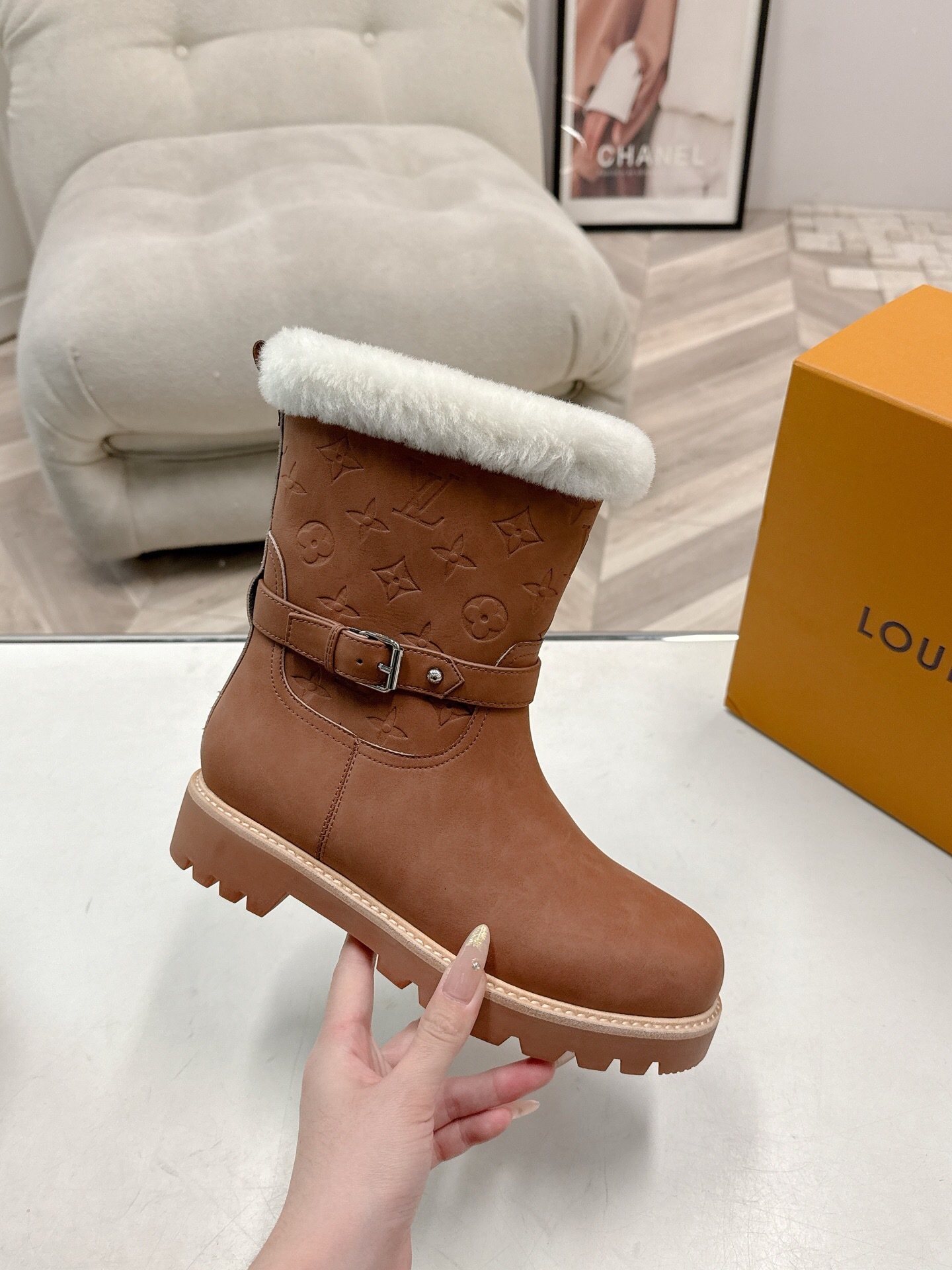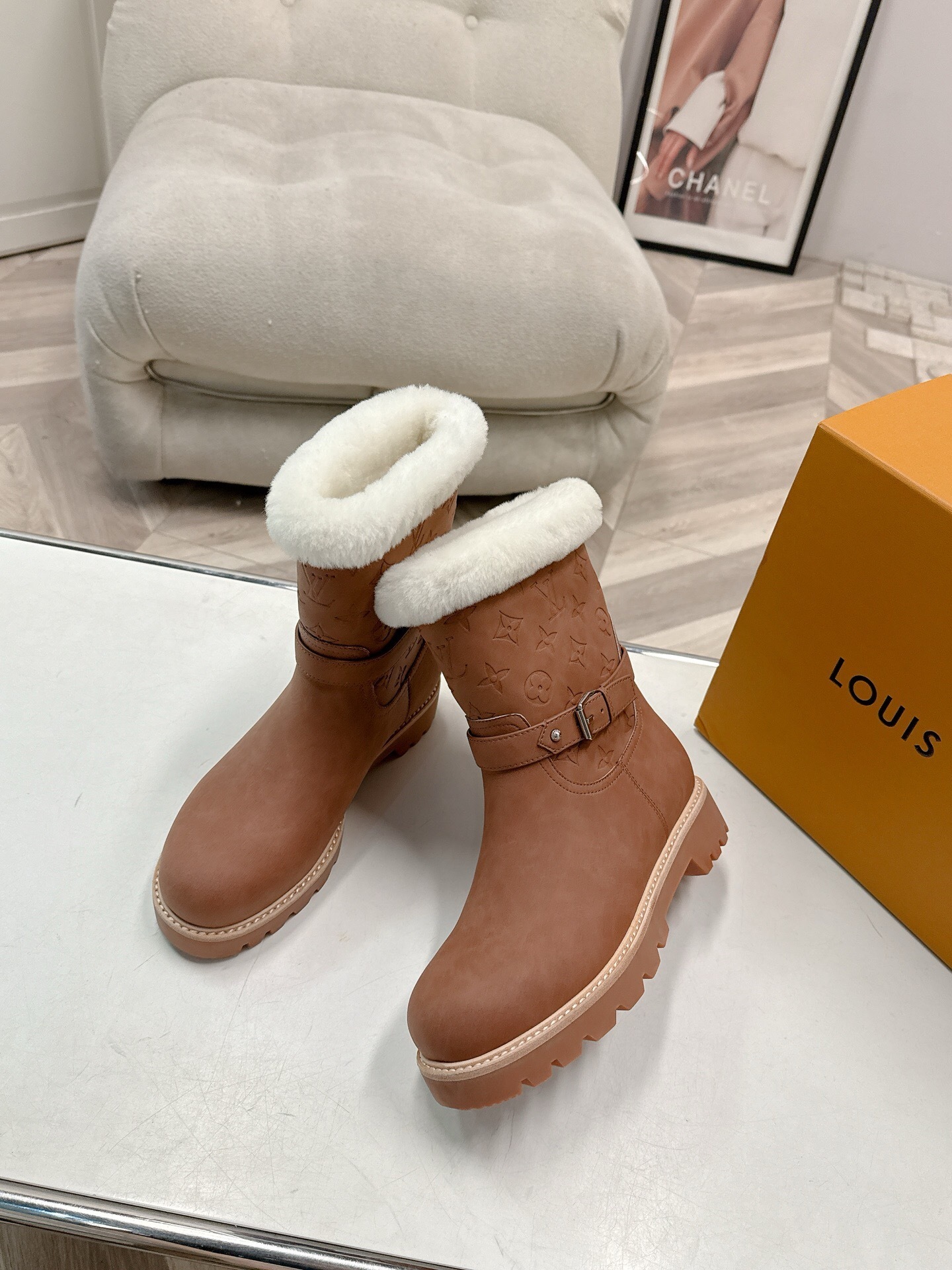 Are the Louis Vuitton Tan Monogram Embossed Boots waterproof? The synthetic leather upper provides excellent water resistance against light snow and rain; consequently, the Louis Vuitton Tan Monogram Embossed Boots are a reliable choice for damp winter weather.