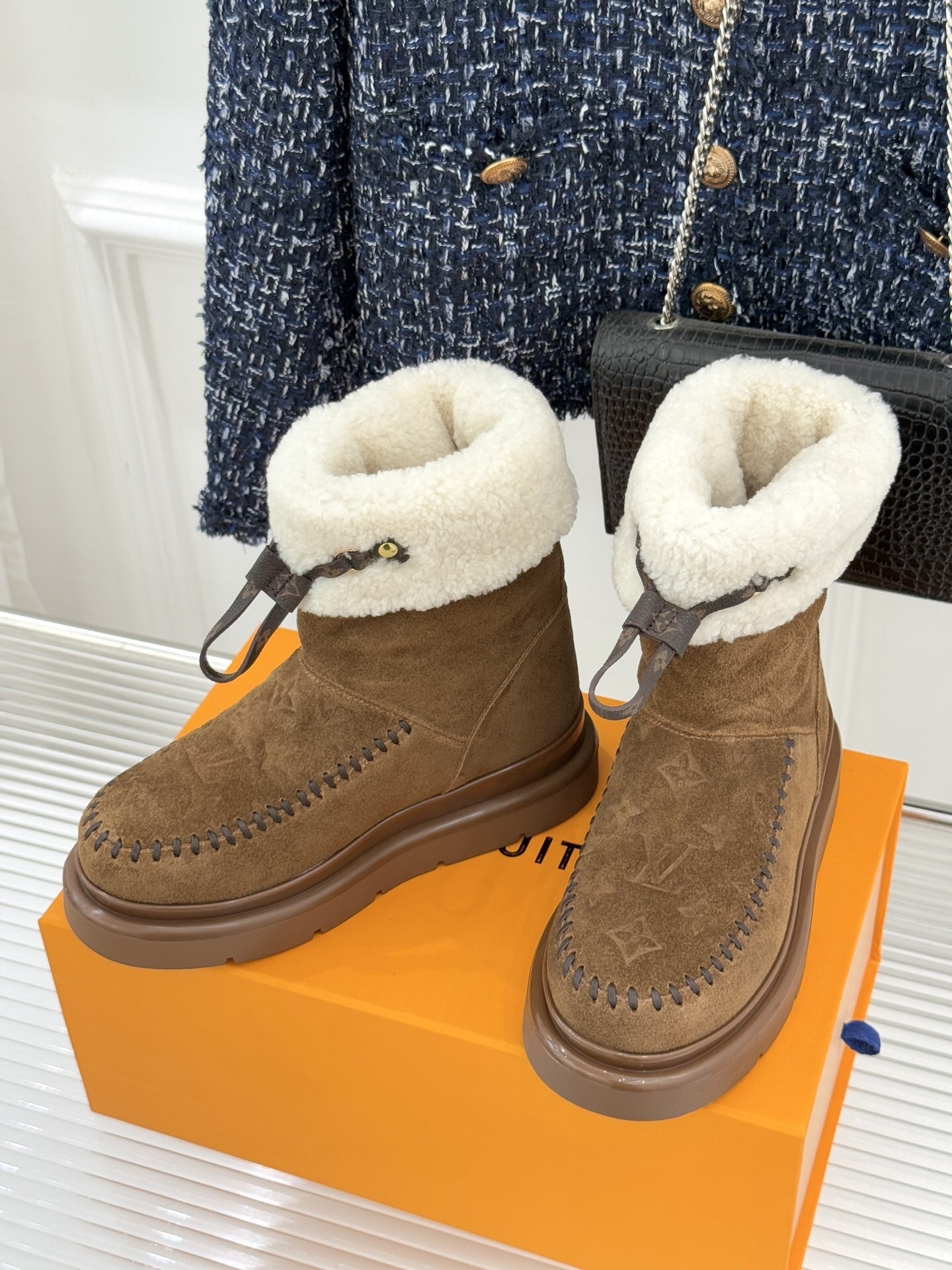Are the Louis Vuitton Tan Suede Monogram Boots suitable for all-day walking? Yes, the interior is fully lined with soft, insulating shearling; additionally, the cushioned platform of the Louis Vuitton Tan Suede Monogram Boots provides excellent support for extended wear.