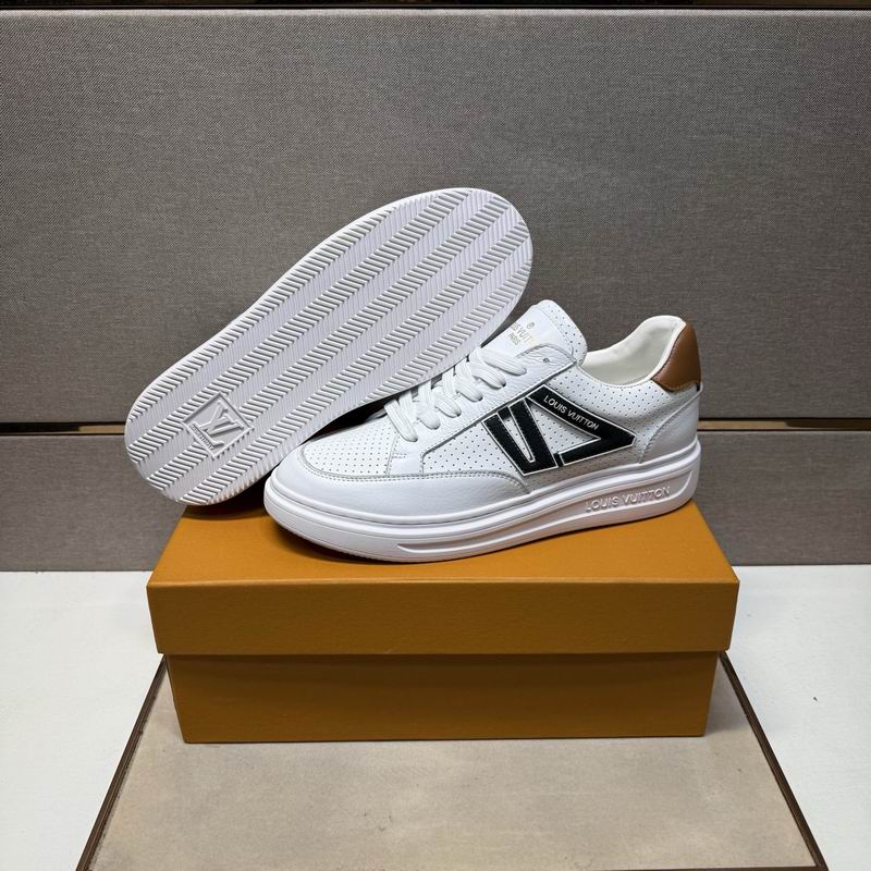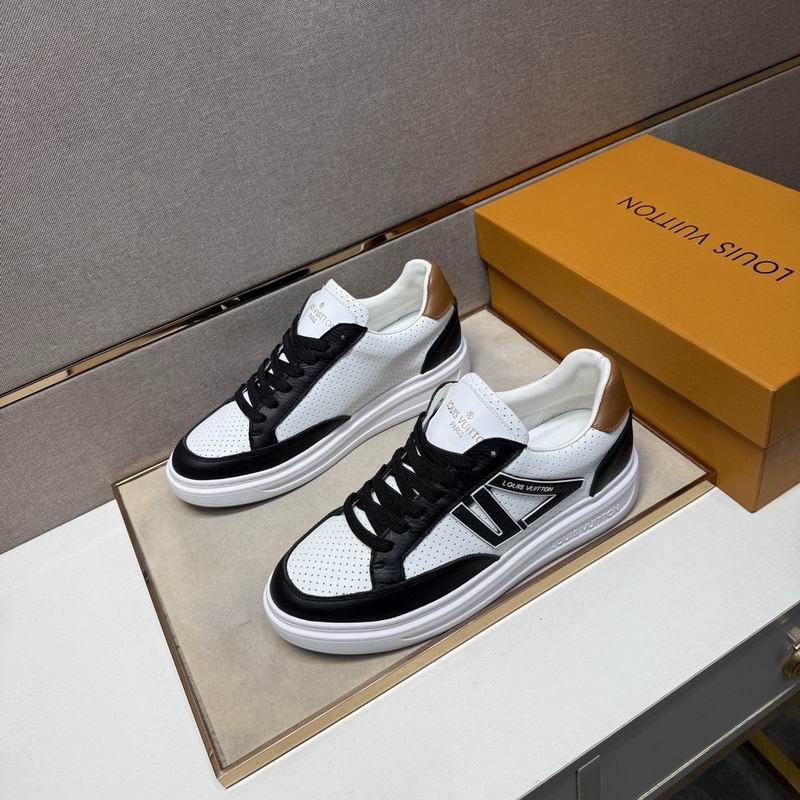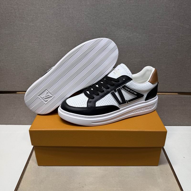 Louis Vuitton Trainer-Archlight Sneaker – White, Black, and Tan Leather. Make a dynamic statement with this contemporary sneaker, which combines the best design features of the popular Louis Vuitton Trainer and Archlight silhouettes. The upper boasts a clean white leather base, sharply contrasted by black leather overlays around the toe and eyelets, creating a highly graphic, black-and-white look. A key detail is the striking black leather ‘V’ shape motif on the side, lending an unmistakable athletic edge. The comfort comes from the perforated leather panels, ensuring breathability, and the substantial, sculpted white platform outsole that provides excellent cushioning and a distinct, modern profile. The final touch of luxury is the rich tan leather accent on the heel tab. This shoe is built for those who desire a sneaker that is equally at home on the street as it is making a fashion statement. Disclaimer: Please be aware that this product is inspired by the design and style of the original Louis Vuitton Trainer and Archlight models and is not an original, authorized, or official product of the Louis Vuitton brand.