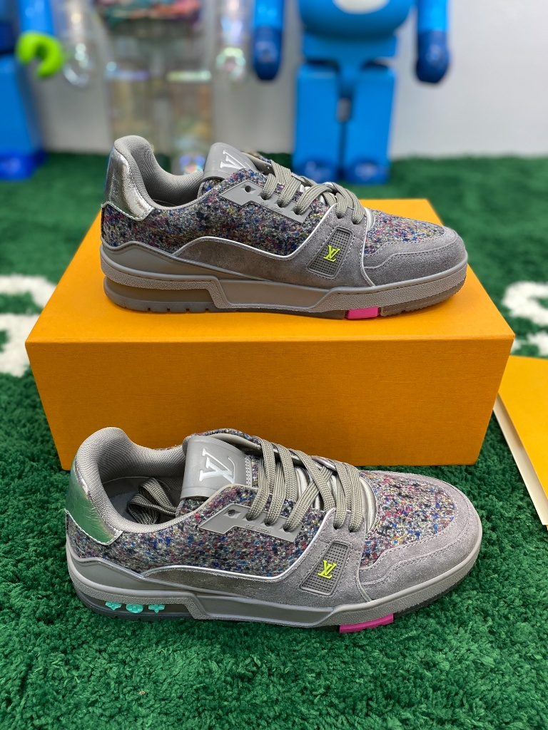 • Louis Vuitton Trainer ‘Grey Multi-Tweed’ Sneaker takes the celebrated Trainer profile and elevates it with an unconventional, tactile combination of materials, delivering a sneaker that is as visually engaging as it is refined. The upper is predominantly constructed from plush, high-quality grey suede, which provides a soft, sophisticated base across the side panels and toe cap. This neutral texture is dramatically contrasted by the use of an intricate multi-colored tweed fabric across the toe box and mid-panel. This fabric is interwoven with various bright threads and subtle metallic sparkles, giving the shoe a lively, almost shimmering depth.