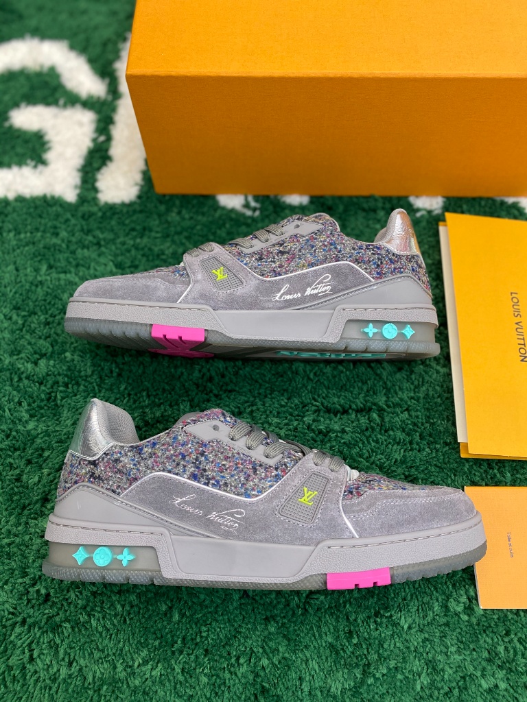 • The sneaker’s structure is further defined by luxury accents, including a striking metallic silver leather detail on the heel tab, adding a touch of reflectivity and futurism. The design cleverly incorporates pops of neon color for a modern edge: the substantial rubber outsole features neon pink accents beneath the arch and vibrant teal (or turquoise) transparent inserts near the heel, which showcase the signature Monogram Flowers. Signature details include the embroidered “Louis Vuitton” script on the lateral side panel and the recognizable LV logo on the tongue. This model maintains the Trainer’s signature padded fit and chunky, durable sole unit, ensuring stability and all-day comfort. The meticulous blend of soft suede, textured tweed, and high-energy neon color makes this shoe an exceptional choice for those seeking to integrate artistic texture and vibrant contrast into their premium wardrobe. It is a testament to the brand’s ability to fuse athletic inspiration with truly artisanal craftsmanship.