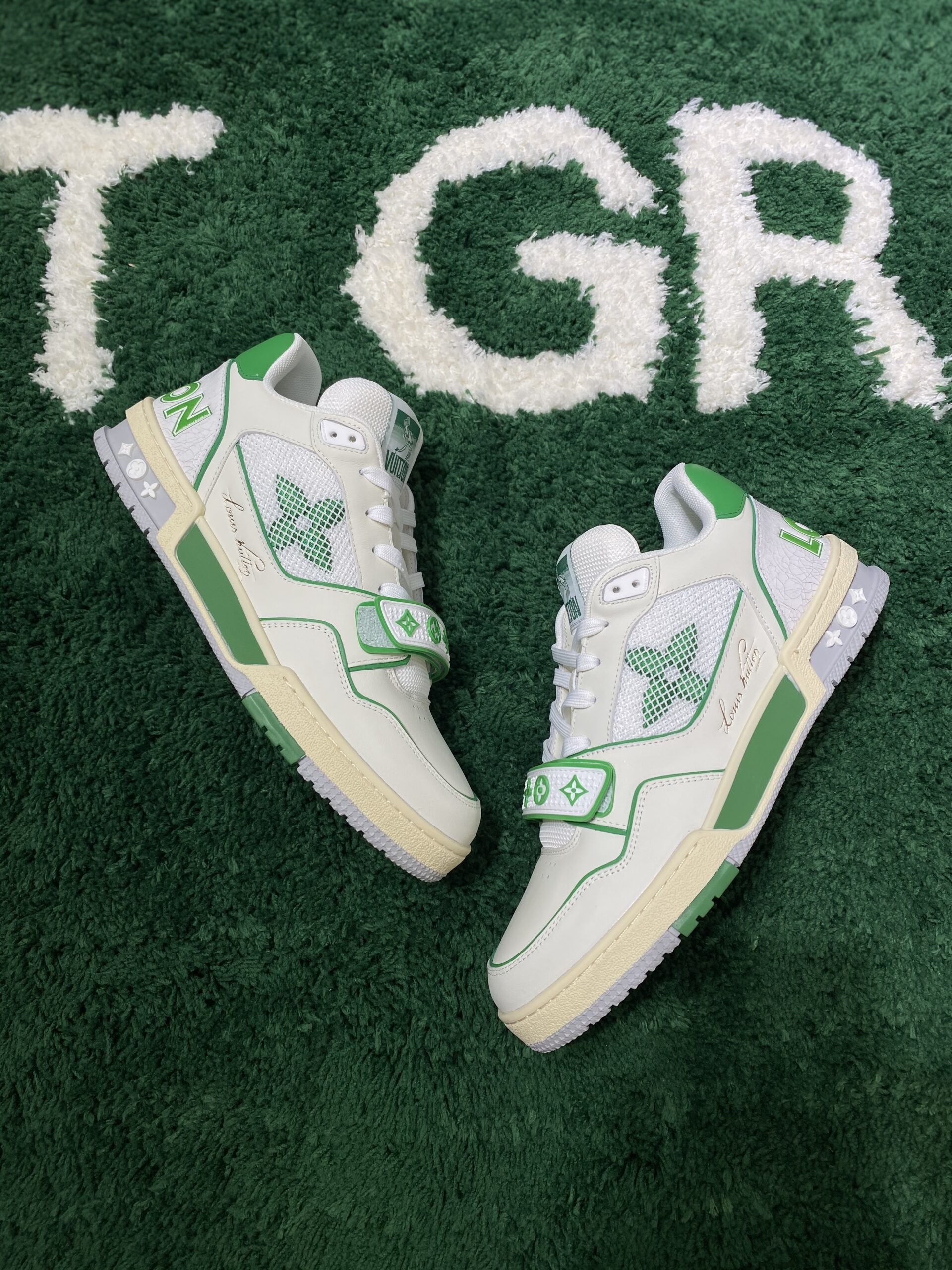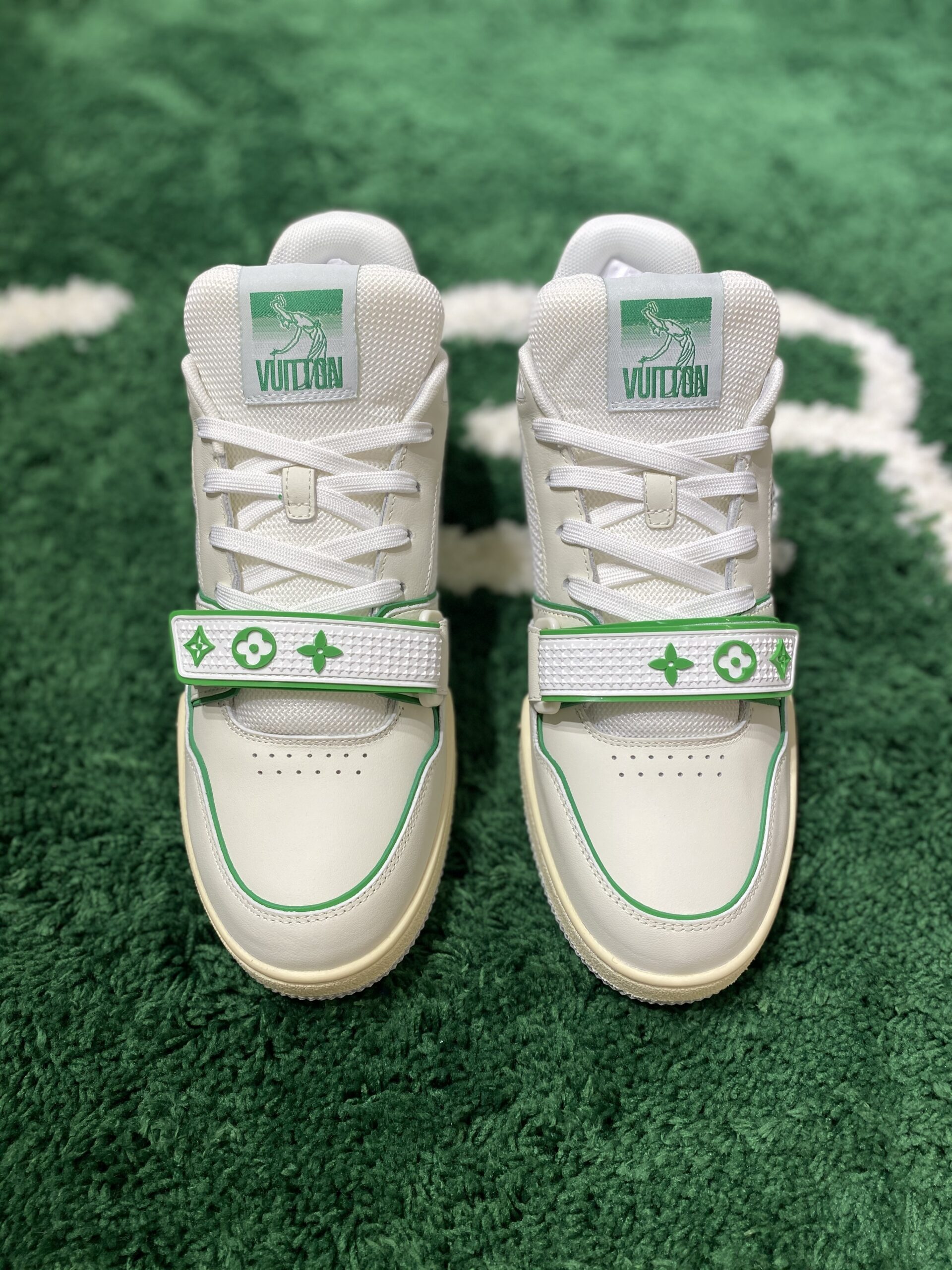The most striking feature of this design is the broad, white hook-and-loop strap positioned across the front vamp, securing the laces and enhancing the shoe’s court-inspired lineage. This strap is embellished with the green Monogram Flower signatures, serving as a powerful, yet playful, branding element that immediately identifies the piece as LV. The shoe is built upon a chunky, two-tone rubber outsole that features intricate detailing, including the debossed Monogram Flower motifs on the sides and the LV signature on the heel. The tongue label also features a prominent “VUITTON” graphic in the same contrasting green. This sneaker is an essential statement piece, effortlessly pairing with upscale denim, refined tailoring, or sporty leisurewear. Its expert blend of nostalgic design, contemporary luxury materials, and athletic comfort makes it a high-value addition to any elite footwear collection, representing the confluence of streetwear and haute couture.