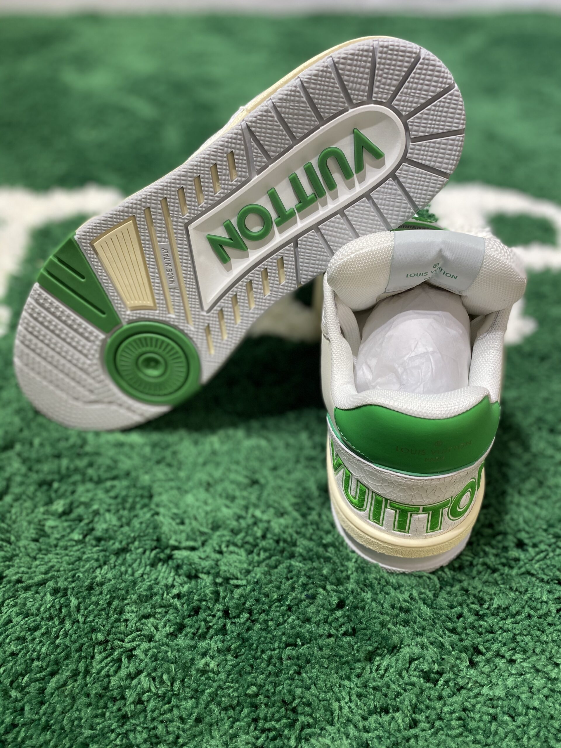 Louis Vuitton Trainer Low (White/Green) Sneaker is an ode to vintage basketball footwear, reimagined with the unparalleled luxury and detail of Louis Vuitton’s savoir-faire. Originally designed by Virgil Abloh, the Trainer silhouette has become an iconic pillar of modern luxury sportswear, known for its bold structure and immaculate material composition. This low-top version is presented in a dynamic two-tone palette, featuring pristine white smooth calfskin leather meticulously contrasted with vibrant green piping and accents. The quarter panel incorporates technical mesh for superior breathability, while the overall structure provides robust support and an unmistakable retro silhouette.