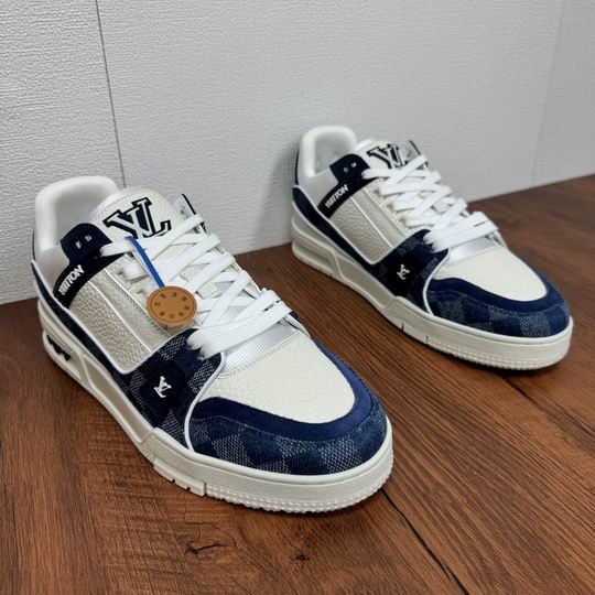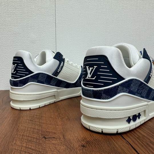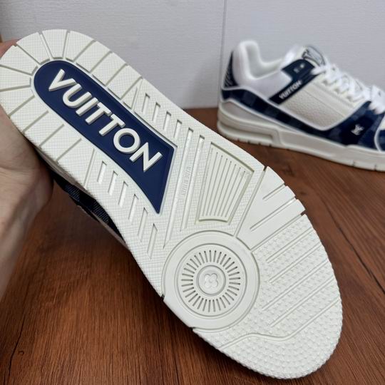 Louis Vuitton Trainer Sneaker Blue White Monogram Canvas and Leather is a sophisticated shoe that channels high-fashion street wear with its intricate, multi-layered construction. Drawing inspiration from classic athletic footwear, the design is elevated through the meticulous use of premium materials. The shoe features panels of crisp white tumbled leather juxtaposed with rich navy blue suede overlays on the toe box and heel. The defining feature is the side paneling, which showcases a striking, bleached-out effect of the iconic Louis Vuitton Monogram pattern in shades of blue and white canvas, lending a unique textural depth. Branding is tastefully incorporated via the signature on the metallic silver rear stabilizer and a prominent ‘LV’ motif on the thick padded tongue. The chunky white sole unit ensures durable wear and maximum comfort, making it suitable for all-day city excursions while providing a fashionable, contemporary lift. The color palette—mixing navy, white, and silver—makes this a versatile centerpiece for any modern casual ensemble. Please note: These sneakers are premium products inspired by the Louis Vuitton Trainer design and are not original or official merchandise from the Louis Vuitton brand. They are crafted to emulate the aesthetic and high-quality feel of the original product.