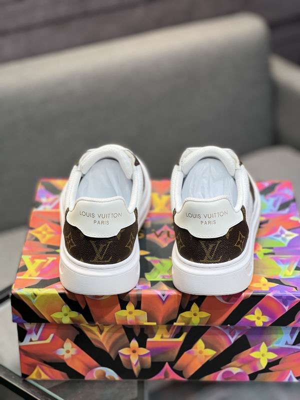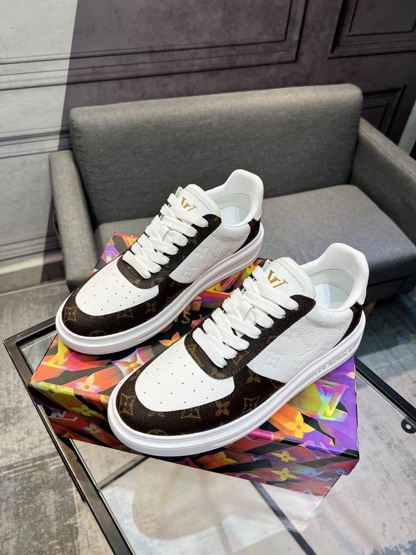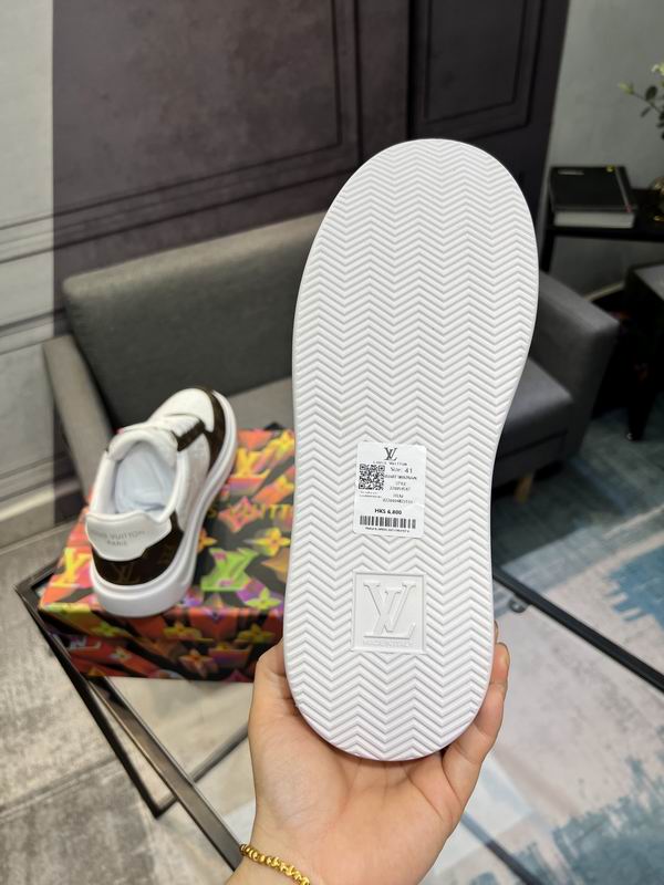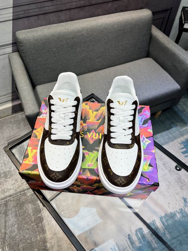 Louis Vuitton Trainer Sneaker Classic Monogram Brown White is a sophisticated take on a timeless court shoe silhouette, perfectly balancing vintage athletic charm with high-end style. The construction features a rich, dark brown leather overlay patterned with the signature Monogram print, wrapping the heel, eyelets, and toe cap. This luxurious pattern beautifully frames the main panels, which are crafted from bright white, finely perforated leather, ensuring breathability and adding textural contrast. The thick, flat white out sole provides reliable comfort and a contemporary platform feel, keeping the overall look polished and clean. Gold-colored ‘LV’ hardware on the tongue stands out as a premium detail, reinforcing the design’s high-fashion inspiration. The color combination is eternally classic and versatile, pairing easily with casual outfits, making it an essential piece for any modern footwear collection. The design details, from the padded collar to the durable lacing system, prioritize both style and longevity. Disclaimer: These sneakers are premium products inspired by the Louis Vuitton Trainer design and are not original or official merchandise from the Louis Vuitton brand. They are carefully crafted to emulate the aesthetic and quality feel of the original luxury product.
