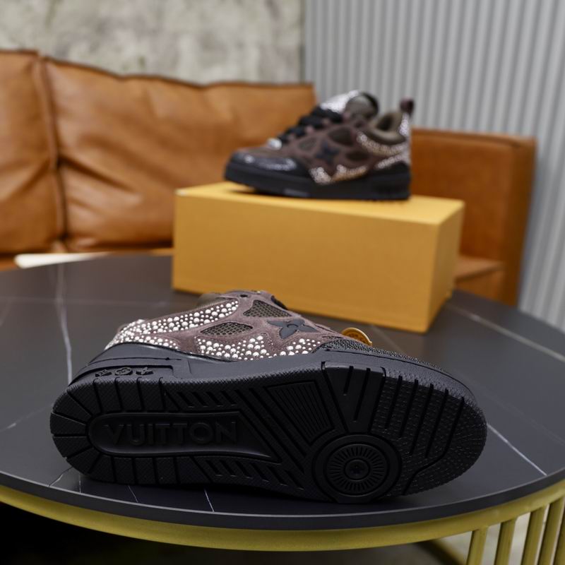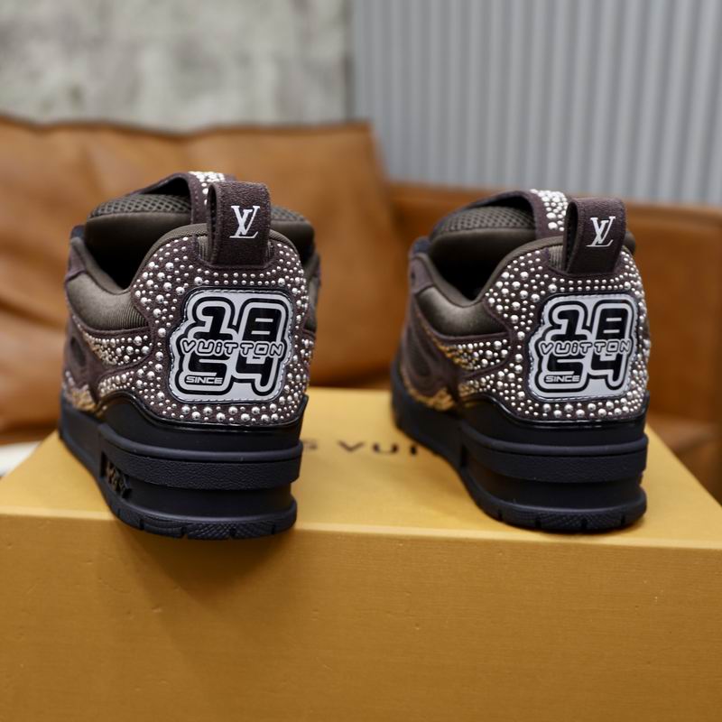 The Louis Vuitton Trainer Moccasin Dark Brown and Studded Gold captures the essence of luxury casual footwear, blending a sophisticated color palette with eye-catching embellishments. This design is built on a sturdy, dark brown foundation, utilizing a breathable mesh material across the mid-panel and tongue, perfectly complemented by velvety suede-like overlays. The aesthetic is dramatically elevated by a cascade of miniature gold-toned studs that trace the shoe’s profile, providing a dazzling, high-end texture. A patent-like black material wraps the lower section of the toe box, adding a glossy contrast to the matte textures of the upper. The overall look is a fusion of athletic trainer comfort and the opulent detailing associated with high-fashion houses. Attention to detail is evident in the chunky black sole unit, which anchors the design and ensures durability for daily use. This particular sneaker is ideal for those who wish to make a bold style statement, easily pairing with everything from tailored casual wear to contemporary street wear. It offers an exclusive, bespoke feel that sets it apart from conventional footwear. The deep, earthy tones make it versatile for year-round styling, while the metallic accents guarantee it will catch the light and the eye. This model successfully translates runway inspiration into wearable, urban chic.