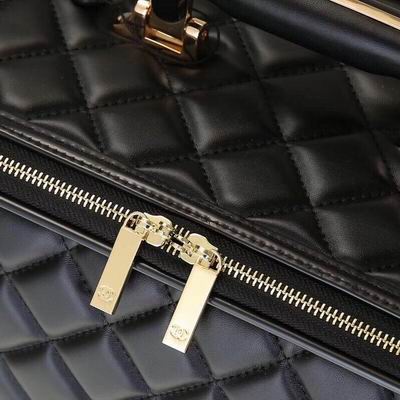 The  Chanel Black Quilted Carry-On Suitcase is the ultimate fusion of high-end fashion and practical travel utility. Designed for the modern traveler who refuses to sacrifice style for function, this luggage piece features a sophisticated diamond-quilted exterior that mimics luxury handbags. Additionally, the soft-touch synthetic leather material provides a premium feel while remaining durable enough to withstand the rigors of overhead bins and busy airport terminals.