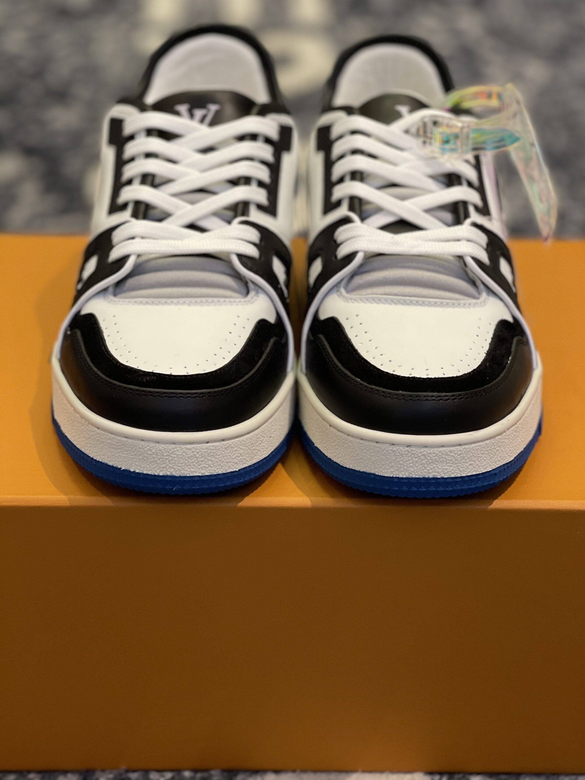 LV Trainer Black Blue Sneaker is a sharp, high-contrast interpretation of the legendary Trainer silhouette, capturing the bold energy of 90s basketball footwear with refined luxury materials. The upper is constructed from a meticulous combination of smooth white and textured black calfskin leather, creating a dynamic, panelled effect. The clean white base is framed by deep black overlays, lending the shoe structural definition and a classic, graphical look. This monochrome foundation is dramatically interrupted by vibrant, electric blue detailing.