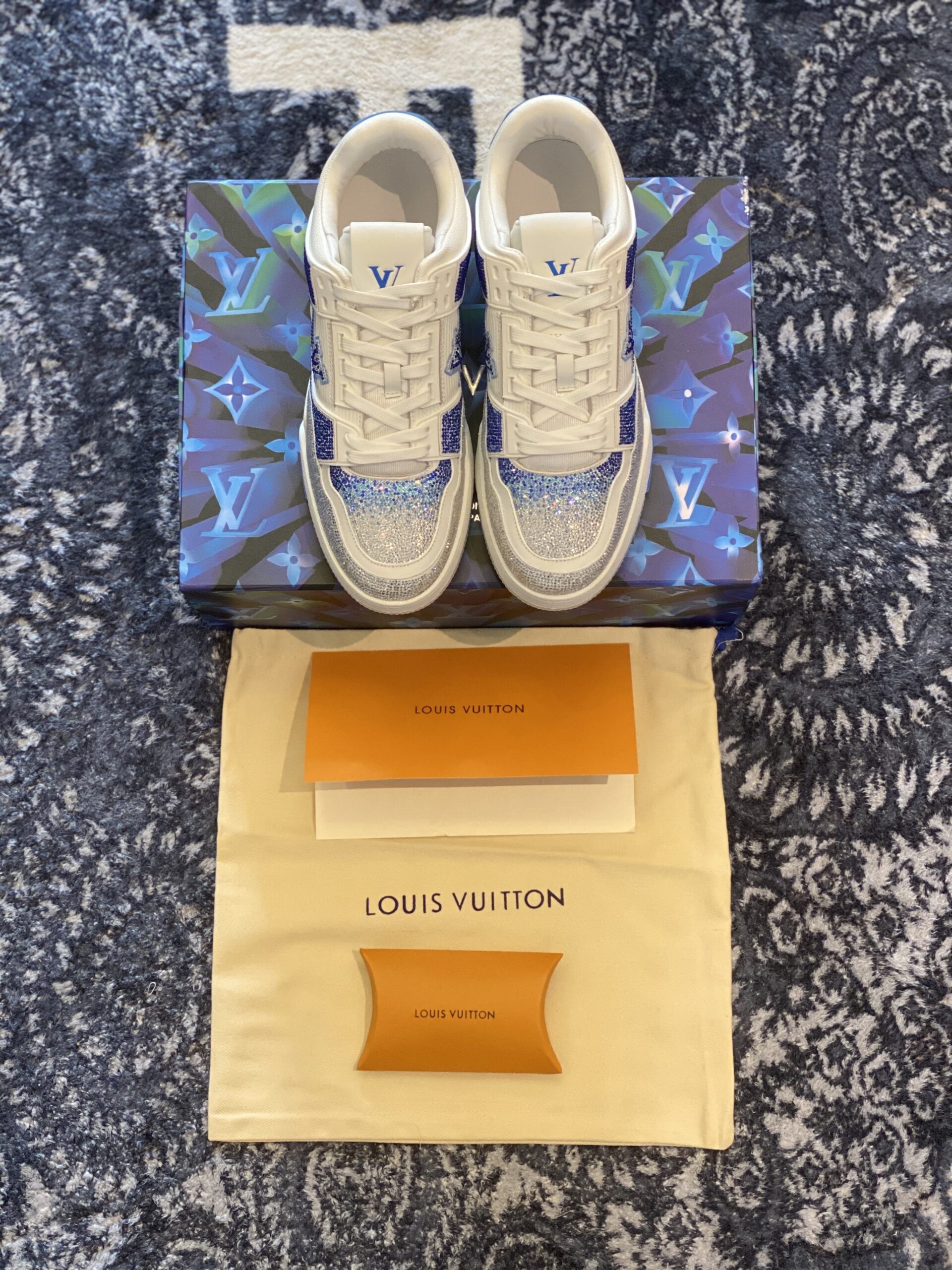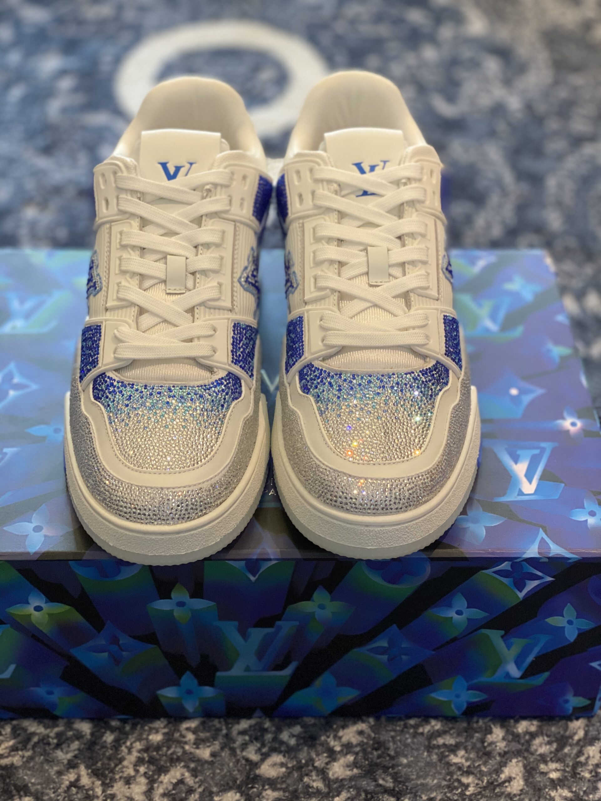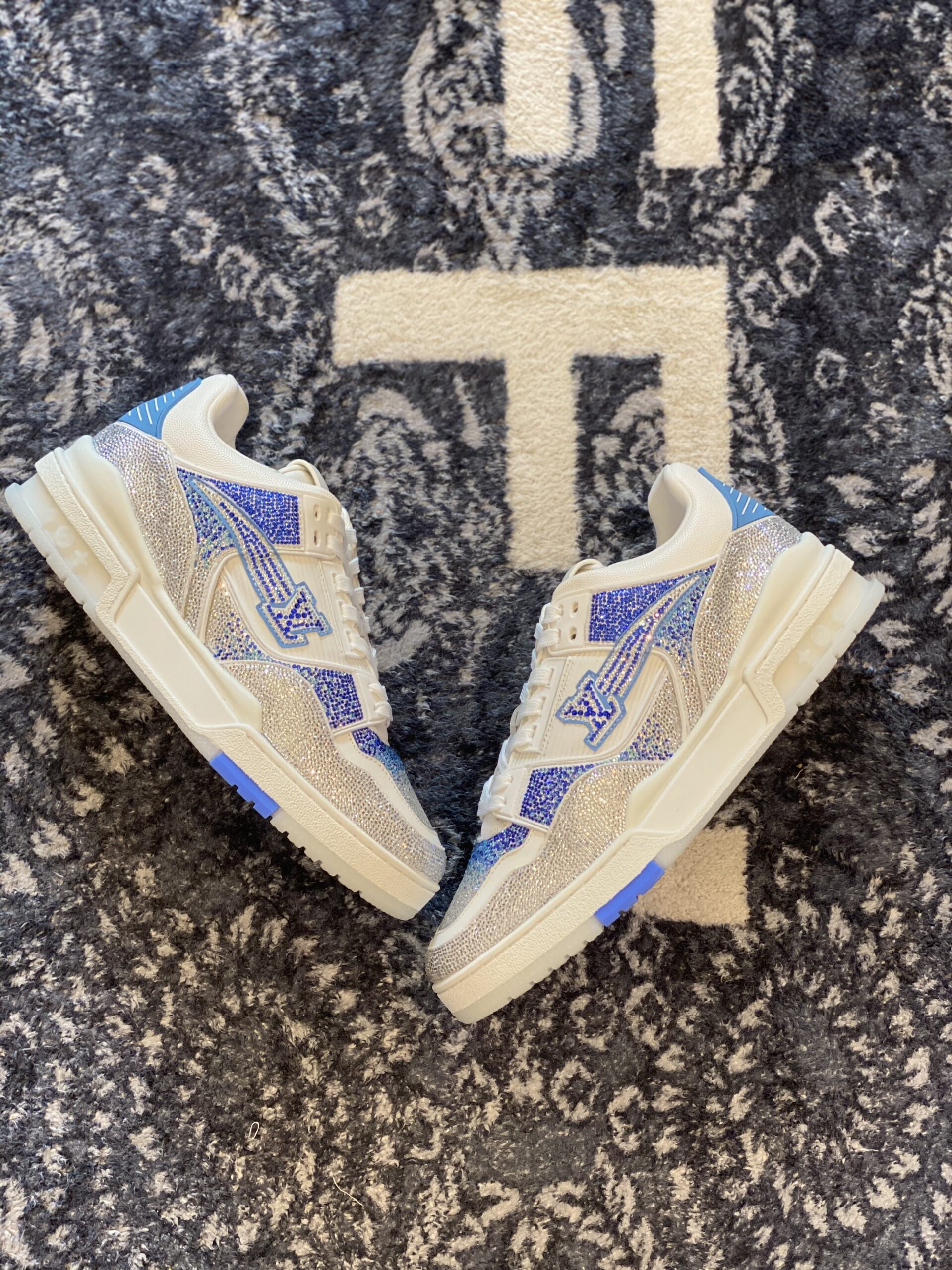 Be the first to review “LV Trainer White Glitter Blue Sneaker”