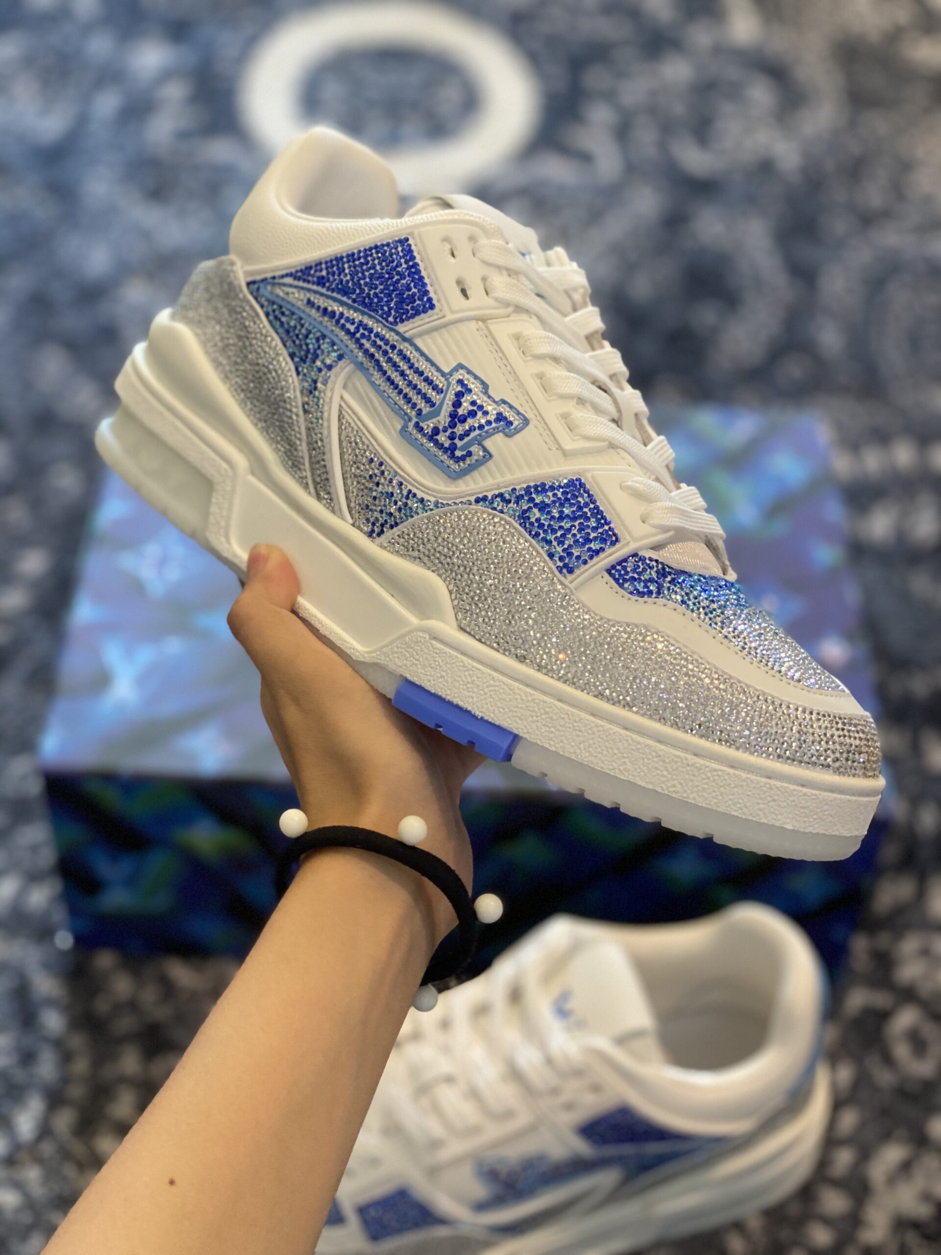 • The core Trainer architecture remains, featuring a substantial, yet balanced, white rubber outsole that is engineered for comfort and stability. The design integrates unique branding elements that match the high-glamour aesthetic, including the LV initials detailed in the blue micro-texture on the side and the bold LV logo subtly integrated into the padded tongue. The sole unit offers a slightly translucent quality, enhancing the futuristic appeal of the shoe. The entire structure is meticulously stitched and paneled, demonstrating the sophisticated level of craftsmanship required to handle these complex, multi-textured materials. The use of white laces allows the glitter and blue accents to remain the focal point. This sneaker is the perfect selection for those who embrace maximalist luxury, pairing effortlessly with sleek separates, dynamic streetwear, or simple black outfits where the shoe becomes the central statement piece. It represents the successful convergence of high-octane glamour and comfortable, iconic sneaker design. This highly specialized edition delivers unmatched visual impact and premium quality.