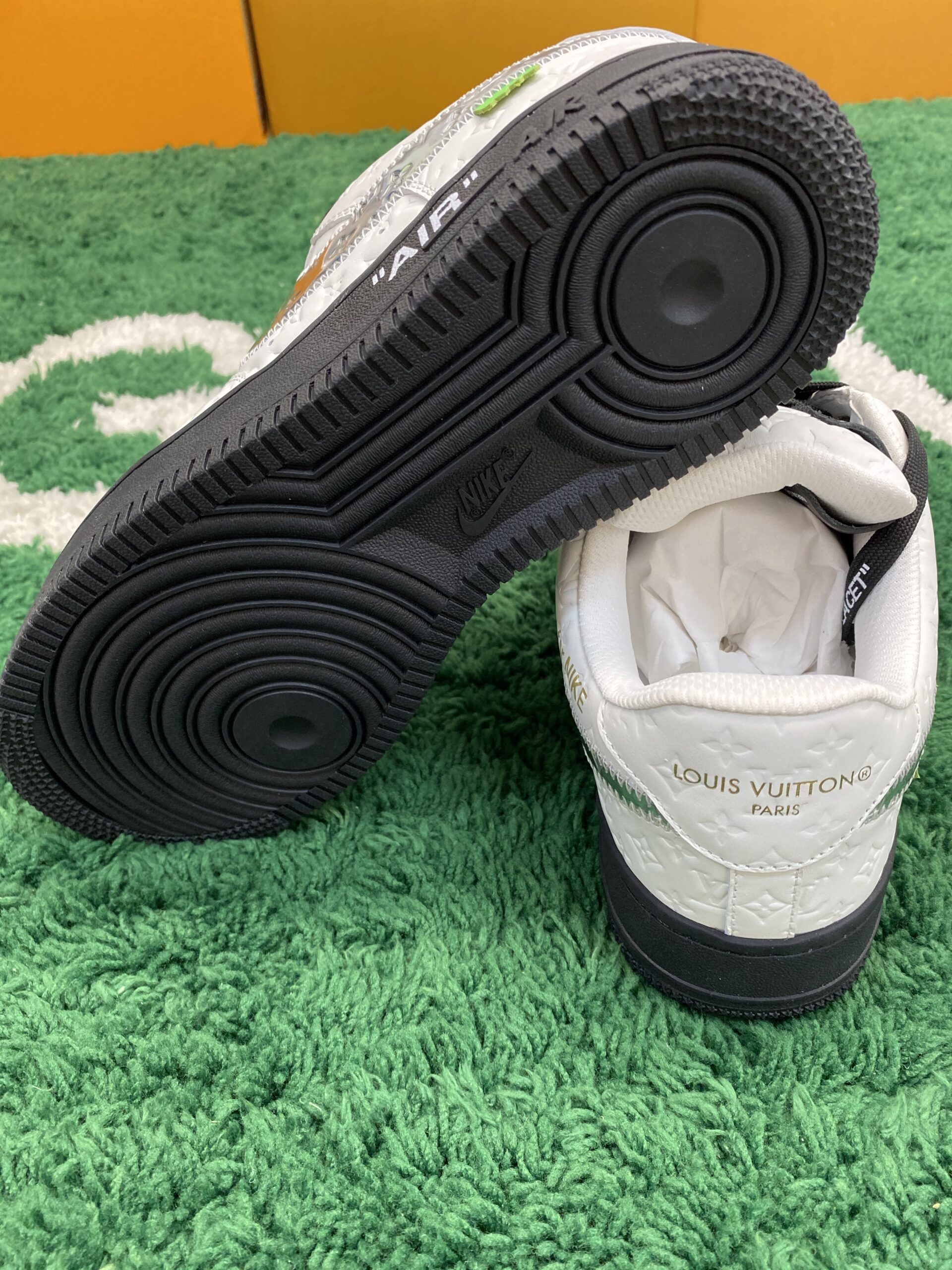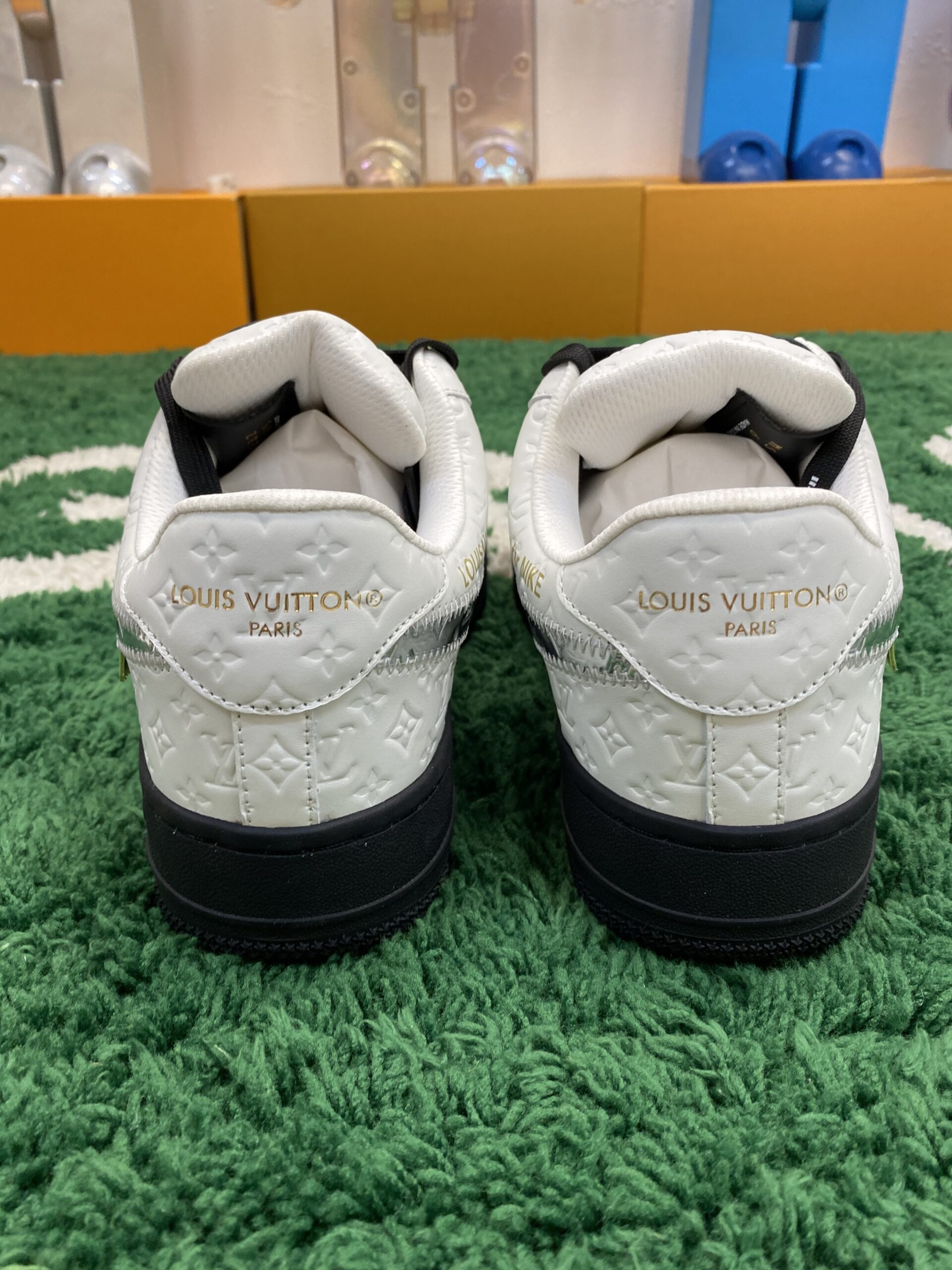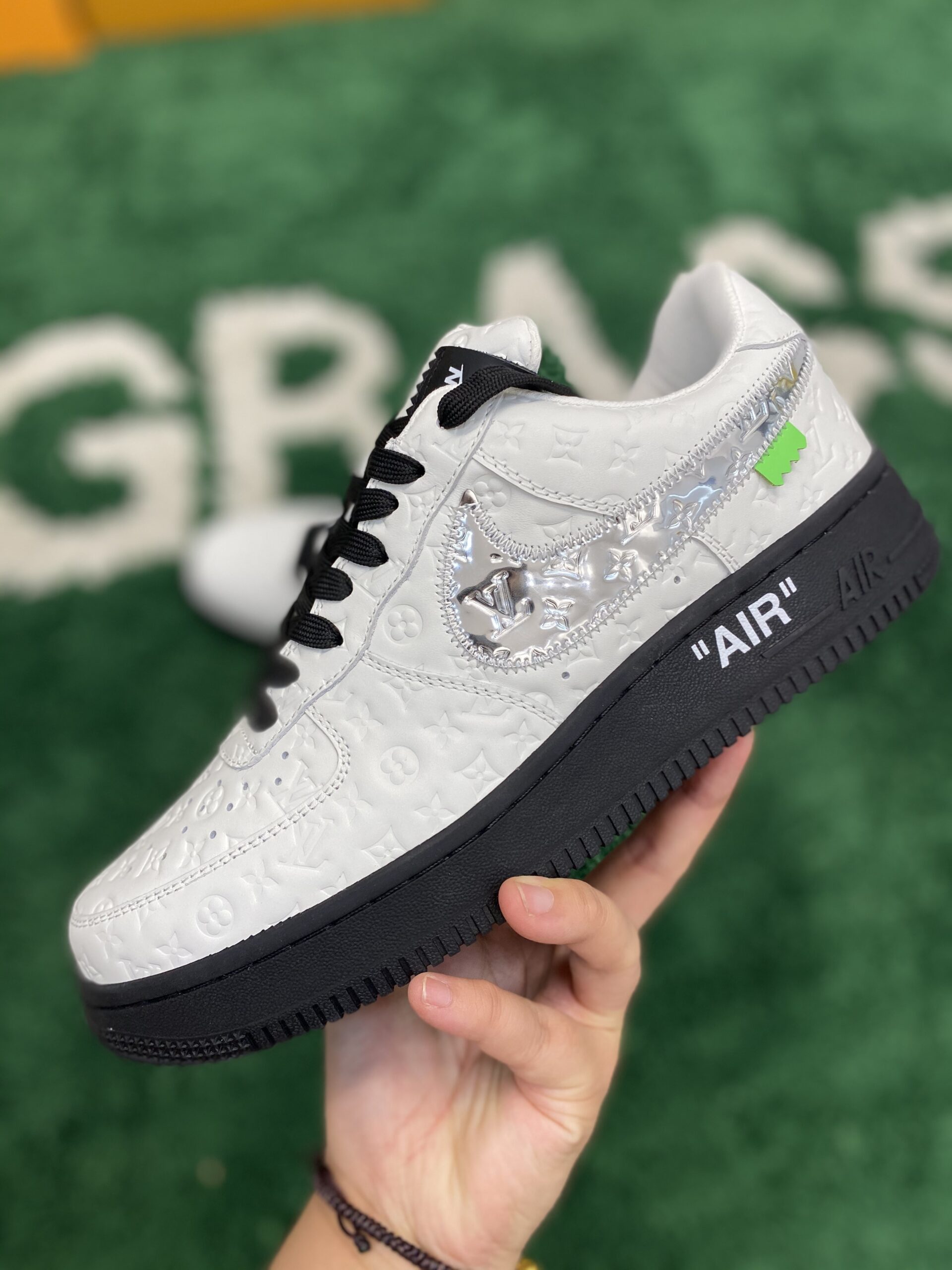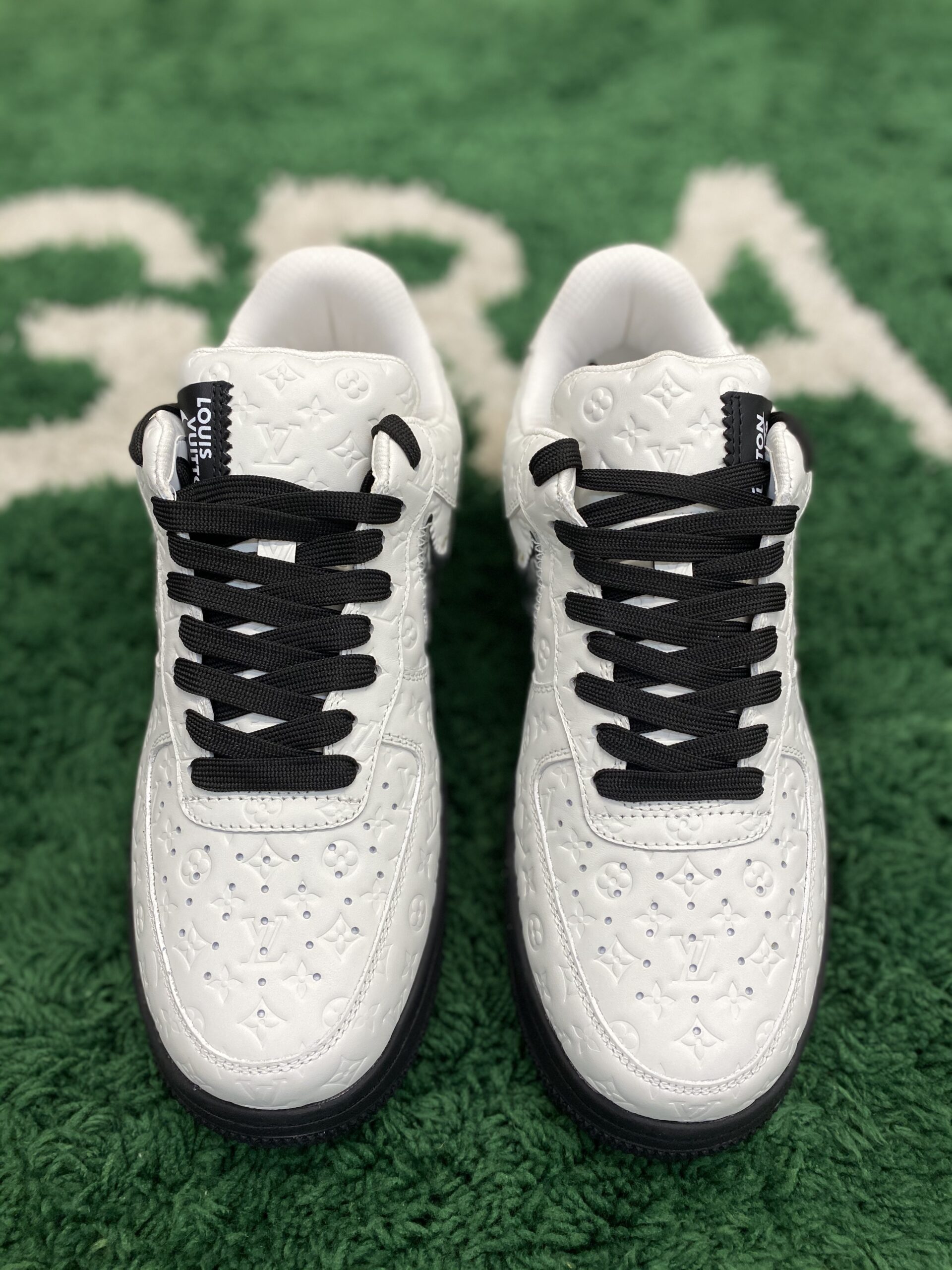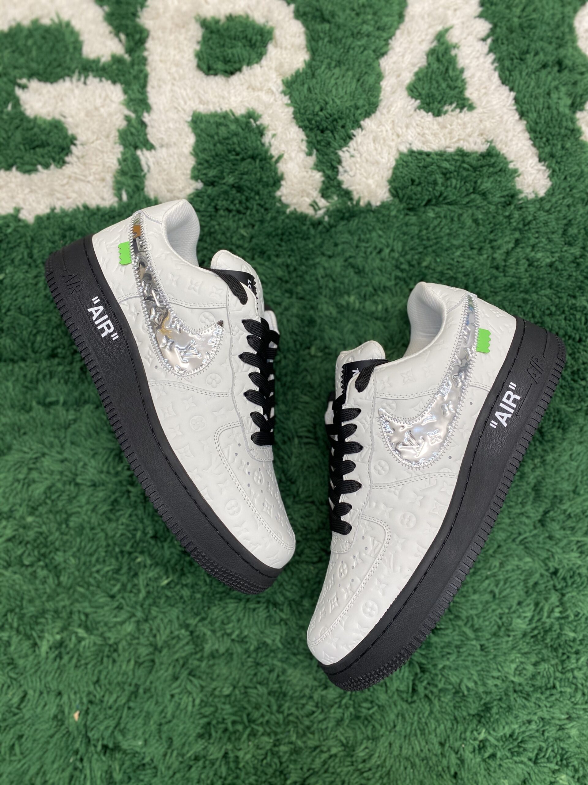 LV X NIKE AIR FORCE 1Â Low Monogram White Black Silver is the perfect blend of athletic heritage and luxury-inspired elegance, presented in a timeless, high-contrast colorway. The defining feature is the clean, monochromatic white upper, which is entirely covered in a debossed, all-over monogram pattern. This tonal application gives the shoe a subtle yet undeniably premium texture, visible across the toe box, quarter panels, and heel. This understated luxury is immediately contrasted by the use of bold black across the entire midsole and outsole, making the upper pop dramatically and giving the sneaker a grounded, strong foundation. Adding a flash of brilliance is the signature swoosh, which is rendered in a metallic silver finish, secured with visible stitching, and features a clear panel detail that further highlights the bespoke nature of the design. The heel overlay is prominently branded with luxury-inspired lettering in gold, contrasting against the white monogram leather. Details include black laces that match the midsole and an “AIR” callout on the lateral side of the midsole in white, completing the signature style associated with highly sought-after collaborations. The overall aesthetic is cleaner and more wearable than multi-colored versions, making it an excellent choice for everyday luxury. This shoe is a testament to sophisticated street style, pairing seamlessly with both casual and elevated outfits. Please note: These products are not original products but were inspired by the original brand and its aesthetic. This footwear is designed as an homage to iconic luxury sportswear collaborations, offering a premium look and feel for the discerning sneaker enthusiast without the cost of genuine designer pieces.