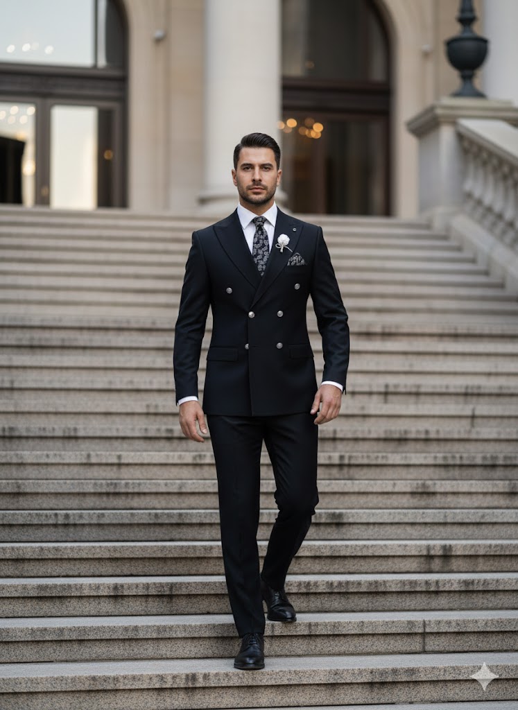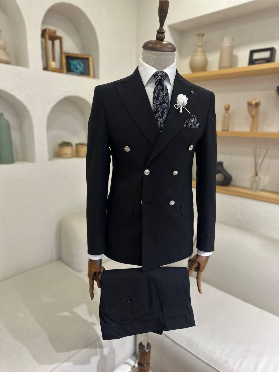 Men’s Black Silver Button Double Breasted Wedding Suit is a masterclass in modern sartorial authority, designed for the gentleman who commands respect in every room. This attention-grabbing piece redefines sophistication with its deep matte black fabric and striking metallic hardware. Furthermore, the suit is expertly tailored with a slim-fit silhouette that provides a sharp, tapered look for a powerful and athletic profile. Consequently, you will exude an air of timeless confidence at weddings, boardrooms, or high-profile evening galas. Additionally, the jacket features bold peak lapels and a classic six-button double-breasted closure that broadens the shoulders and narrows the waist. Moreover, the inclusion of high-shine silver buttons adds a contemporary edge that elevates the traditional black suit into a luxury fashion statement. Finally, this premium ensemble is completed with matching flat-front trousers and curated floral accessories to ensure your formal wardrobe reaches the ultimate standard of elegance.