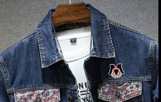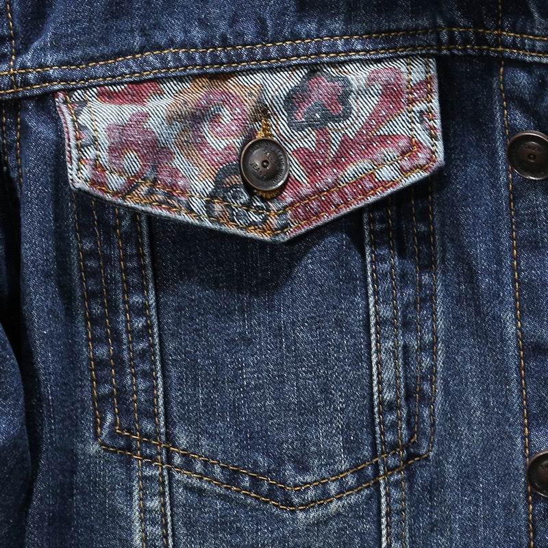 Elevate your everyday layering with this Premium Denim Jacket. The classic dark-wash denim provides a rugged yet versatile foundation for any outfit. This piece features button-flap chest pockets that showcase a distinctive, high-quality patterned lining when unbuttoned, adding a unique touch of style. Button closures secure the front and cuffs. Hip pockets offer convenient storage. A decorative stitched patch adorns the chest. Complete your look; experience high quality craftsmanship.