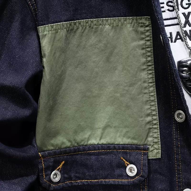 Reimagine classic style with this Color Block Denim Jacket. The dark-wash denim anchors the look, while the prominent olive green panel across the chest injects a modern, utilitarian contrast. Durable construction ensures long-lasting wear. Large patch pockets on the chest and waist provide functional storage. Button closures secure the front and cuffs. Layer effortlessly; choose high-quality, distinctive style.