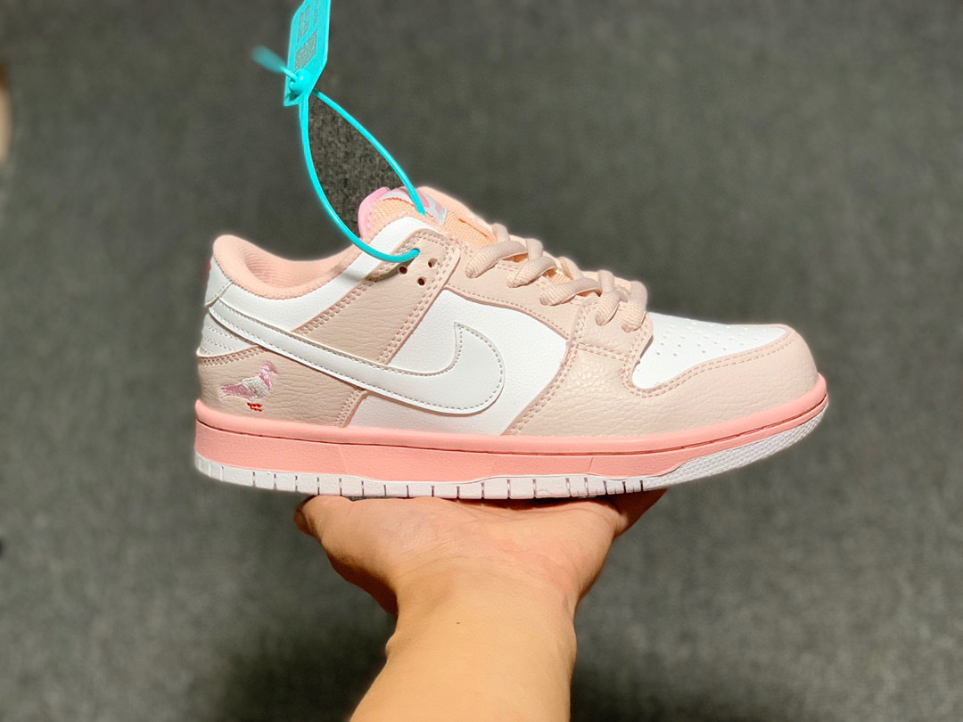 Nike Pink/White Pigeon SB Dunk Low showcases a sophisticated and soft color palette ideal for modern urban fashion. The upper is meticulously crafted from premium tumbled leather in a soft pink, contrasted by a clean white base and signature Swoosh. A detailed pigeon logo is expertly embroidered on the heel, paying tribute to iconic street culture. The low-top design features a thick, cushioned tongue and a vibrant pink midsole for maximum impact protection. With its classic rubber outsole and reinforced stitching, this sneaker combines high-end durability with a unique, eye-catching aesthetic for any unisex wardrobe.