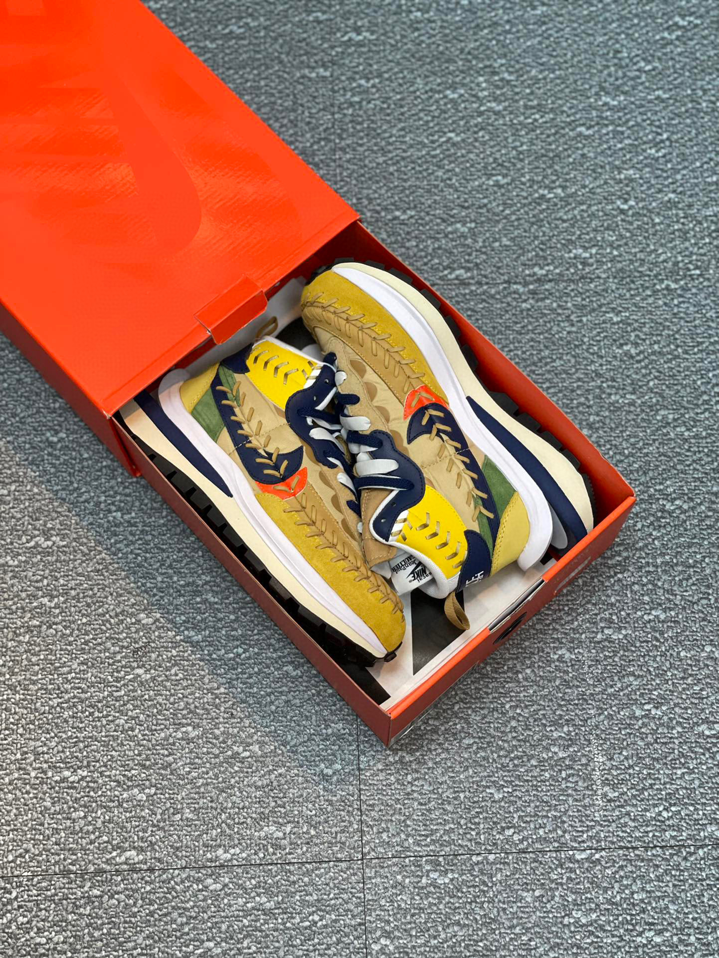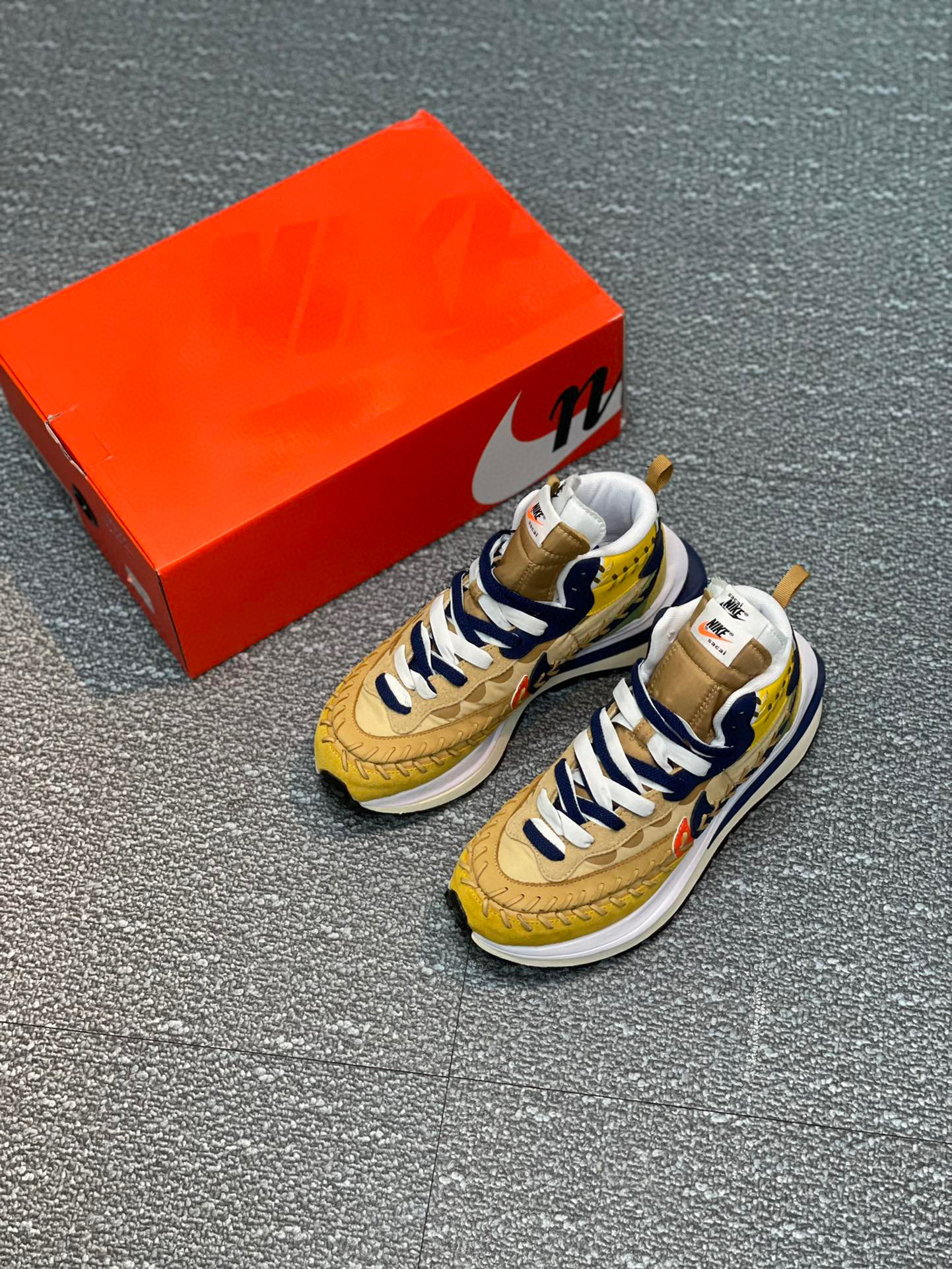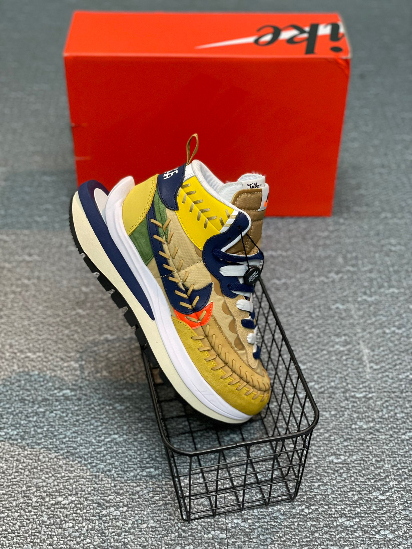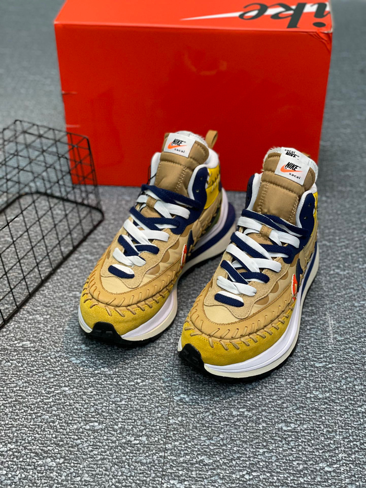 Nike Sesame Yellow VaporWaffle Shoes represent a masterful blend of high-fashion artistry and technical athletic design. This sneaker is the result of a triple-threat collaboration that pushes the boundaries of traditional footwear silhouettes. Furthermore, the striking “Sesame” colorway is accented by vibrant yellow suede and deep navy leather hits, creating a sophisticated palette that stands out in any premium collection. The upper is meticulously crafted from heavy-duty nylon and premium suede overlays, providing both a luxurious feel and long-lasting durability for daily use. Additionally, the most captivating feature is the thick, hand-woven baseball stitching that wraps around the mudguard, adding a unique artisanal touch rarely seen in sport sneakers.