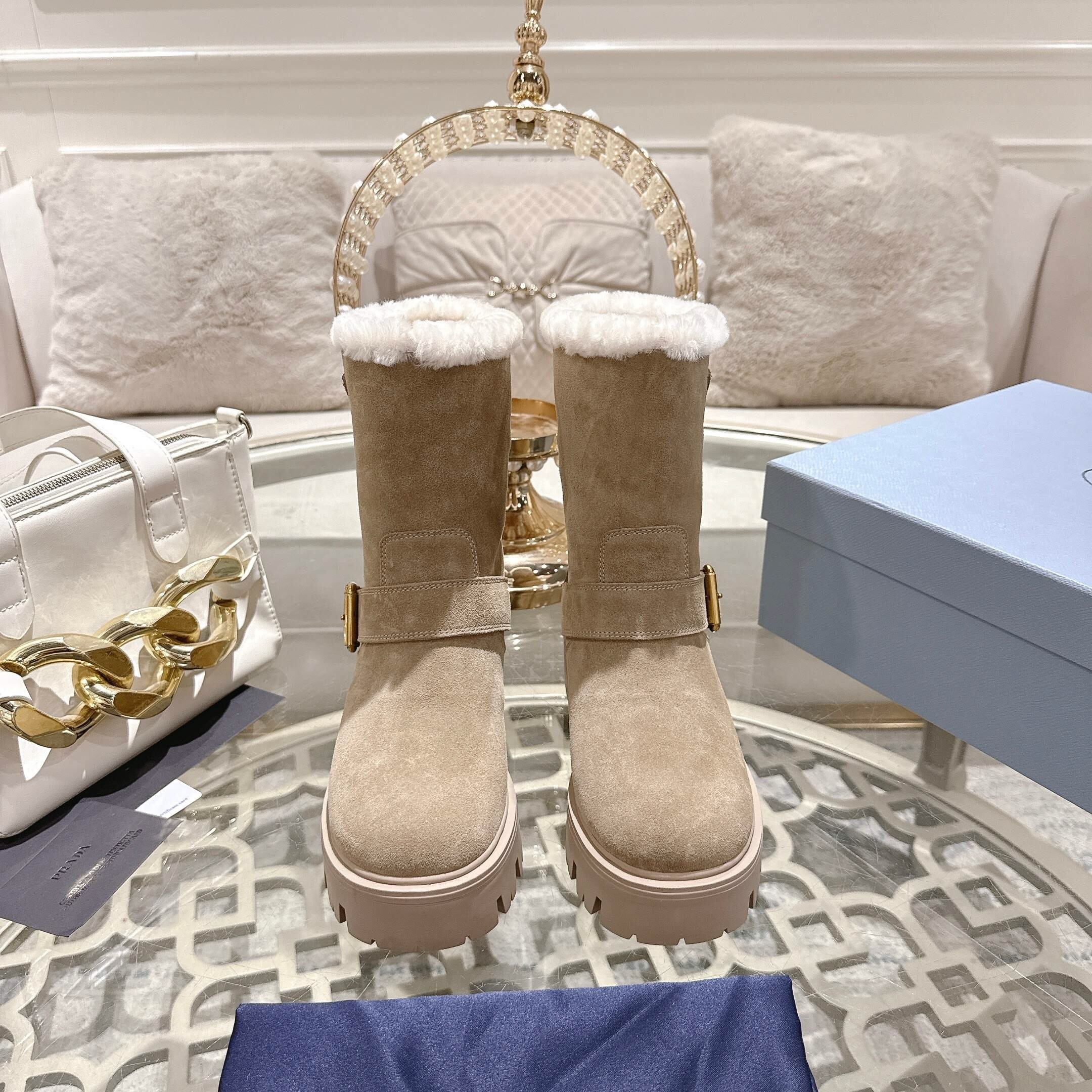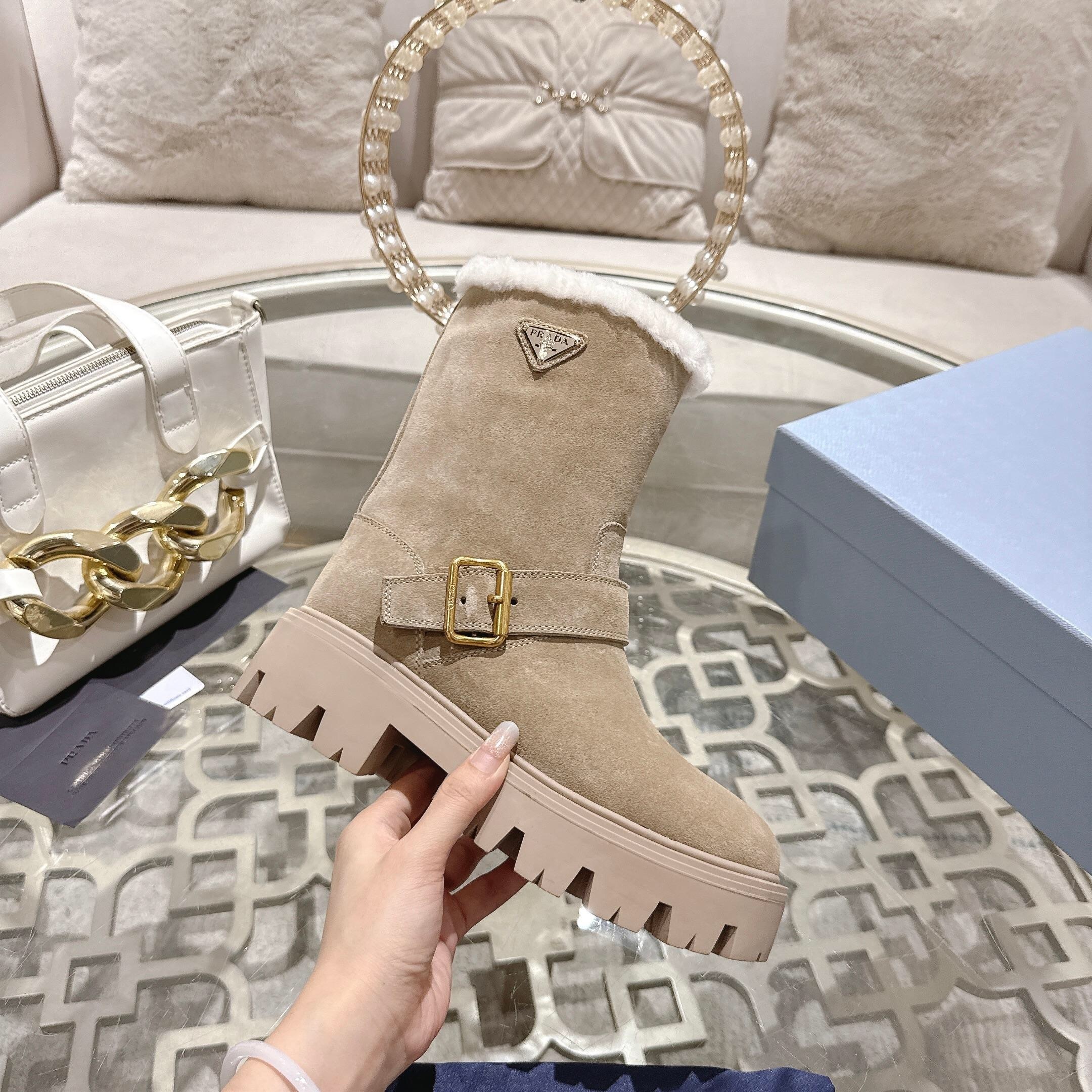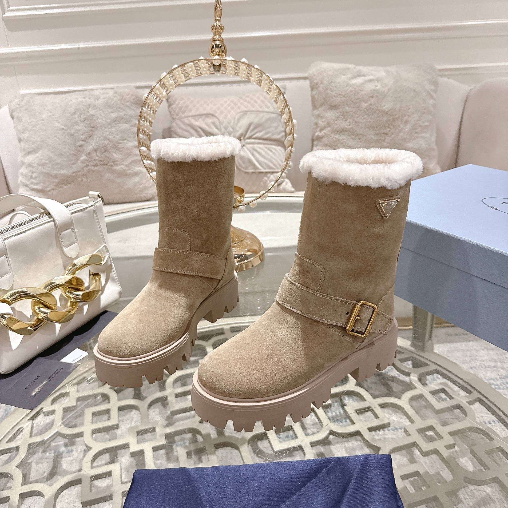 Prada Beige Suede Boot is a masterclass in combining high-fashion aesthetics with the rugged practicality needed for winter weather. This stunning mid-calf boot is constructed from premium Italian-style beige suede that offers a soft, luxurious touch while maintaining impressive structural durability. Furthermore, the design is highlighted by a sophisticated gold-toned buckle strap and the iconic triangular logo plaque, instantly signaling luxury to any observer. Consequently, you can transition seamlessly from a mountain lodge to a high-end city dinner without needing to change your footwear.