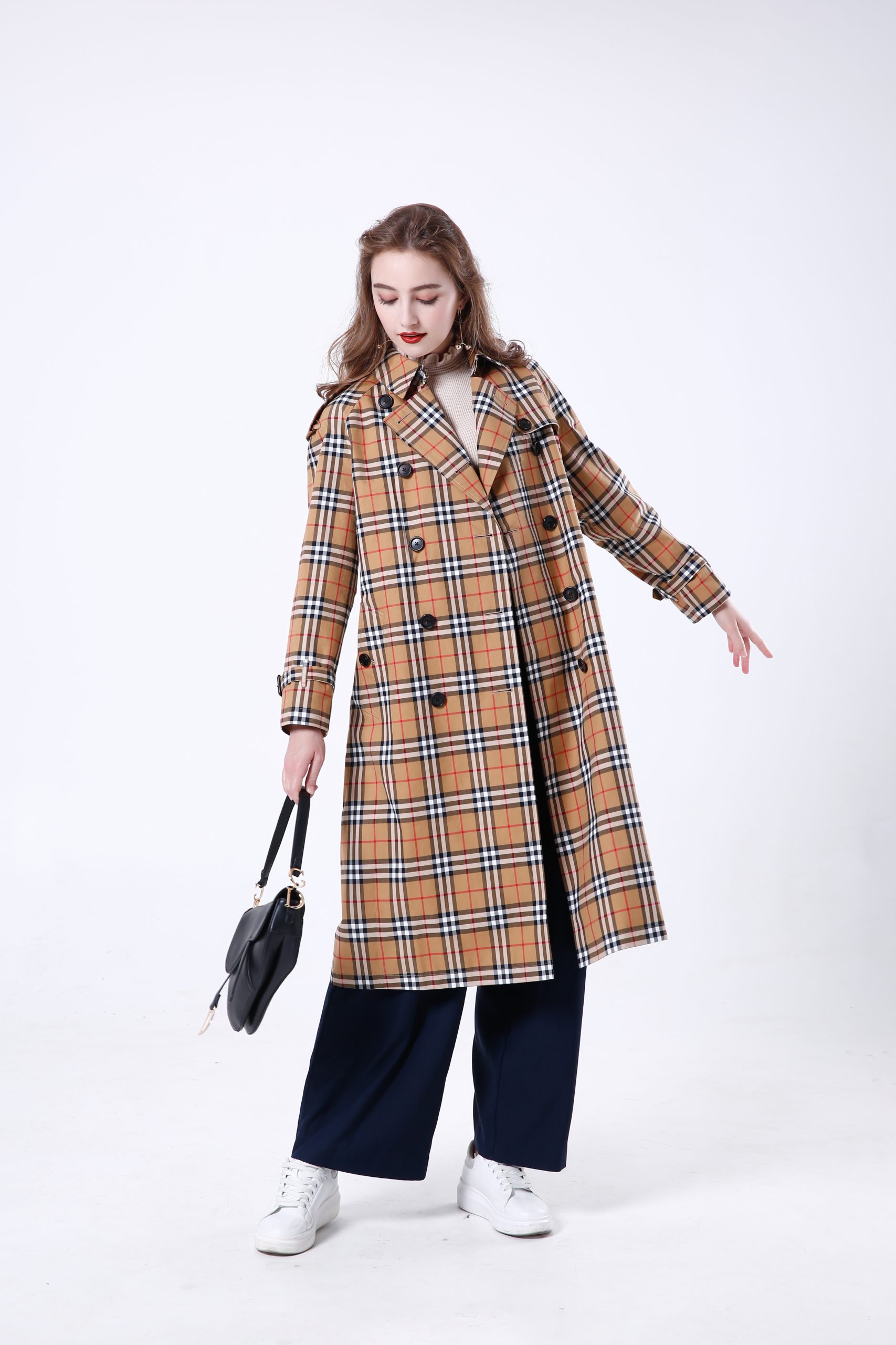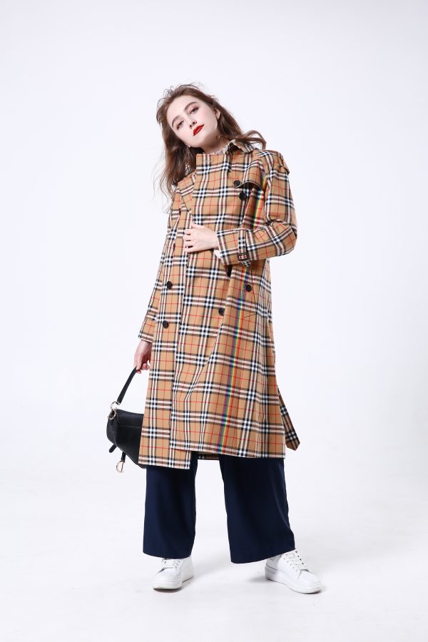 Rainbow Stripe Checkered Cotton Trench Coat (Style No.: BS-J1023) is a sophisticated statement piece that bridges the gap between classic British tailoring and avant-garde design. The high-quality 100% cotton fabric features a complex checkered base, beautifully disrupted by vertical rainbow stripes that add a playful yet high-fashion energy. The raglan sleeve construction ensures a fluid, comfortable drape, allowing for effortless layering while maintaining a sharp, structured shoulder line.