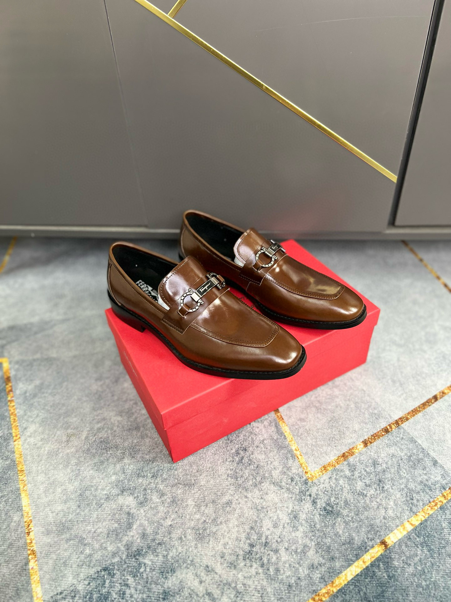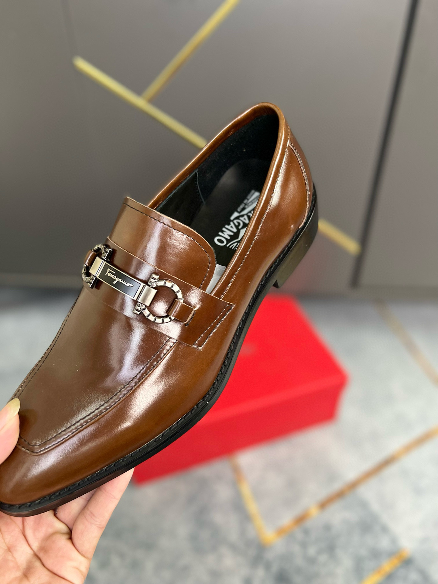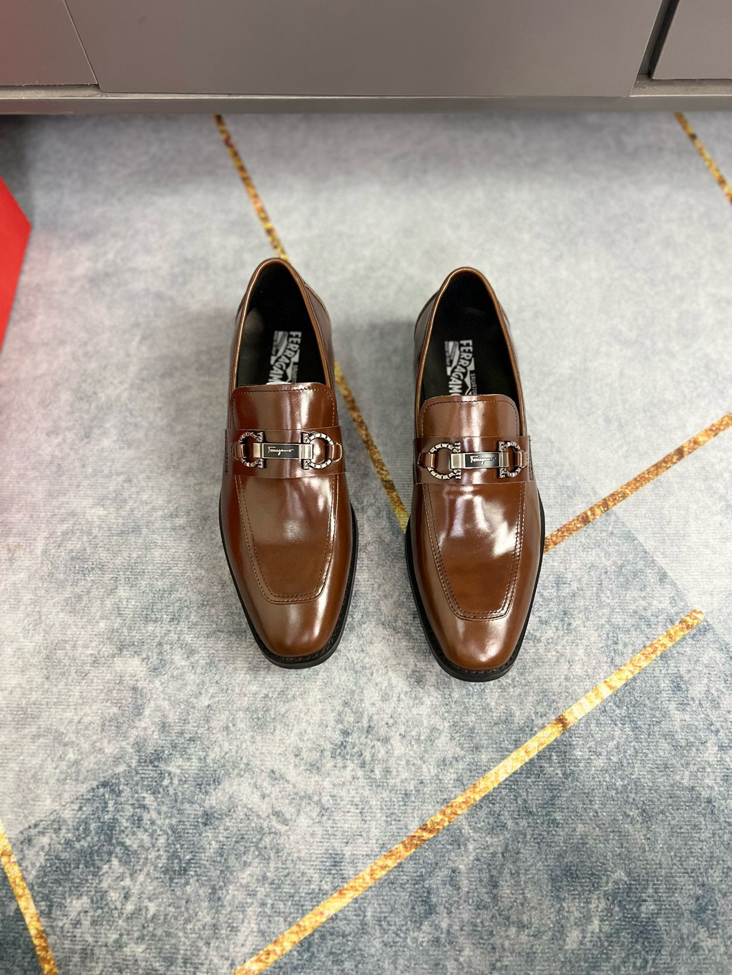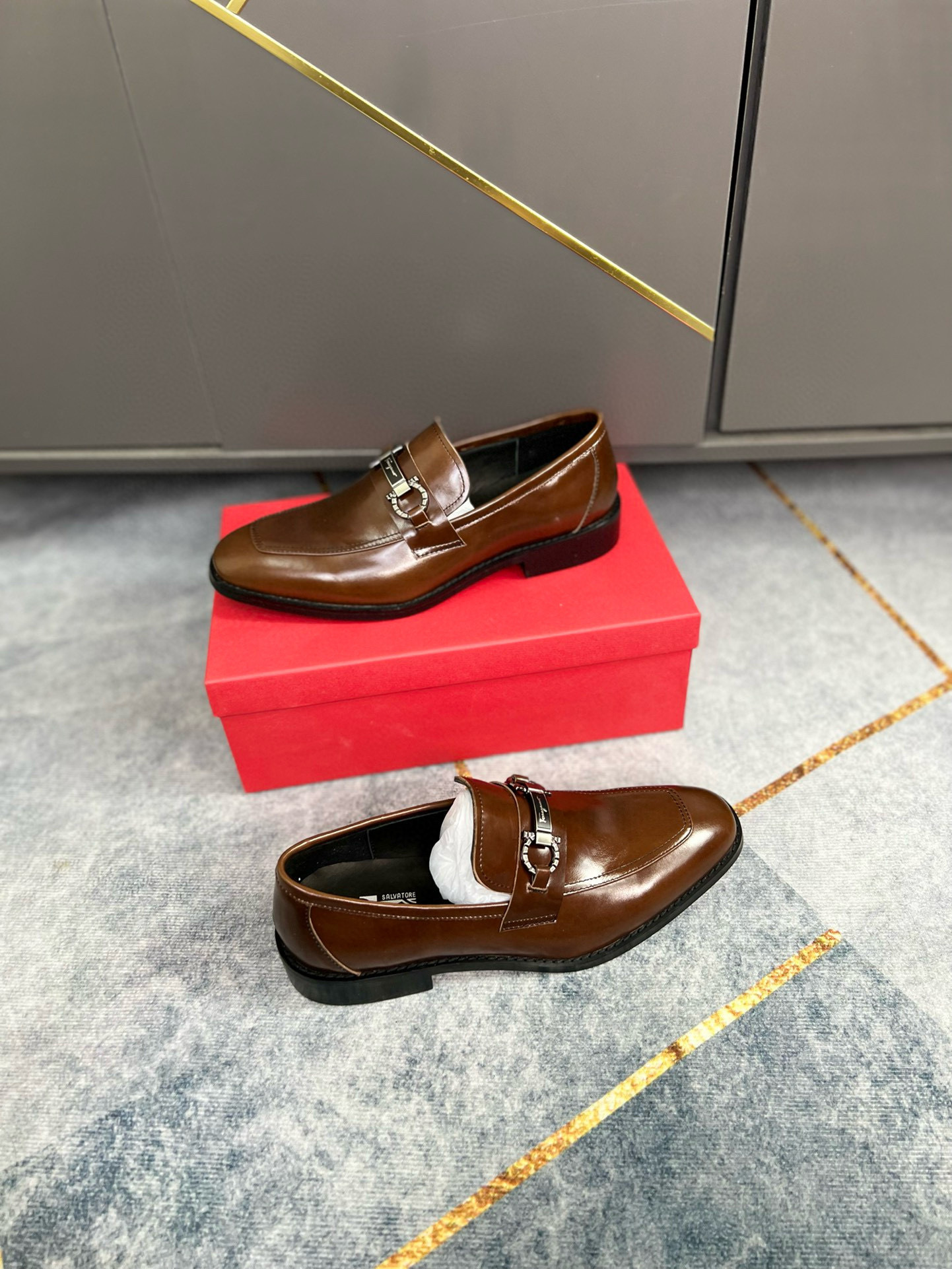 Unique Features: The focal point of this masterpiece is the high-polish silver-toned Gancini bit hardware. This signature element is securely fastened across the saddle, providing a brilliant contrast to the warm brown leather. The architectural square toe and the refined, low-profile silhouette ensure this shoe stands out in any setting, from the boardroom to an evening gala.