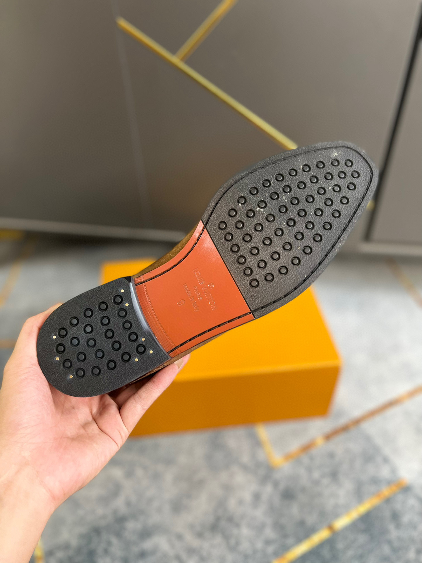 A high-impact, modern Oxford defined by its contrast and complexity. The shoe features a sharp Cap-Toe crafted from Patent Leather finished with a unique brown patent . This is dramatically offset by the Black Damier Canvas on the quarters. The silhouette is anchored by a thick, rugged rubber sole for contemporary appeal. The closed lacing system ensures a sleek, formal fit despite the bold materials.