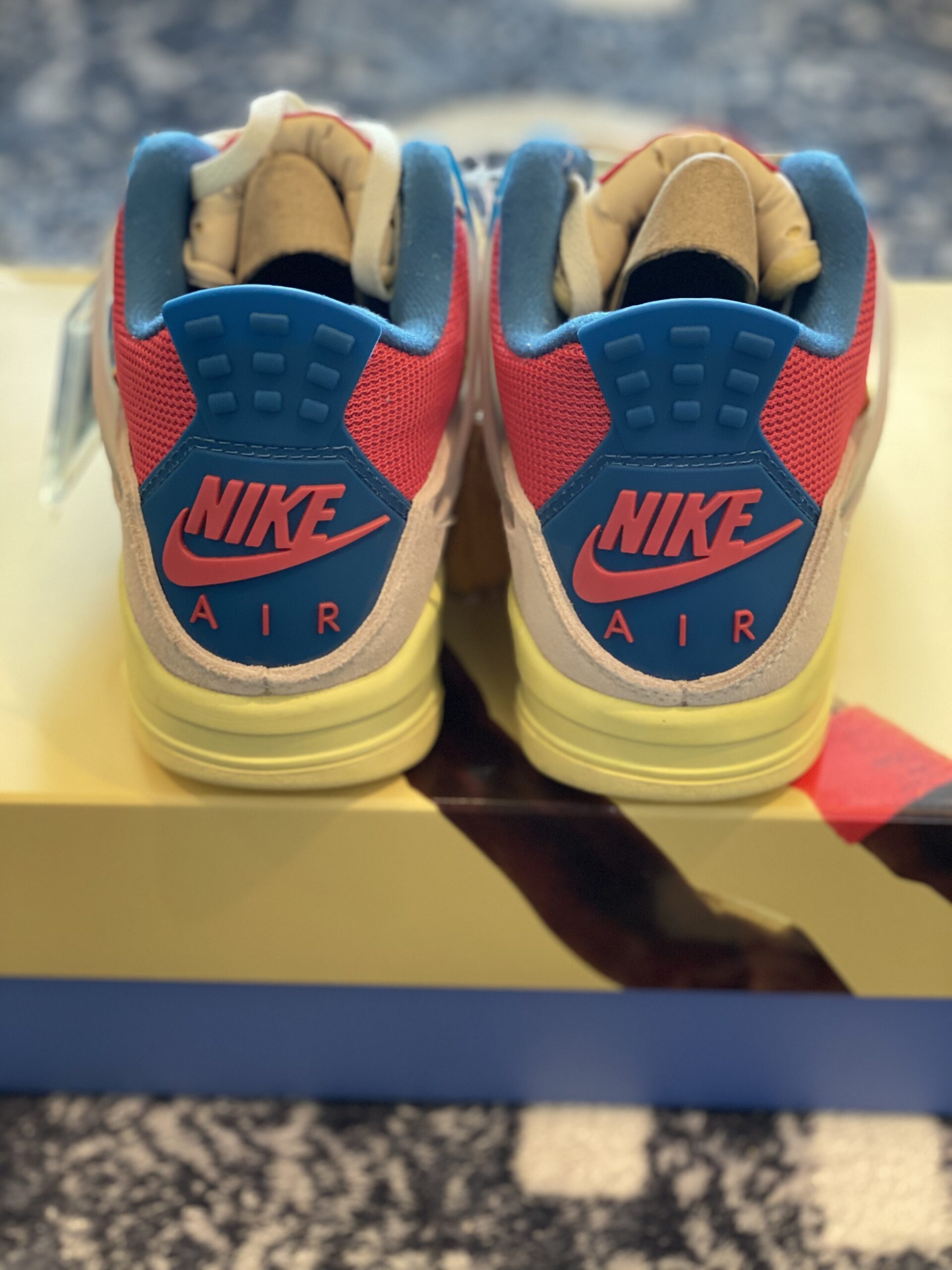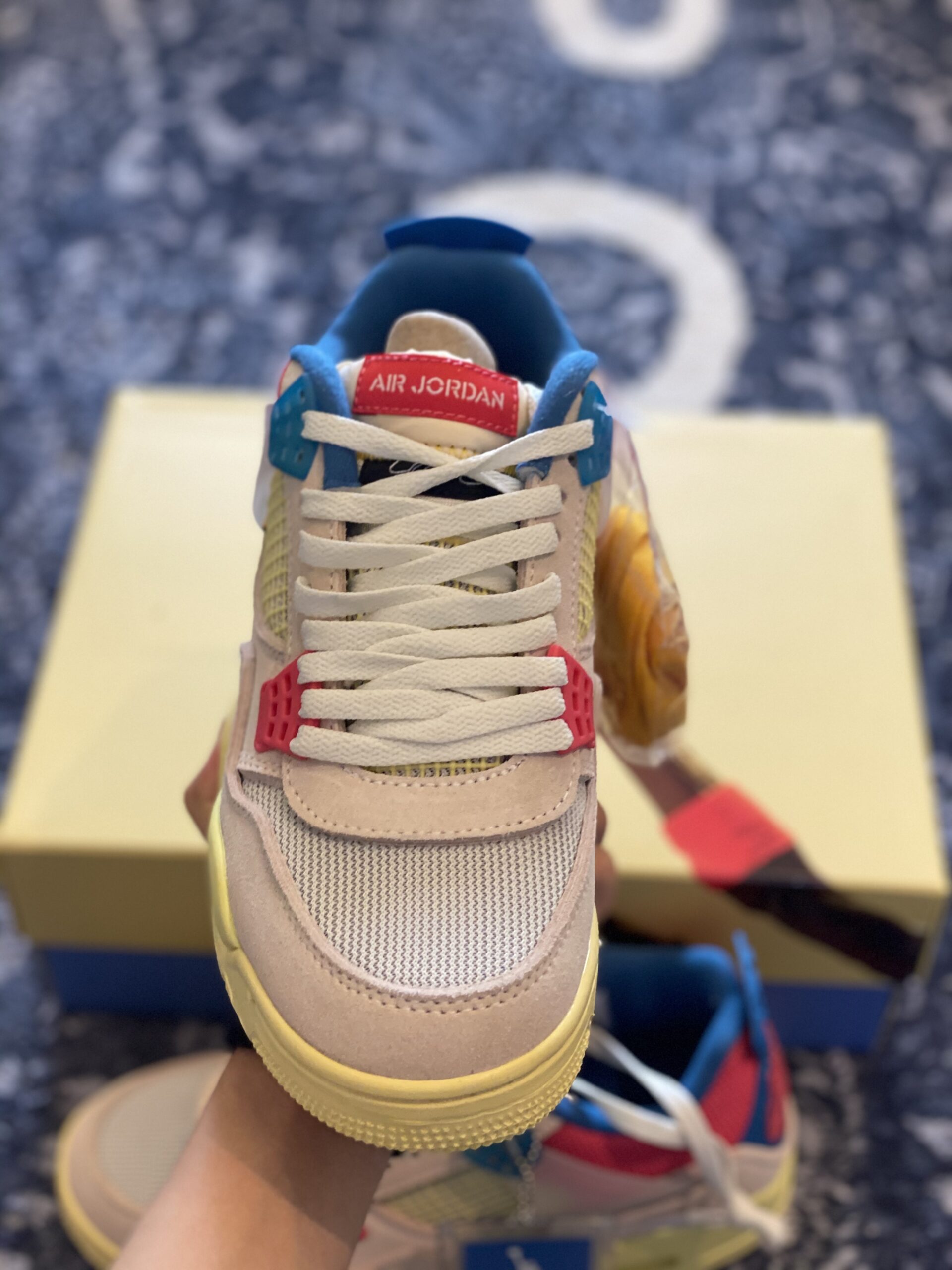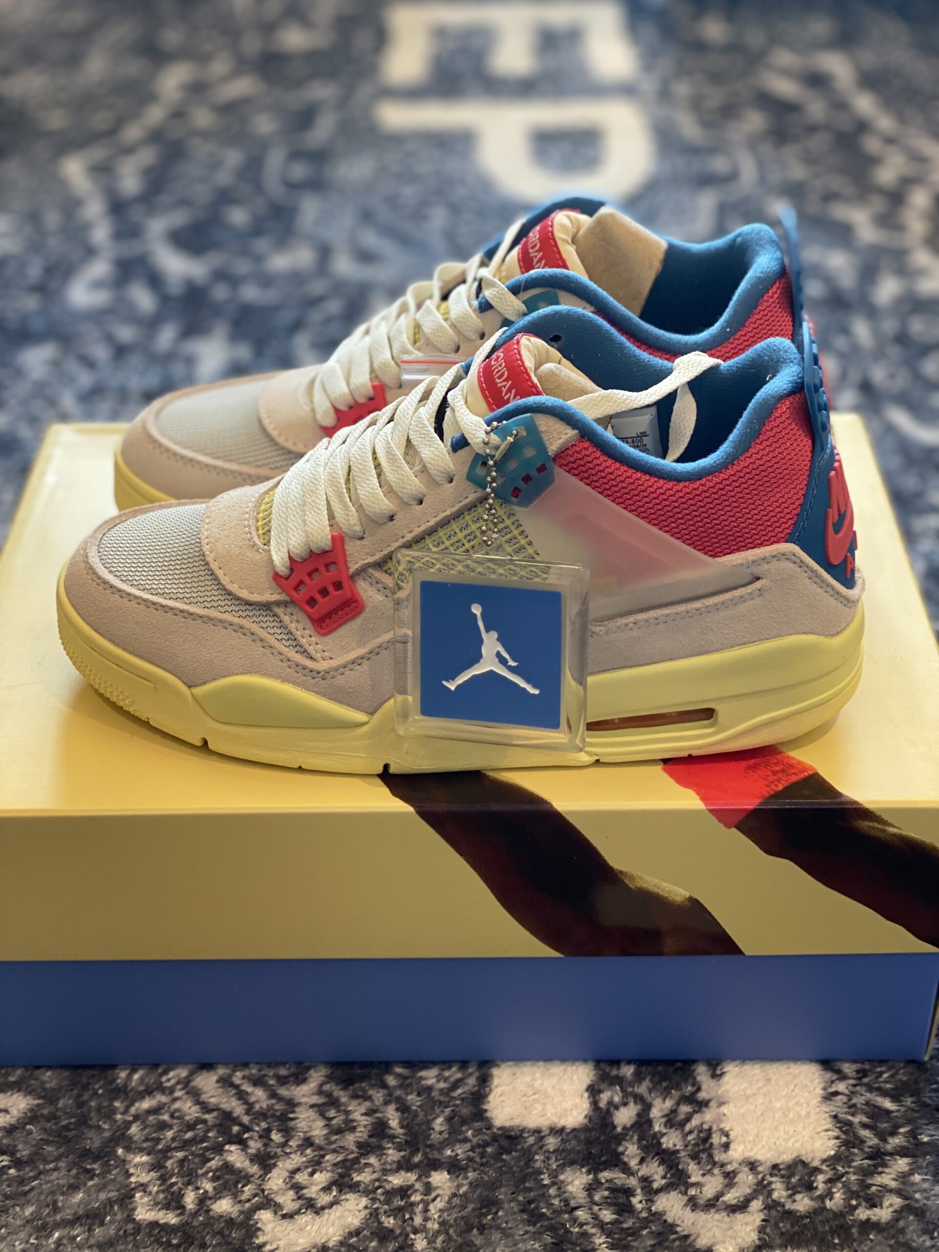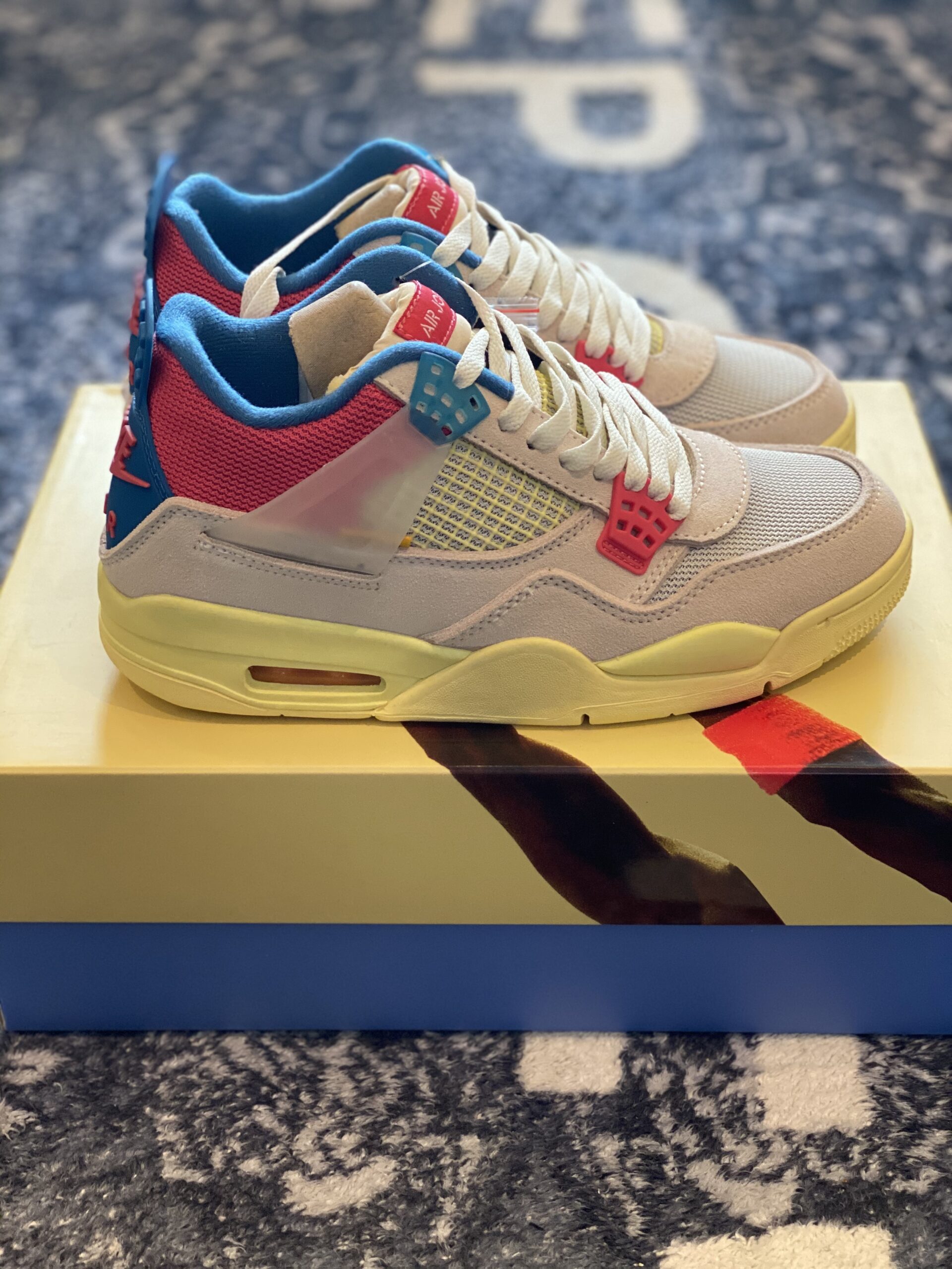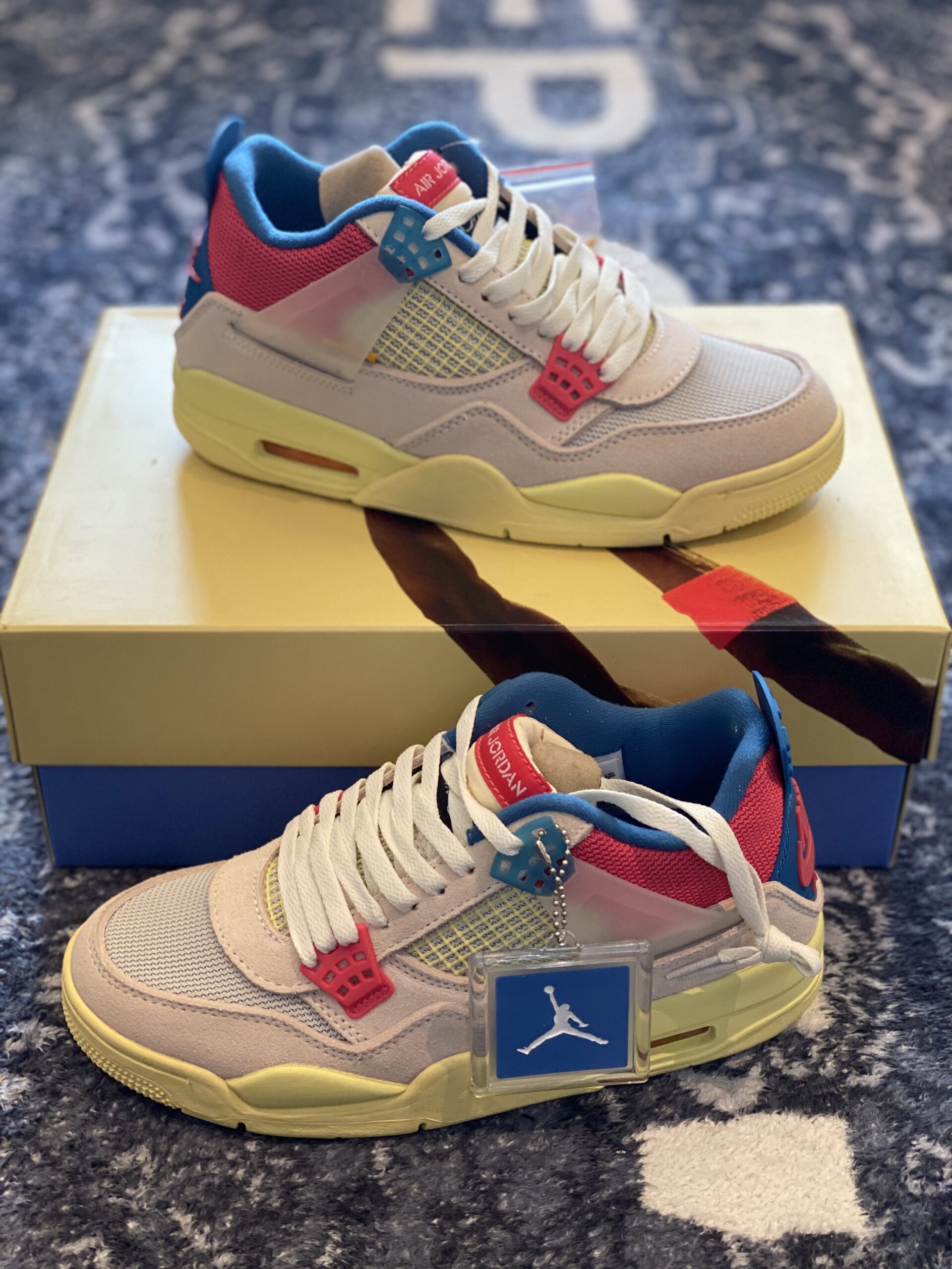 Union LA x Air Jordan 4 Retro Guava Ice stands as a bold and innovative evolution of the classic 1989 silhouette, born from a high-profile collaboration between Union Los Angeles and Jordan Brand. The sneaker is defined by its soft Guava Ice pink suede upper, which is expertly paired with breathable mesh panels on the toe box and collar for a vintage, multi-textured aesthetic. A hallmark feature of this design is the unique foldable nylon tongue, originally stitched down to reflect Chris Gibbs’ personal styling preference, though it can be easily unstitched to reveal the full “Air Jordan” branding. Disclaimer: These products are not original products but were inspired by the original product brand. The color palette is further elevated by vibrant pops of Light Fusion Red and Brigade Blue, while semi-translucent TPU wings provide structural support inspired by Tinker Hatfield’s original sketches. A signature yellow “UN/LA” tag is prominently affixed to the lateral quarter panel, and the vintage-style yellowed midsole houses a visible Max Air unit in the heel for classic cushioning. This inspired version utilizes premium materials to capture the “West Coast attitude” and intricate detailing that made the 2020 release a standout in modern sneaker culture. The combination of heritage-inspired mesh and high-grade synthetic suede ensures both durability and a striking visual impact for any collector.