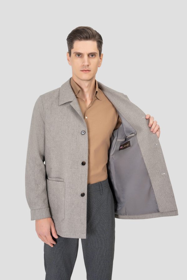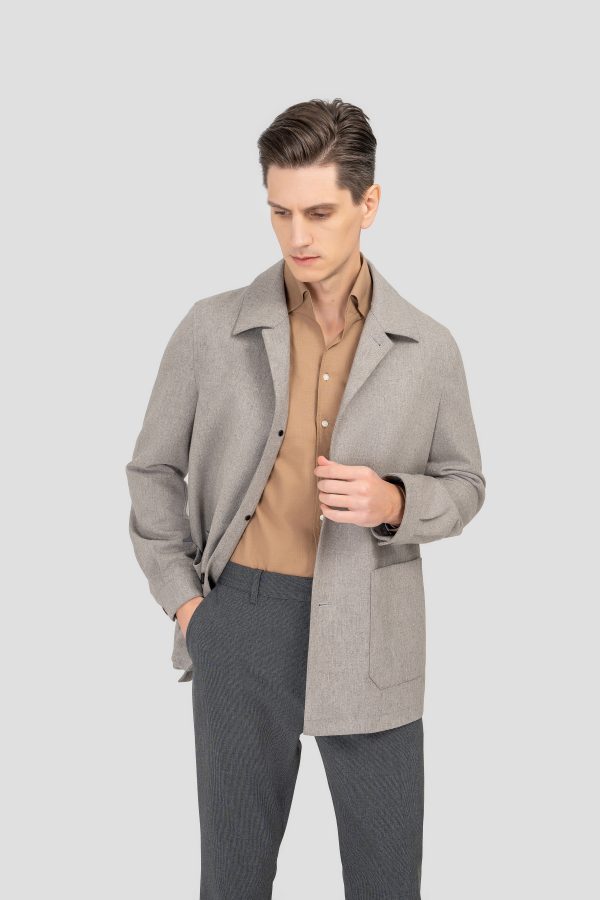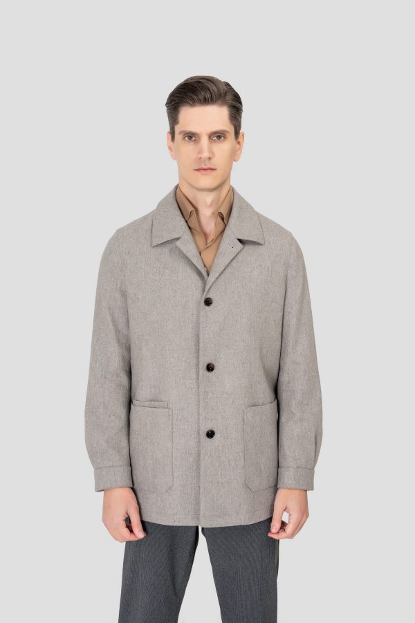 The design is characterized by its unique pocket configuration and minimalist architecture. It features three prominent patch pockets—two at the hip and one at the chest—which lend a modern, “workwear-inspired” edge to a traditional tailored coat. The single-breasted front is secured with genuine horn buttons, mirrored by functional buttoned cuffs for a cohesive look. Unlike traditional overcoats, this style features a “no vent” back design, creating a clean, uninterrupted drape that maximizes warmth and maintains a structured profile. Every element, from the turn-down collar to the full interior lining, is meticulously executed to provide a premium look and feel.