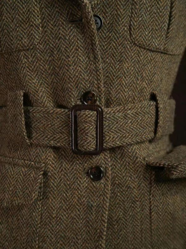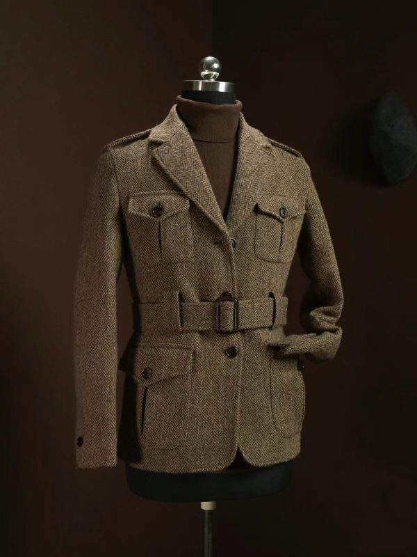 The architecture of the jacket is defined by its balanced proportions and military-inspired details. It features four prominent patch pockets on the front, offering both practical storage and a structured, symmetrical aesthetic. The waist is cinched by a coordinating wool belt to create a flattering, feminine silhouette, while the shoulder epaulets add a touch of authoritative, heritage-inspired style. Additional craftsmanship is evident in the functional one-button cuffs and the authentic horn buttons used throughout. With a clean “no vent” back and a sharp notch lapel, this jacket is a versatile staple for the modern woman who appreciates a blend of adventure and elegance.